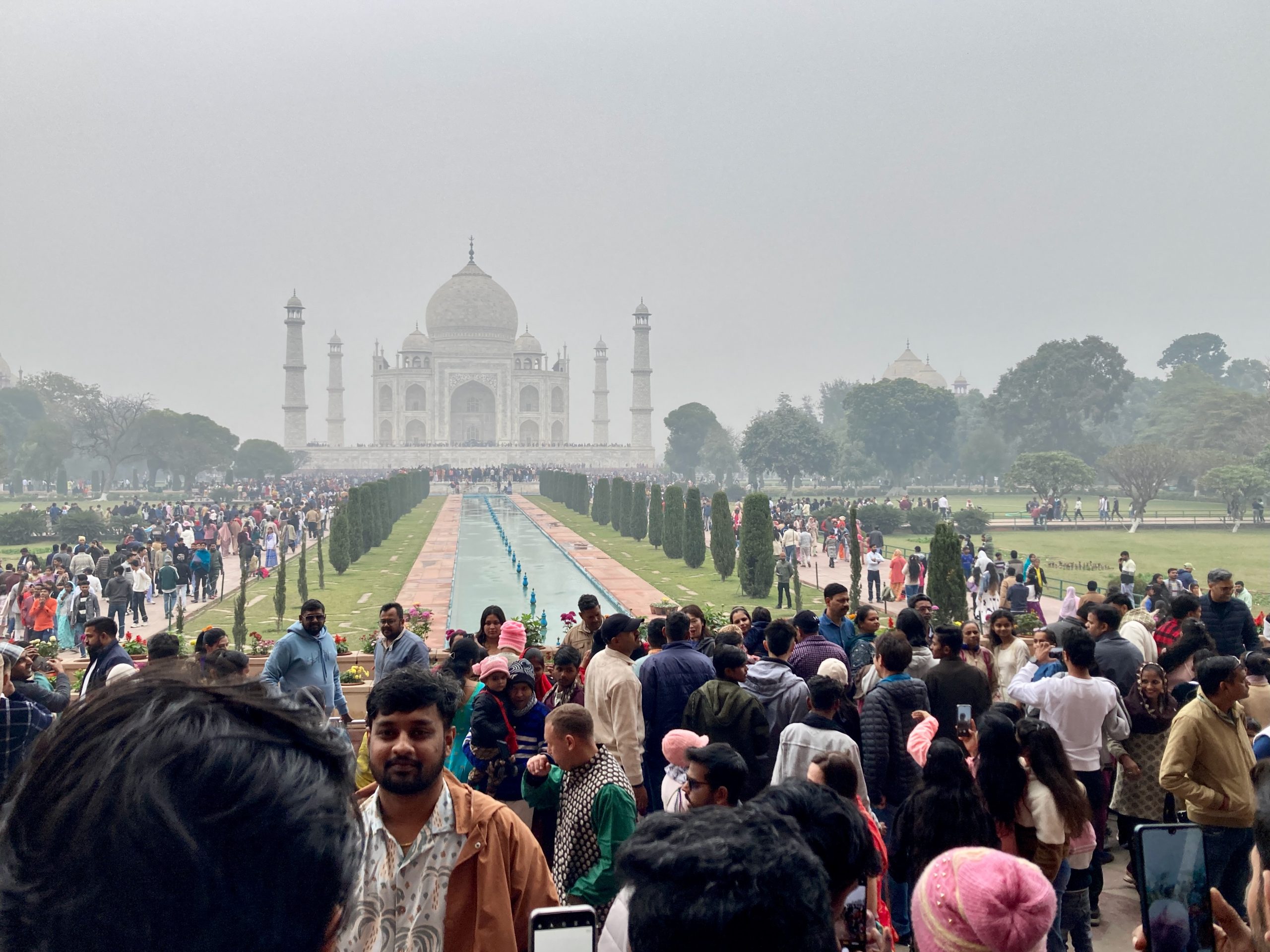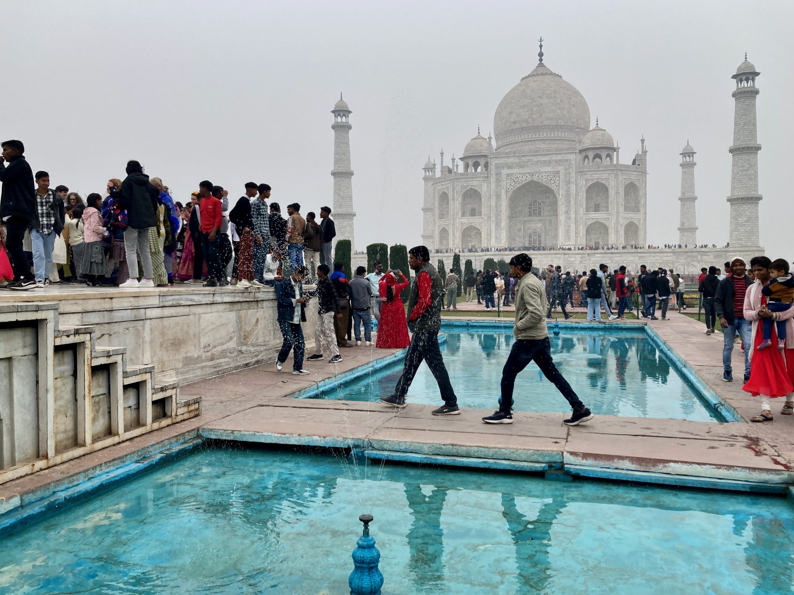 Weil – für den ersten Tag im neuen Jahr sollte es dann ein Highlight geben: das Taj Mahal. Ich war beim letzten Besuch mit den Menschenmassen schon ernüchtert gewesen und das Gebäude hatte sich mit seinem eigentlichen Zauber mir entzogen. Aber die anderen Reisenden damals waren trotzdem beeindruckt. Diesmal verfehlte es auch einige aus der Reisegruppe. Es waren nochmal mehr Menschen unterwegs und ein ganz schönes Gedrängel überall. Außerdem war der Himmel grau und gerade als wir wieder in den Bus stiegen kamen auch einige Regentropfen runter.