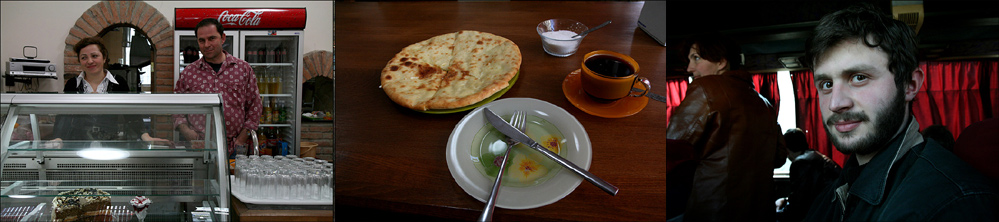 Später, mit vollem Khatchapuri-Bauch und ein paar Bildern im Kasten mache ich mich auf den Weg nach Tbilisi. Es fährt ein großer Bus und ich sitze neben Lado, einem 18jährigen. Er spricht ca. 5 Worte englisch und deutsch, ich spreche 1 Wort georgisch. Er sieht meine Kamera und zeigt mir dann auf seiner kleinen digitalen Bilder, die er gemacht hat. Ich bekomme Ikonen zu sehen, die er gemalt hat und Bleistiftzeichnungen. Er ist Kunststudent. Er hat eine Schwester Salome, die kann ein paar mehr deutsche Worte. Er schreibt ihr eine SMS auf georgisch, sie schreibt die deutsche Übersetzung zurück und er zeigt sie mir. Er kommt aus Kutaisi und war dort über das Wochenende. Er hat ein Bild gemalt, welches er dabei hat. Er verkauft einige seiner Bilder. Bei einer Rast kauft er mir ein kleines getöpfertes georgisches Trinkgefäß. Für die Erinnerung. Und läßt Salome übersetzen, dass er genügend Geld hat. Ich biete ihm von meinem Snickers an. Er lehnt ab. Ich verstehe es nicht. Salome muss wieder übersetzen: Er fastet gerade und isst keine Fleisch- und Milchprodukte. Ich mache ein Foto von ihm. Dann habe ich eine zweite Erinnerung.