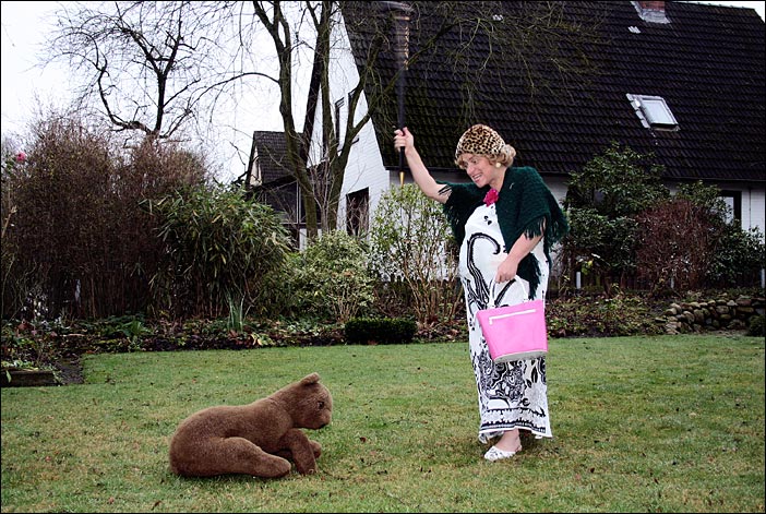 Aber da, auf einmal, oh Hülfe, oh Schreck, bricht eine Bärin zwischen den Einfamilienhäusern hervor und kommt auf Frollein Maria zugaloppiert. Diese schwingt vorsichtshalber schnell den Stützstock.