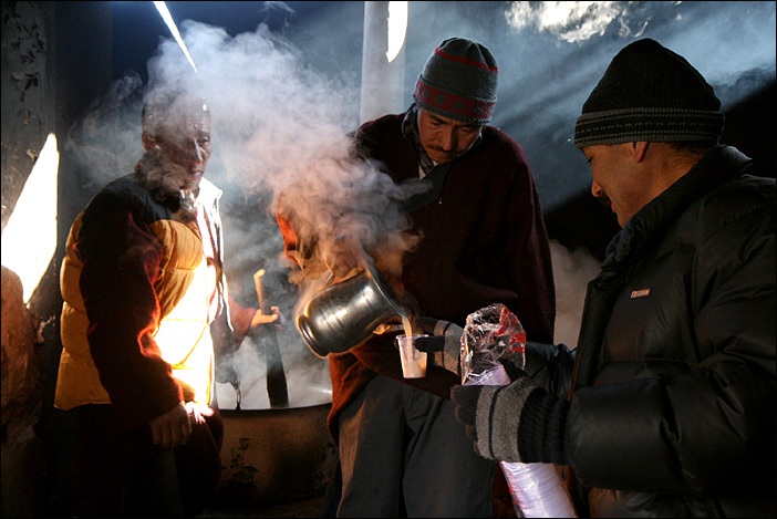 Leh 2008. Hot tea sends steam clouds into the cold air, dancing and curling with the sun-rays into a unity.