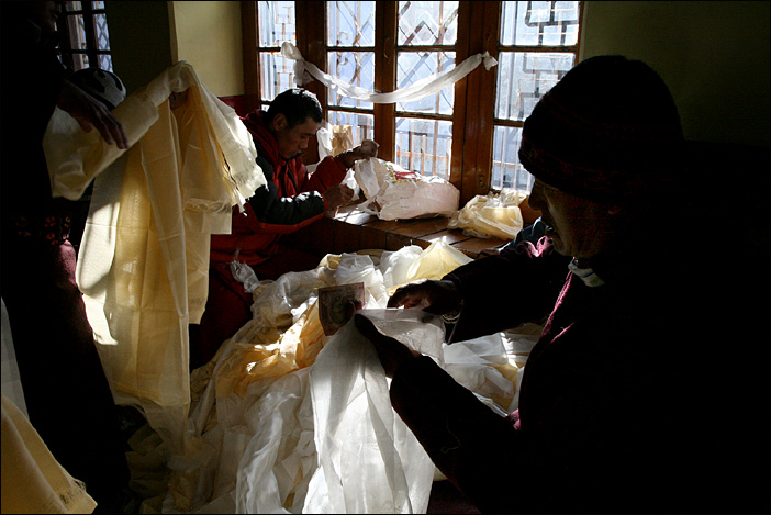 Leh 2008. Katags are folded and unfolded for respect and wishes.