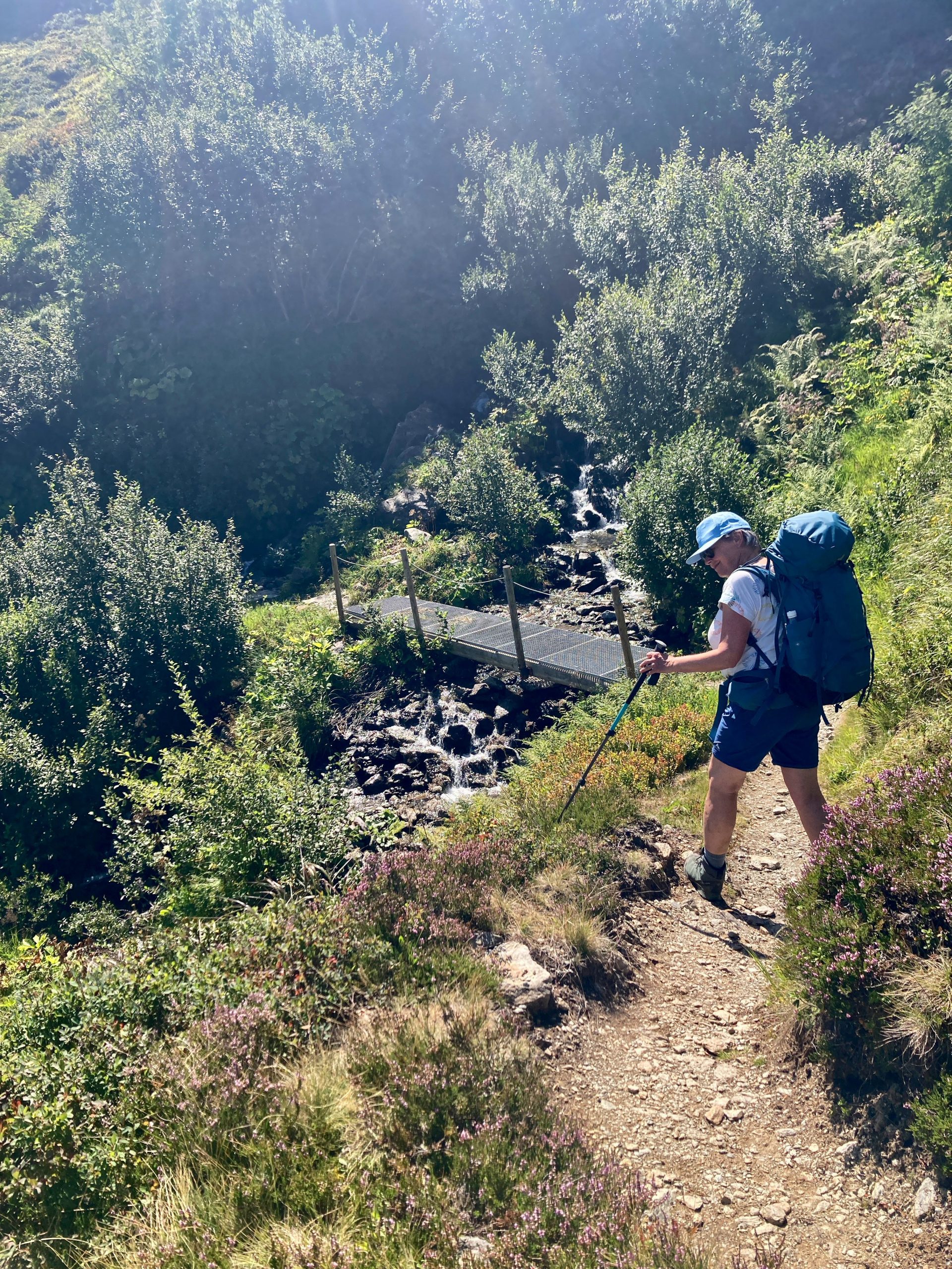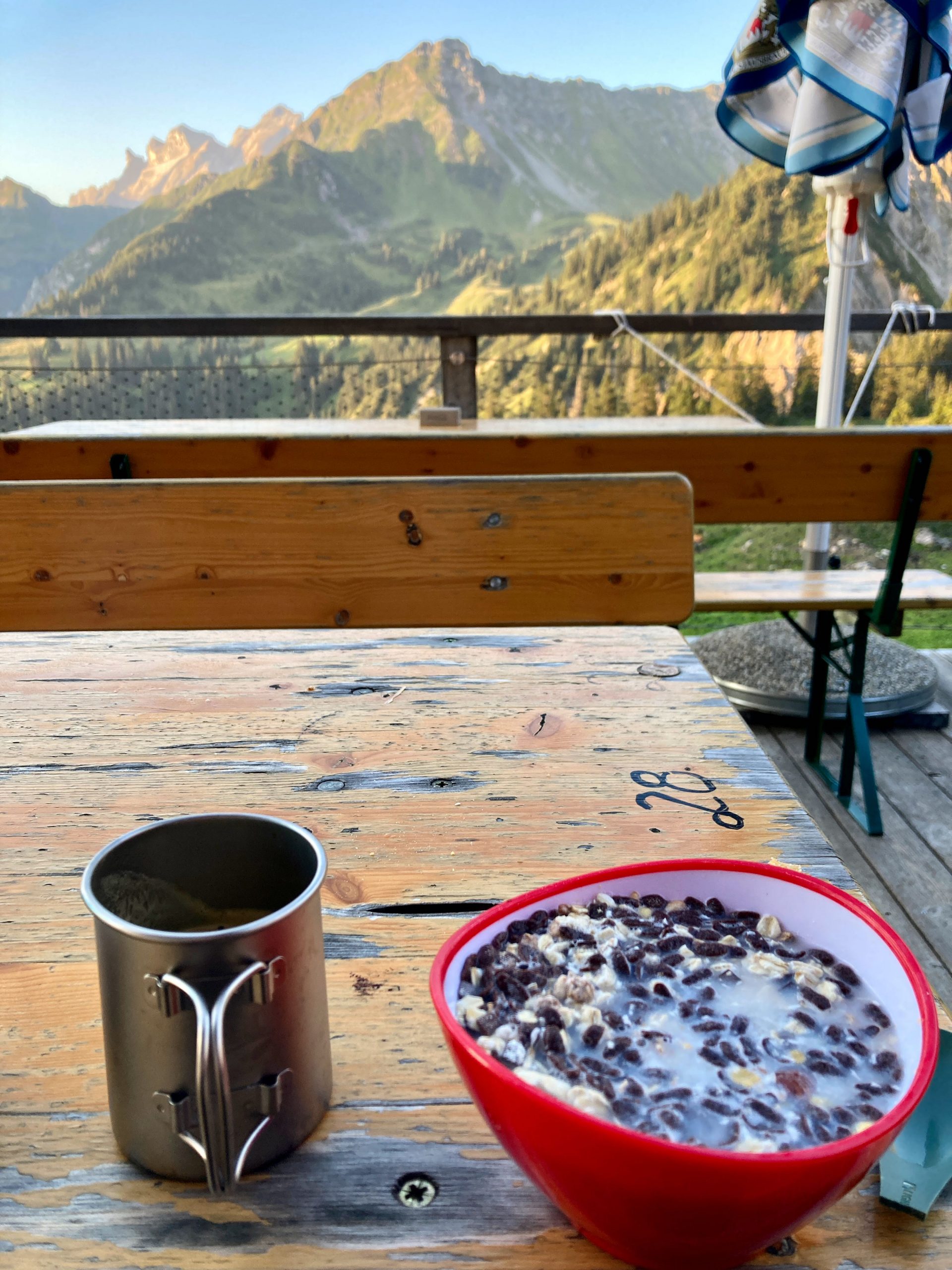 Das ist Mapys Zusammenfassung unseres Wandertages. Er begann mit dem Morgen. Ich hatte diesmal für jeden Morgen mein Müsli mit Nescafe (und Esbit-Kocher) dabei und war oberfroh, zeitlich unabhängig draußen sitzen zu können. Es war nämlich immer gesteckt voll beim Frühstück und ich mag so gerne viel Ruhe und draußen sein. Allerdings musste ich mich immer ranhalten, es wurde auch auf Terrassen immer voller.