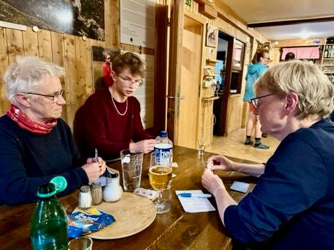 Den Abend verbrachten wir mit einem tschechischen Trio: Mutter, Sohn und Nichte bildeten ein fröhliches Gespann und begleiteten uns quasi seit der ersten Hütte. Die Nichte ist die mit der Höhenangst. Wir konnten zuerst den Sohn zu einem verwirrenden Kartenspiel überreden und hatten dann noch eine spannende lustige Mensch-Ärger-Dich-Nicht-Runde (die ich gewann!).