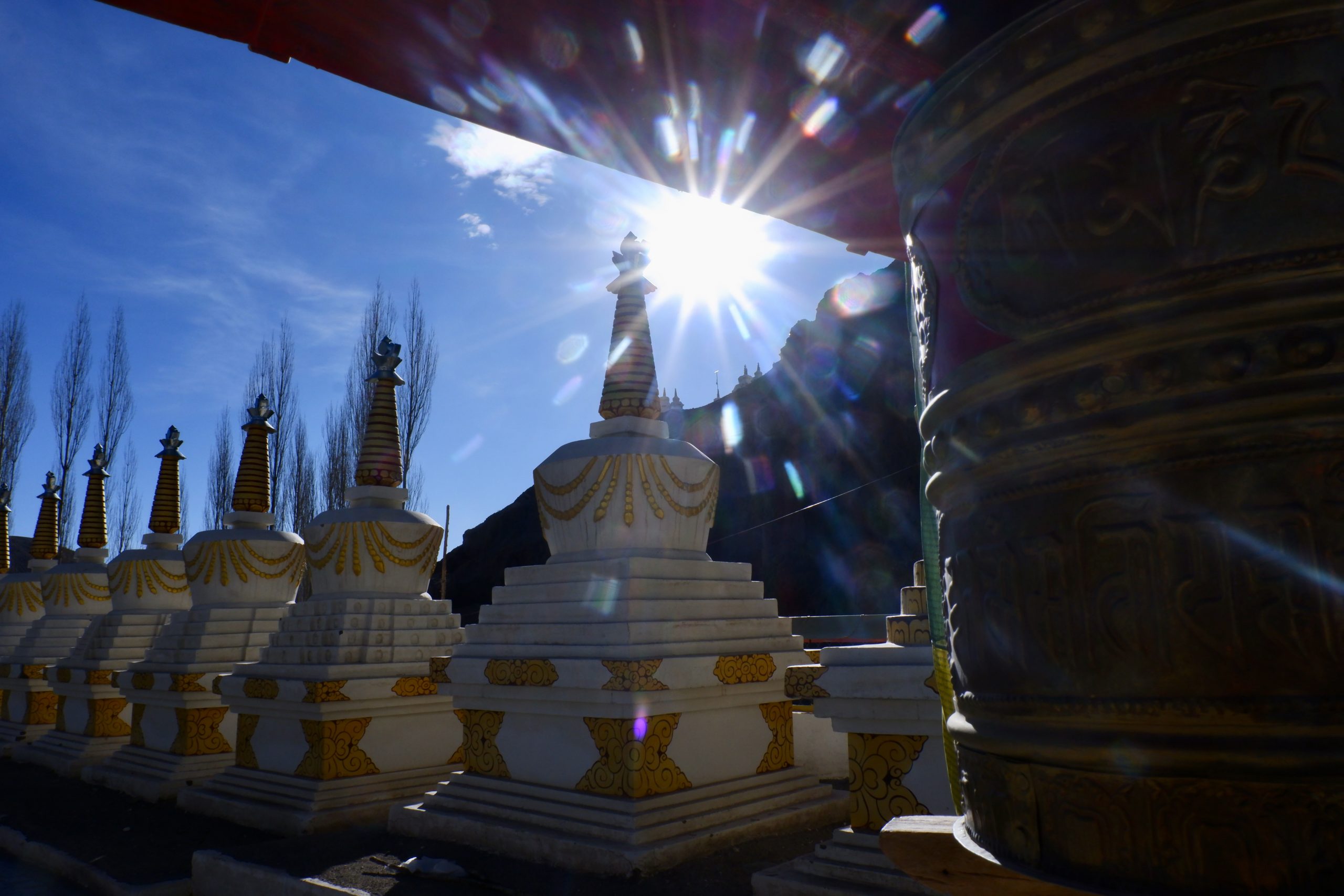 Wir nutzten die Zeit für eine Besichtigung vom Basgo KlostercumexPalast. Was ich gar nicht wusste (oder mir entfallen war): hier hatten 2 Klöster ihre Hände im Spiel. Ein oberer Komplex gehört zum Likir-Kloster (Gelugpa Orden) und es gab keinen Schlüssel, der untere zum Hemis-Kloster (Drukpa Orden) – und den konnten wir besichtigen. Irgendwie hatte ich Basgo nie so wirklich auf dem Schirm als sehenswerte Gebäude. Von innen ist es auch nicht ganz so spannend, aber die Lage und Geschichte sind schon toll.