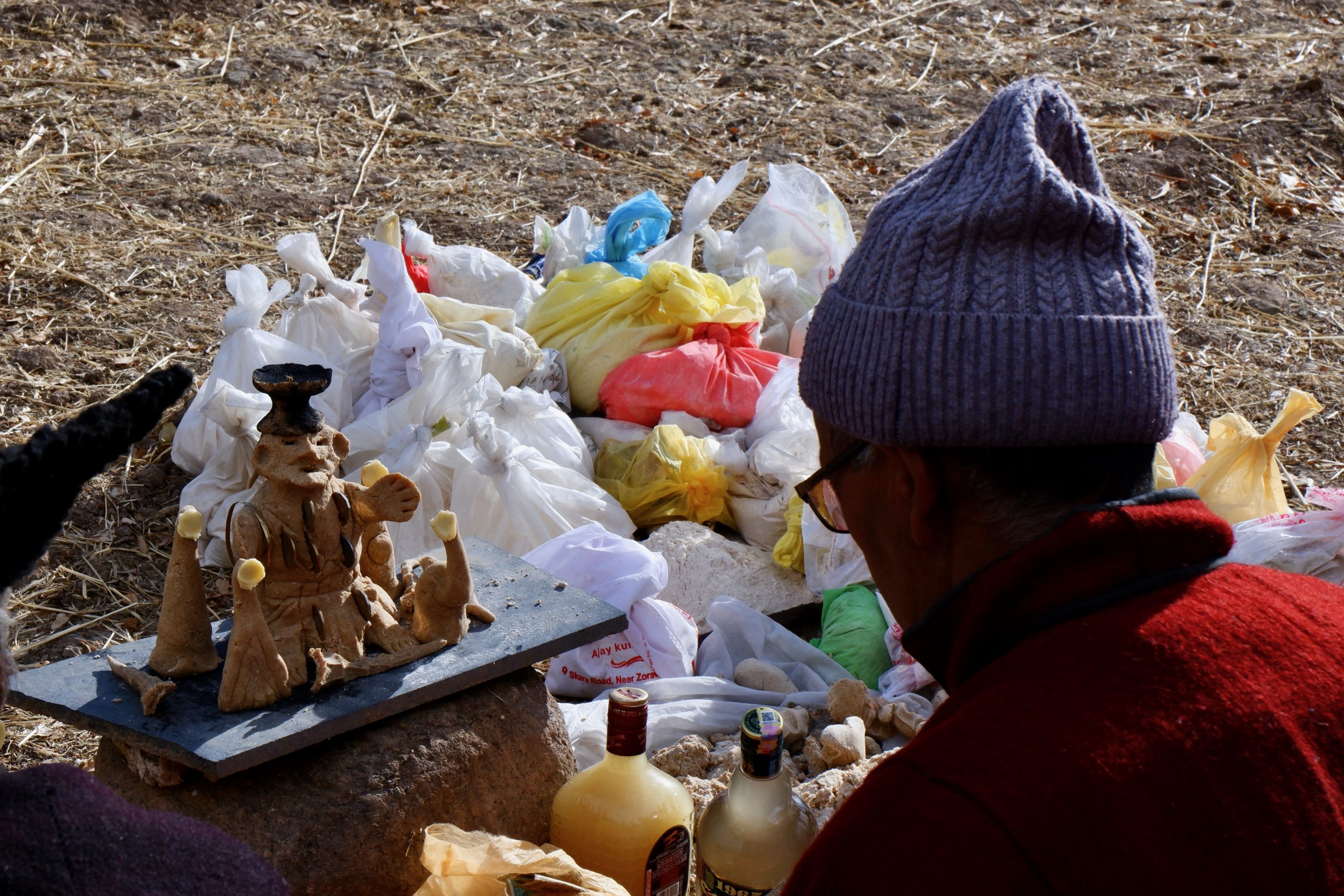 Was mit dem restlichen Tsampa passierte, weiß ich nicht. Und als sie alle fertig waren, ging es holterdipolter. Dabei habe ich längst nicht alles gut mitbekommen und/oder auf Fotos festgehalten. Es gibt auch beim Ritual in Basgo Appu und Appi, aber die sind nicht so prominent wie in Chuchot. Aber auch sie versuchen Geld einzutreiben, allerdings eher von den durchfahrenden Autos. Dabei sind auch die Wollkappenträger tätig.