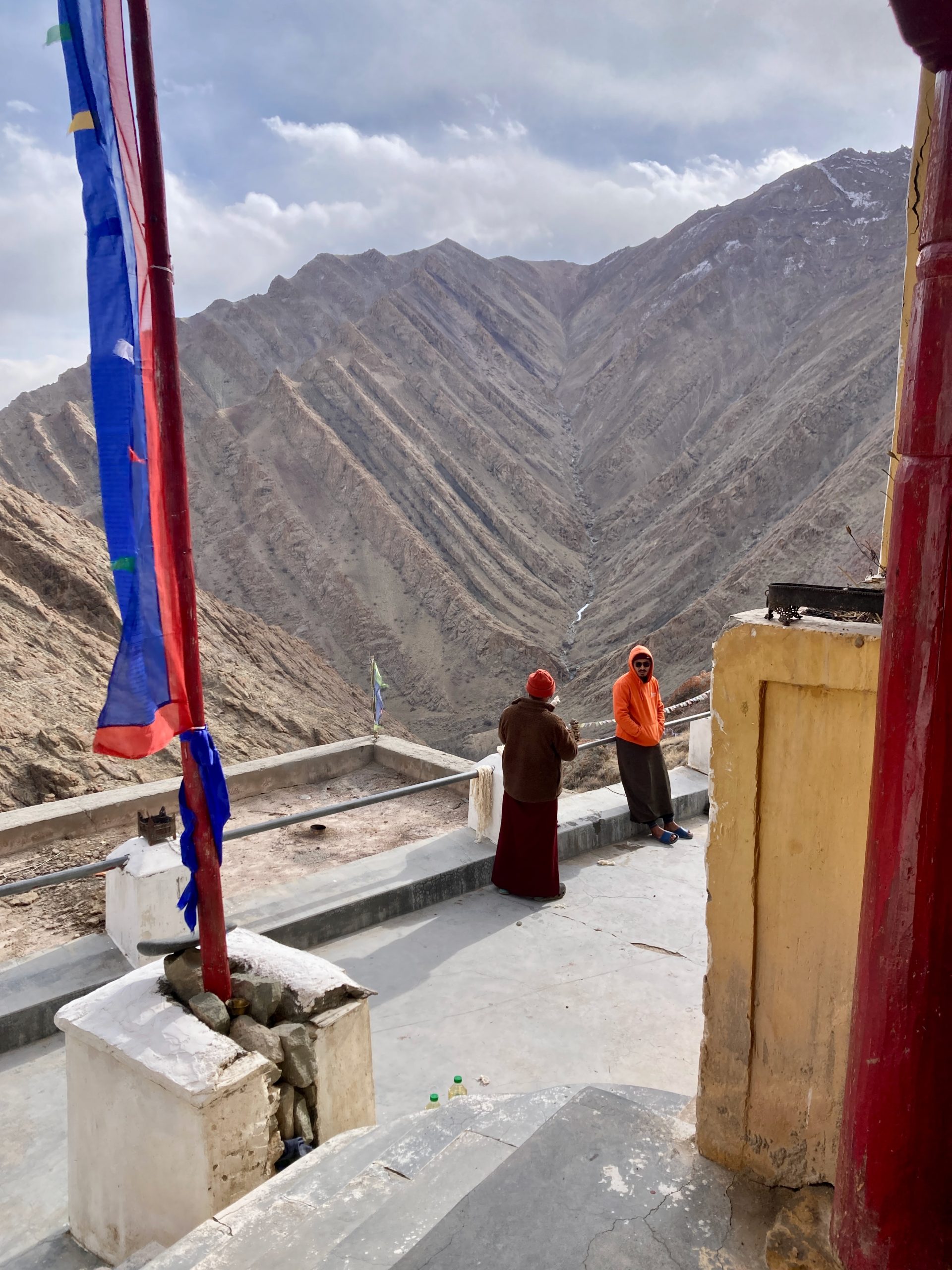 Dann starteten wir zur Einsiedelei Gothsang, wobei wir je weiter oben desto weniger wurden. Am Ende war ich mit Dolma und 2 Leuten alleine. Der Himmel hatte sich zugezogen, aber wir wurden trotzdem belohnt. Einmal mit der Einsamkeit und Ruhe, kaum dass man mehr in den Bergen ist. Zum anderen gab es eine Herde Blauschafe. Und drittens waren oben 2 Mönche und die Meditationshöhle von Lama Gothsang offen. Und die 2 Leute haben sich gefreut, dass sie es geschafft hatten. Ich habe nicht so viel geknipst.