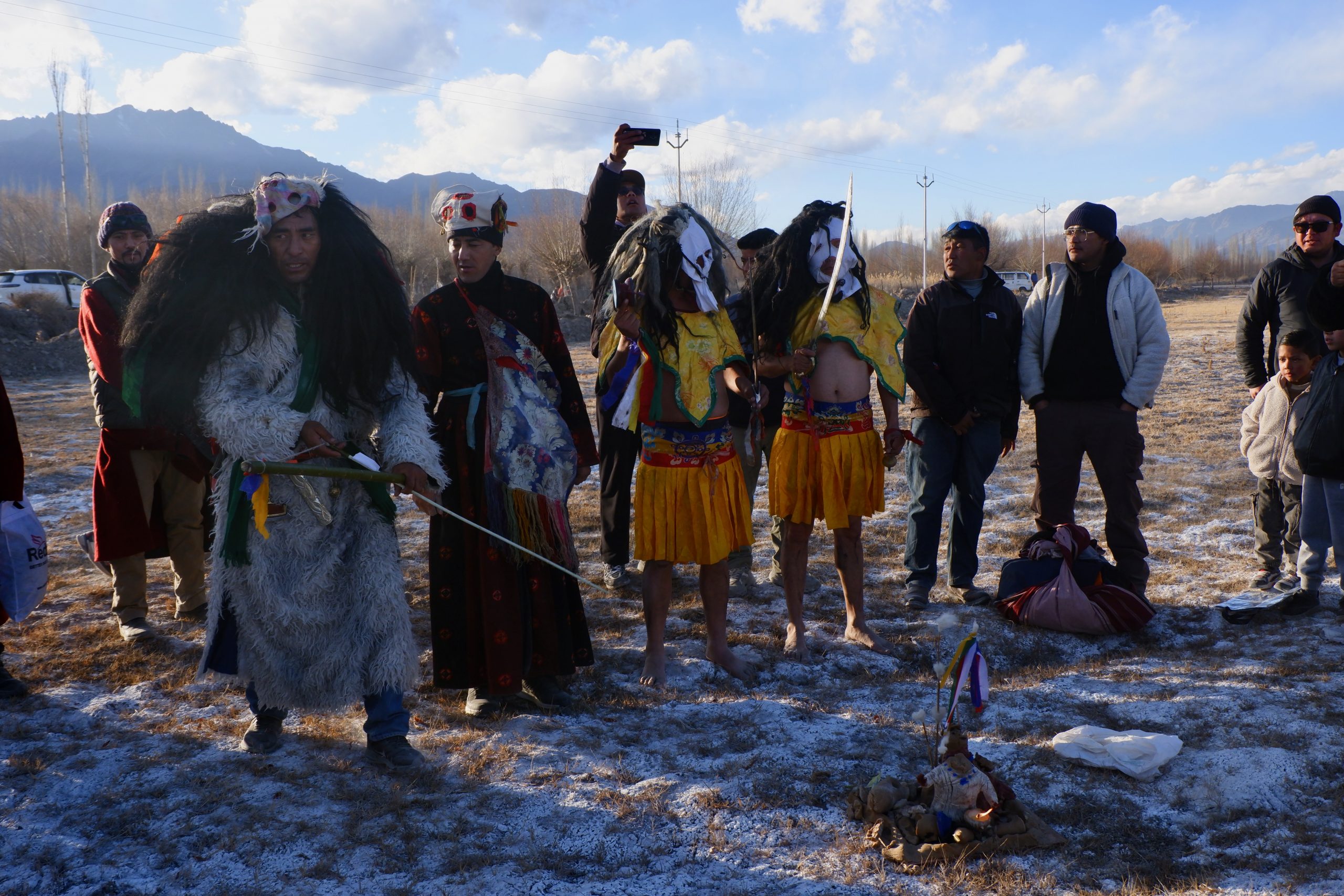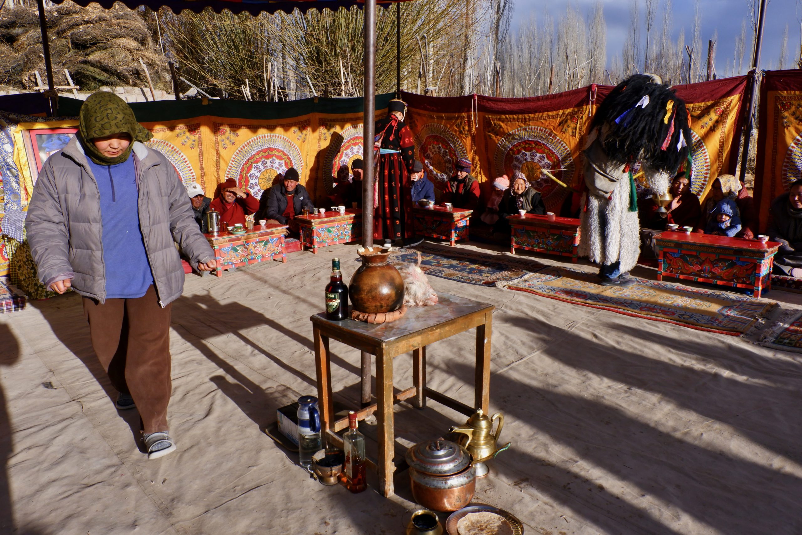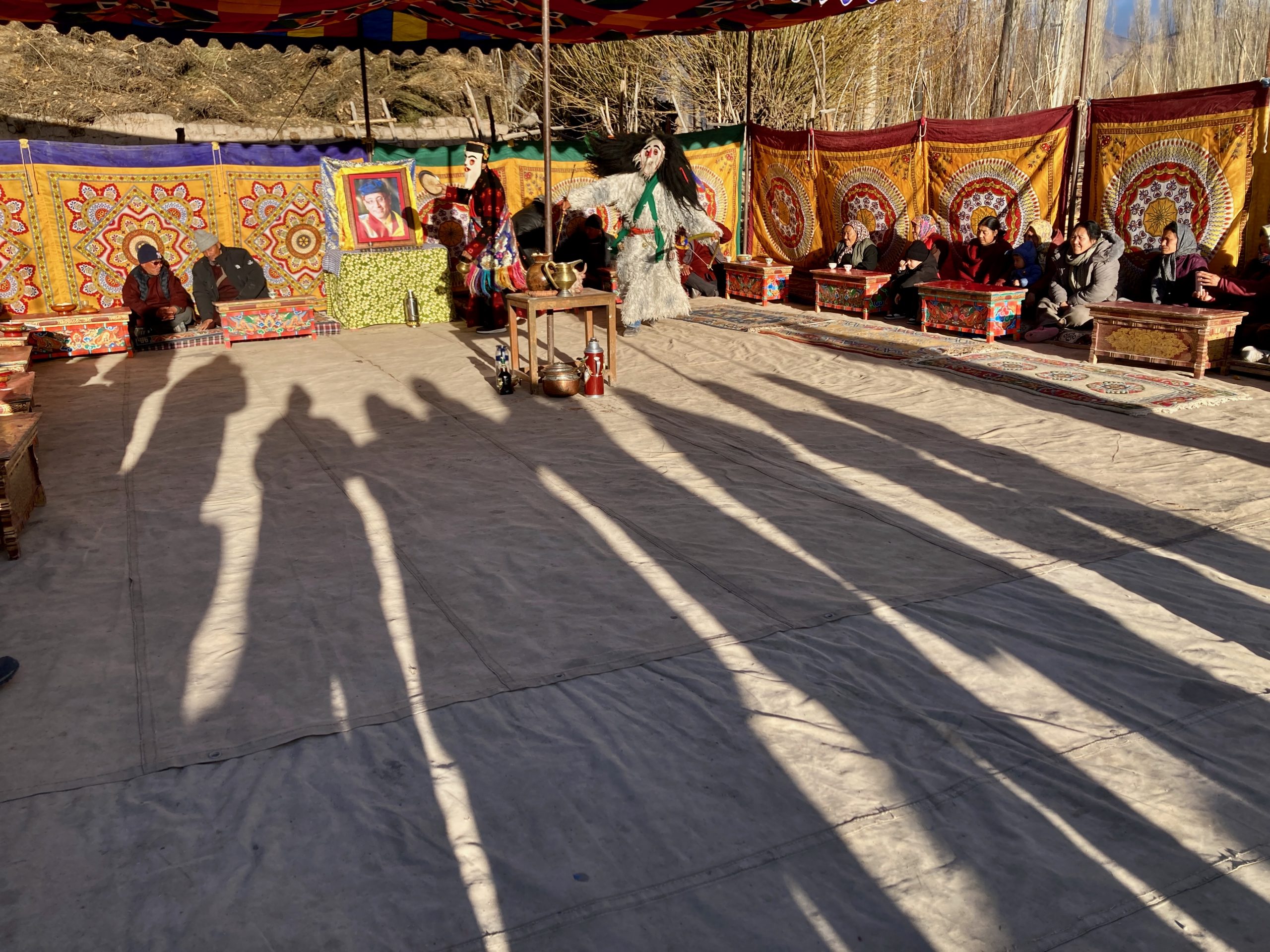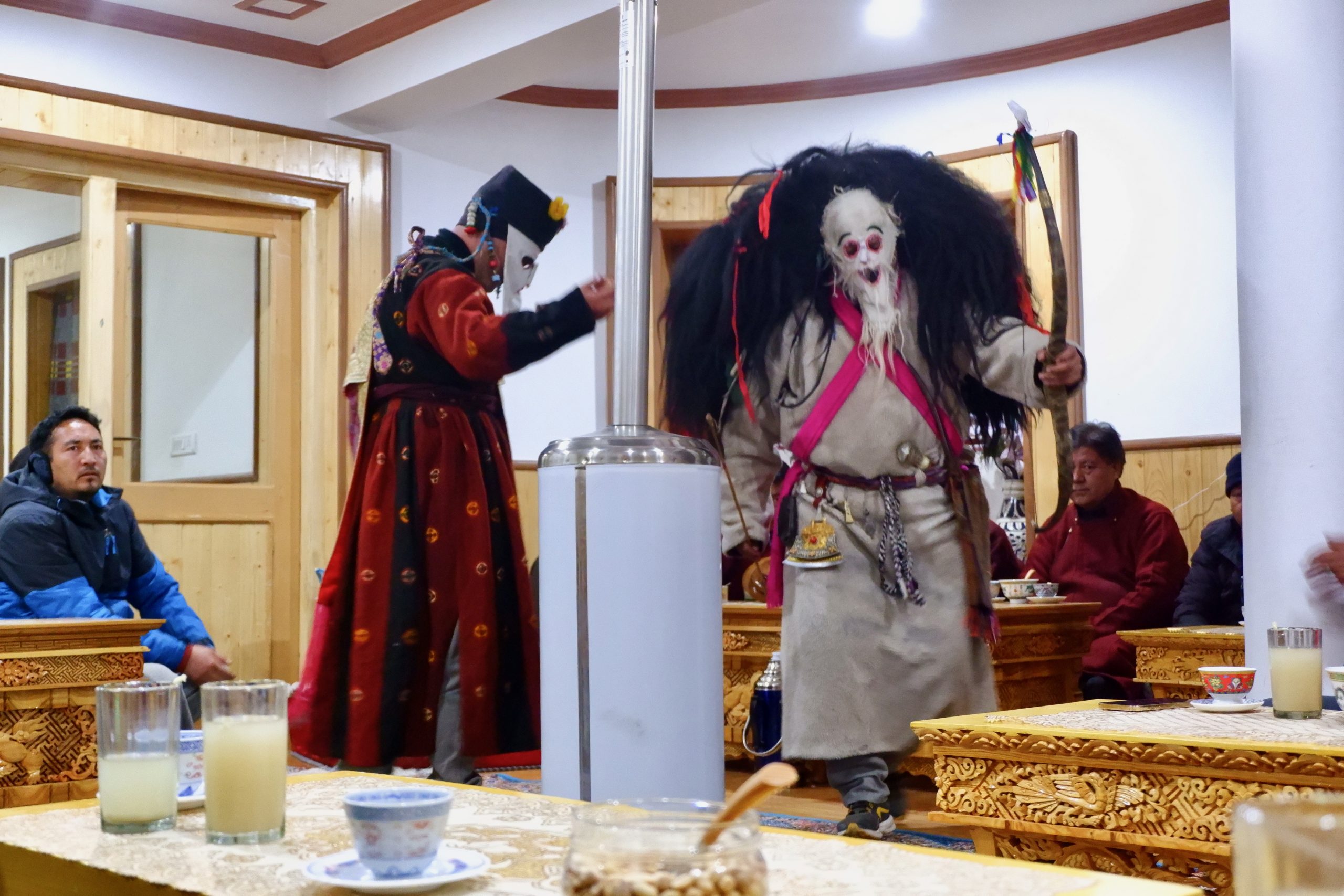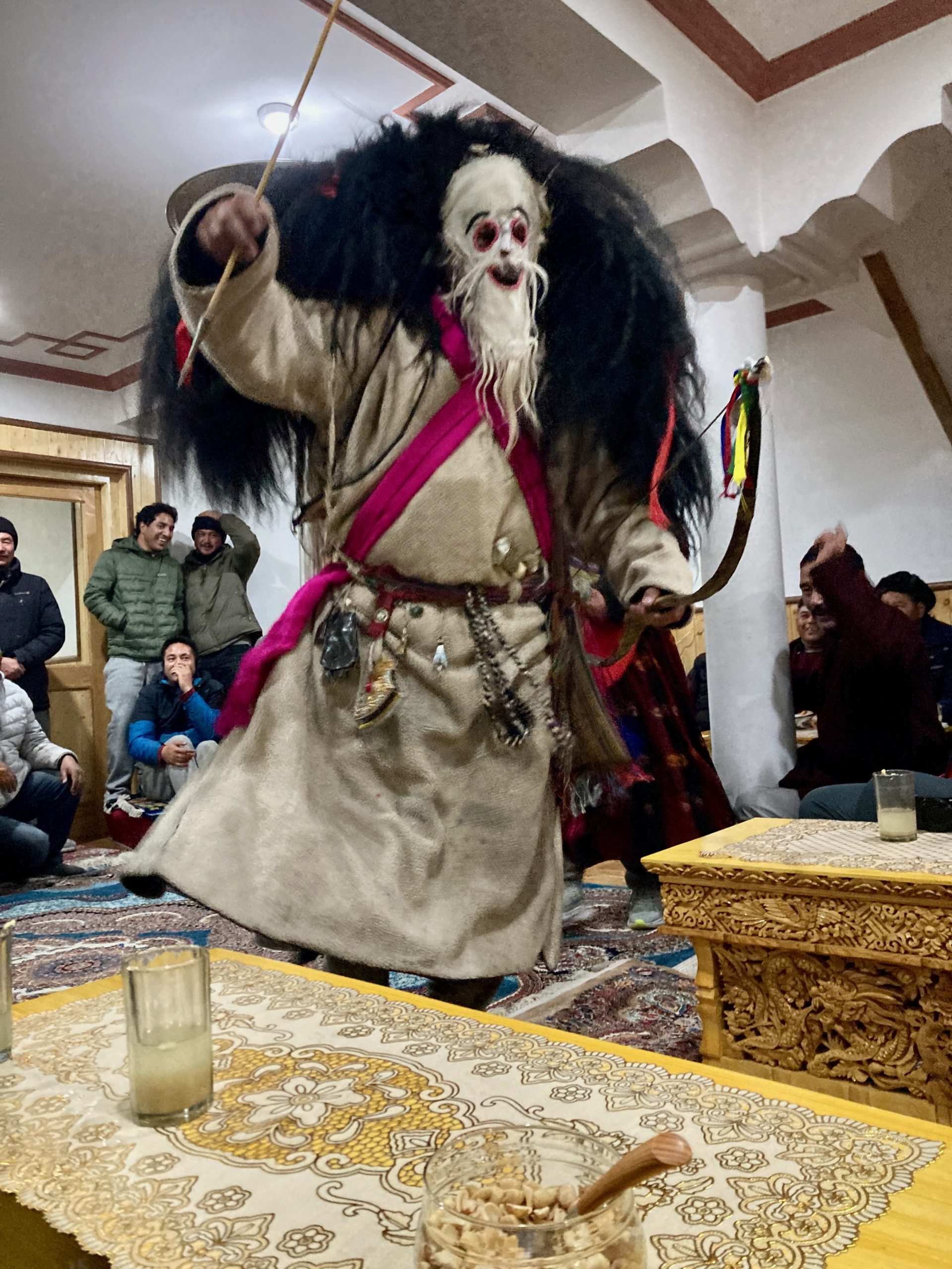 Sie gehen in jeden Haushalt, tanzen, machen Scherze, segnen die Hausgötter (das ist der schwierigste Teil zum Lernen) und alle Leute die im Haus sind. Die Menschen bekommen einen Klecks Butter auf die Stirn und man gibt dann Geld dafür. Die ganzen Tage kommt so einiges an Geld zusammen, wobei ein Teil für das ganze Essen und Getränke drauf geht und ein Teil die Beiden behalten dürfen.Dann muss Appu noch ein Skyin (s.o. – eine Mischung aus Fabelwesen und Ibex, welches mehrfach mit Tsampa geknetet und geformt wurde) mit einem Pfeil treffen. Das ist aus alten Zeiten überliefert, wo das Überleben von guter Jagd abhing.