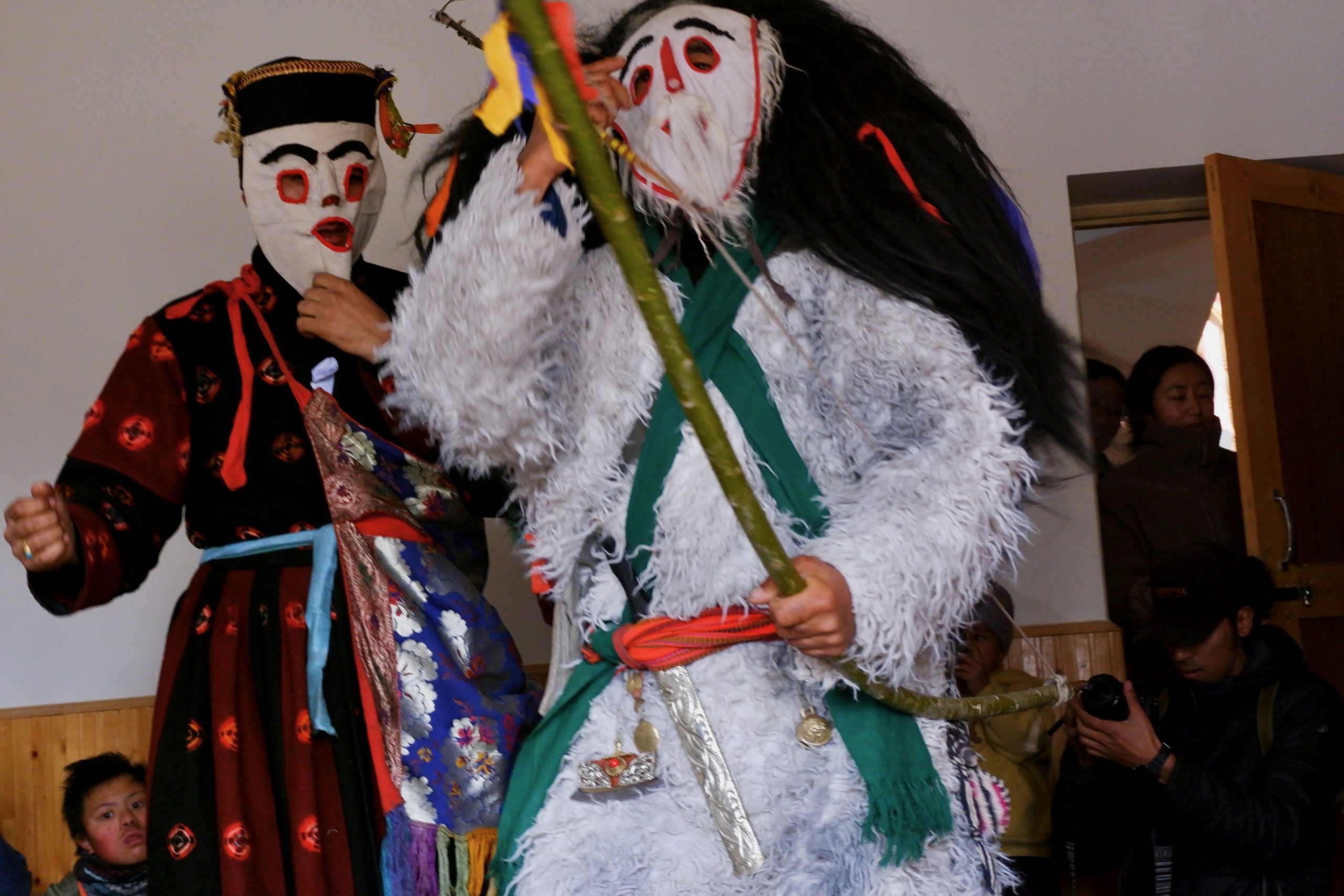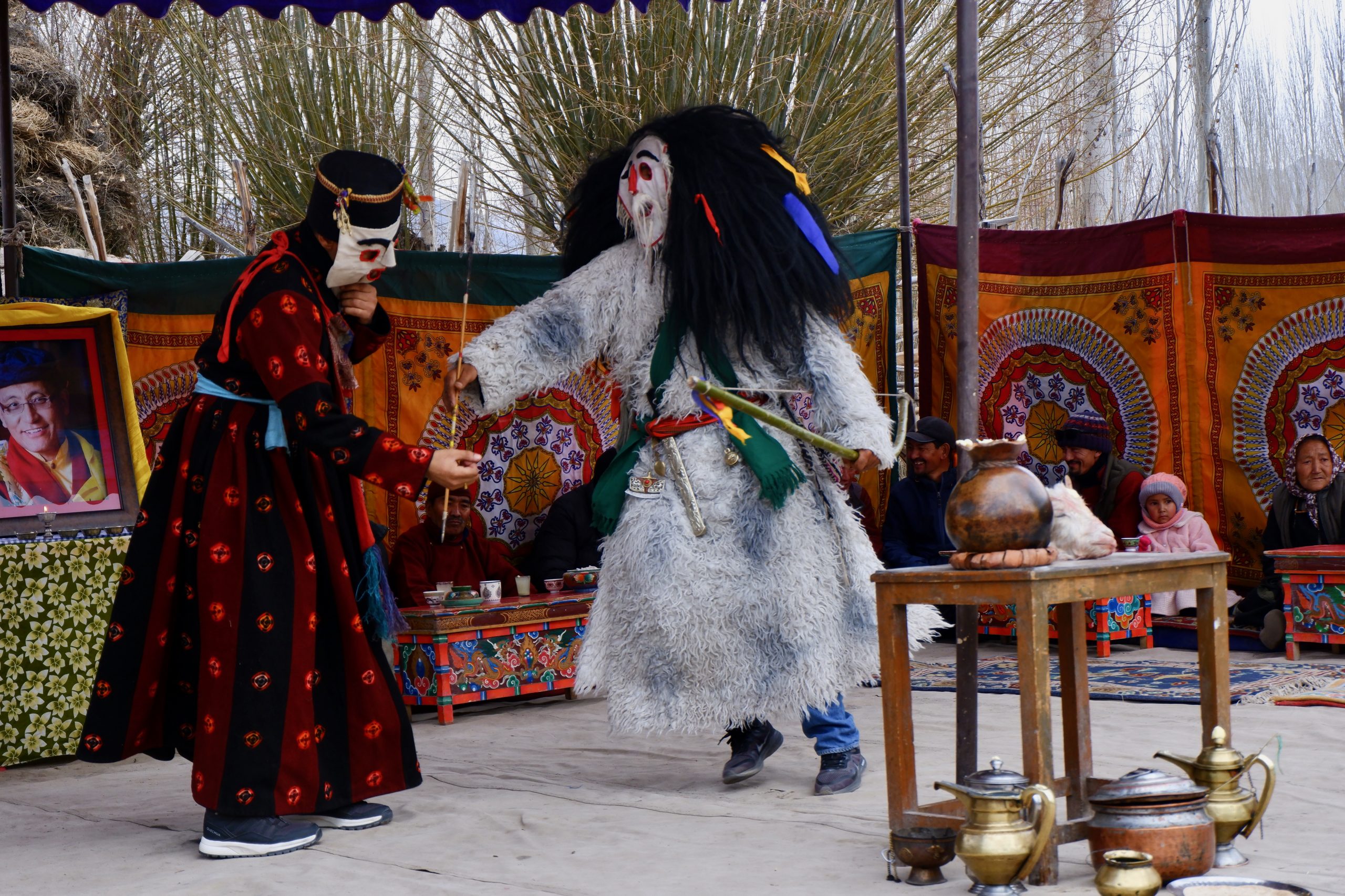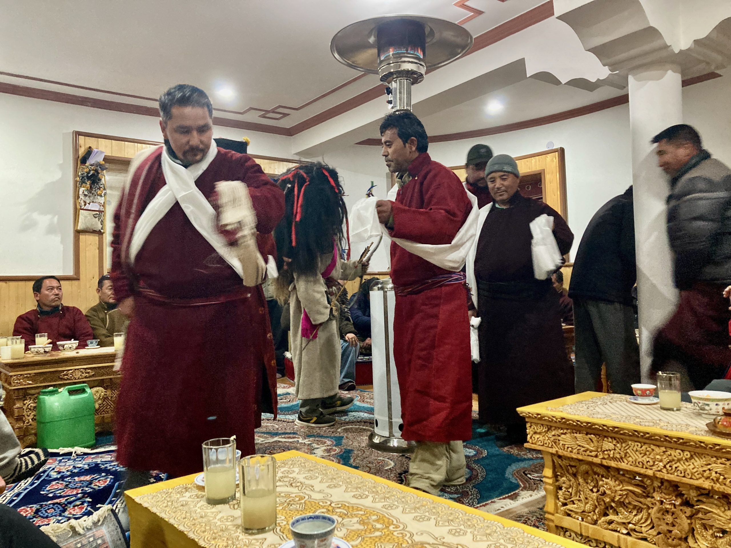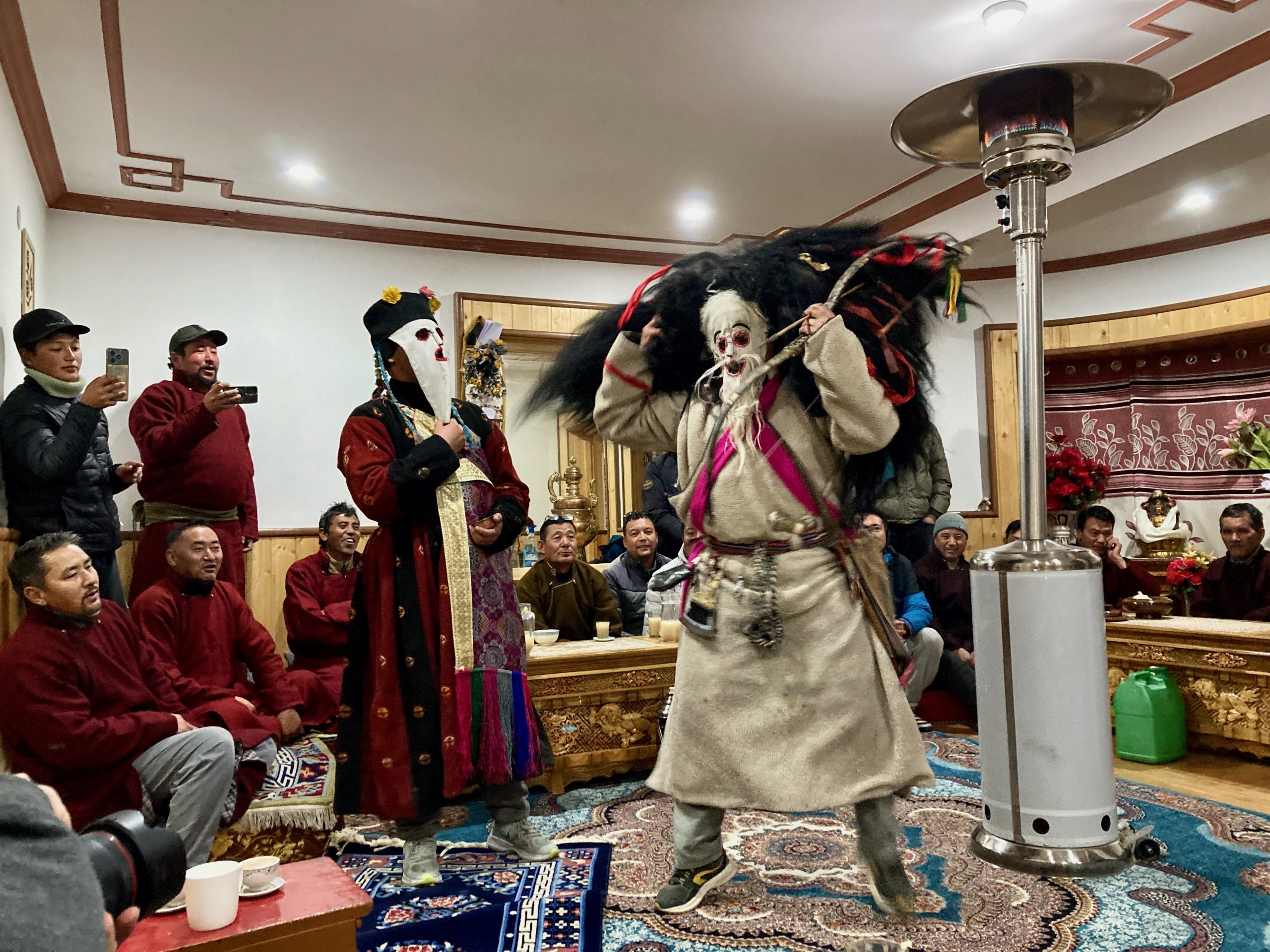 Sie gehen in jeden Haushalt, tanzen, machen Scherze, segnen die Hausgötter (das ist der schwierigste Teil zum Lernen) und alle Leute die im Haus sind. Die Menschen bekommen einen Klecks Butter auf die Stirn und man gibt dann Geld dafür. Die ganzen Tage kommt so einiges an Geld zusammen, wobei ein Teil für das ganze Essen und Getränke drauf geht und ein Teil die Beiden behalten dürfen.Dann muss Appu noch ein Skyin (s.o. – eine Mischung aus Fabelwesen und Ibex, welches mehrfach mit Tsampa geknetet und geformt wurde) mit einem Pfeil treffen. Das ist aus alten Zeiten überliefert, wo das Überleben von guter Jagd abhing.
