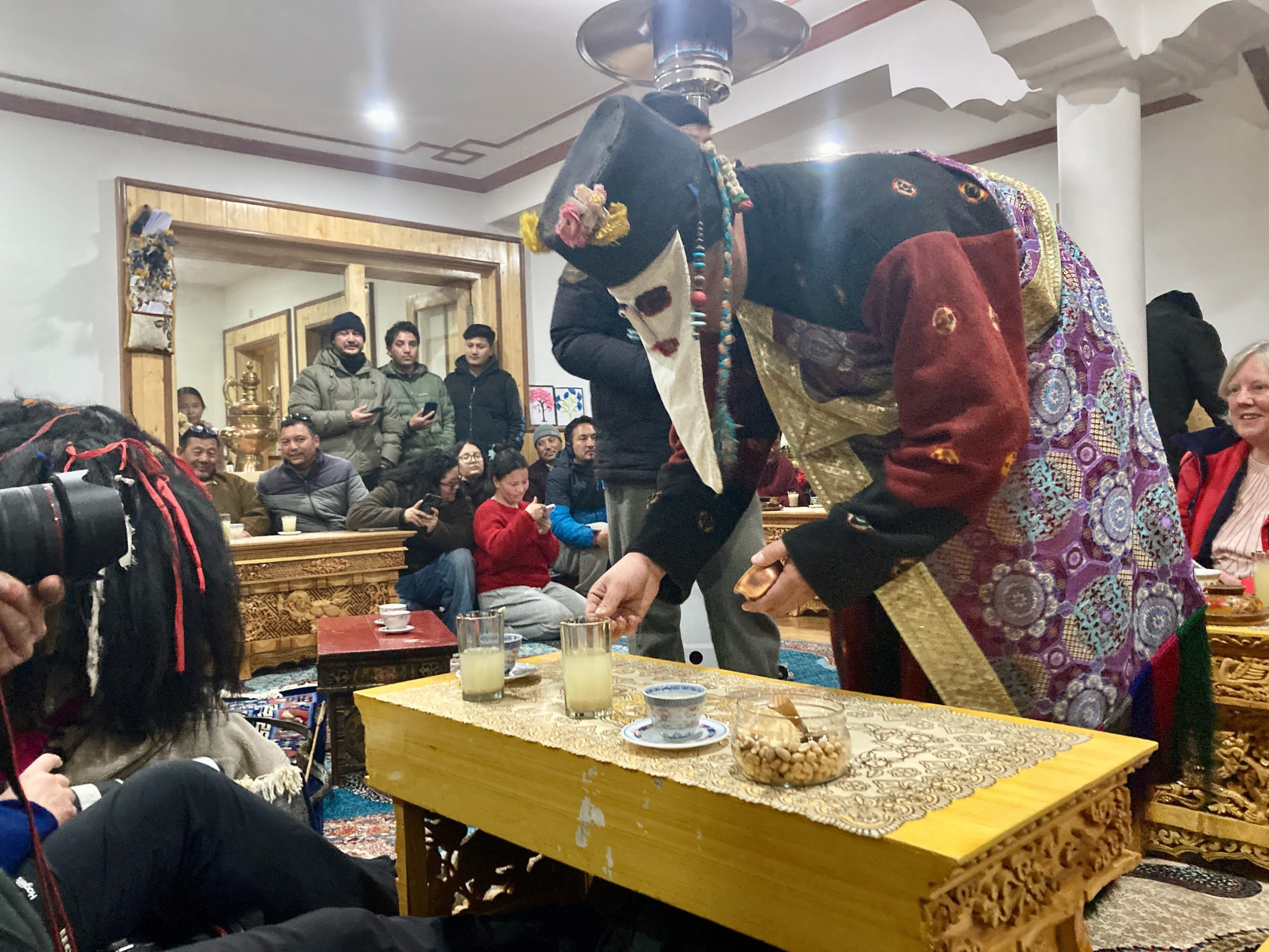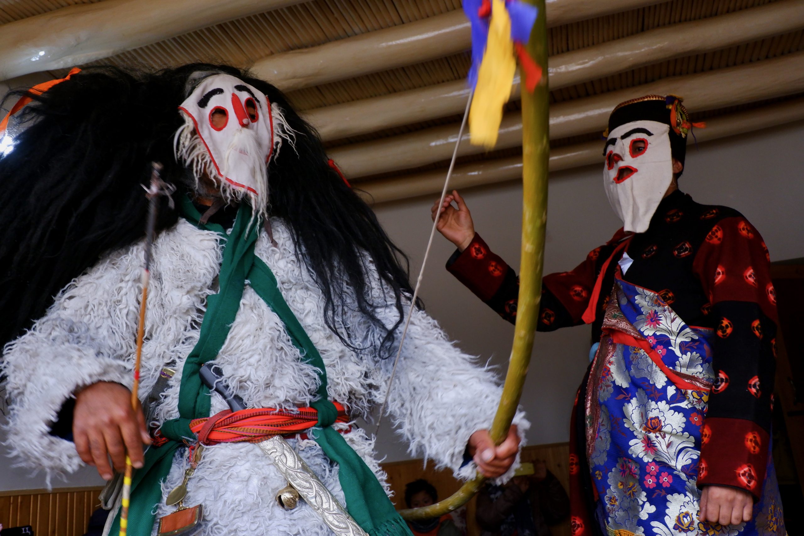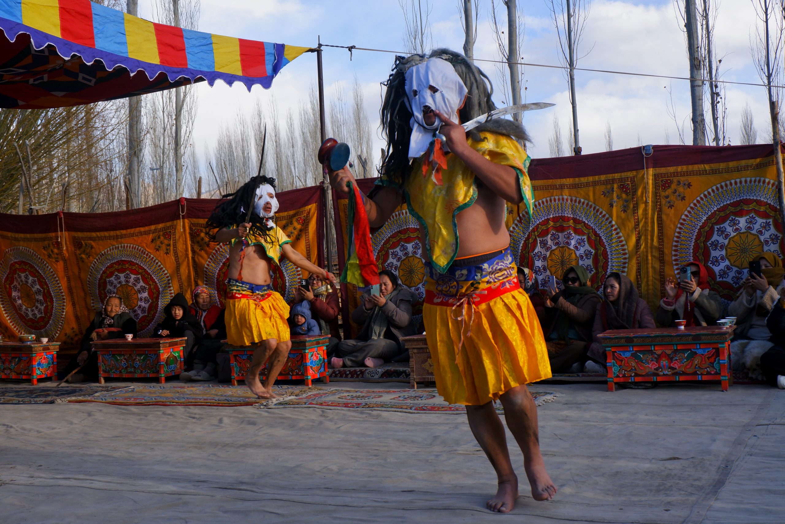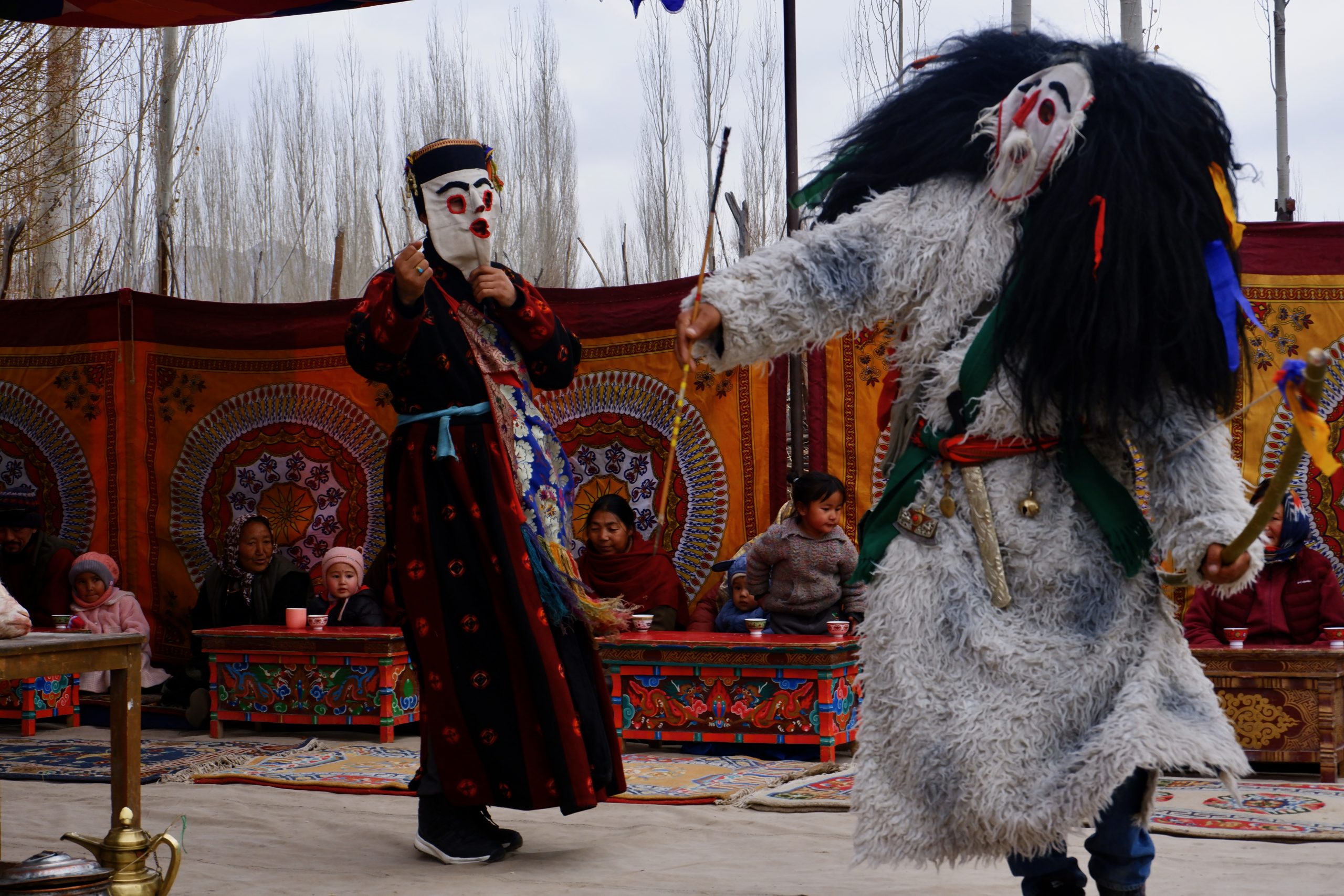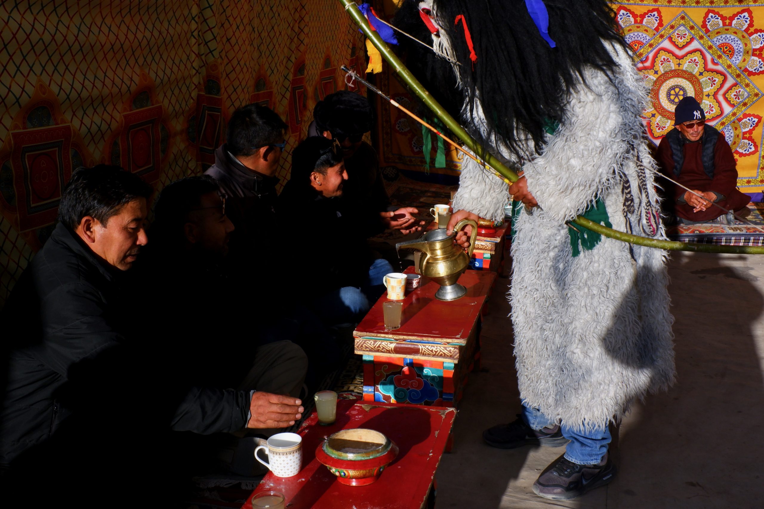 Sie gehen in jeden Haushalt, tanzen, machen Scherze, segnen die Hausgötter (das ist der schwierigste Teil zum Lernen) und alle Leute die im Haus sind. Die Menschen bekommen einen Klecks Butter auf die Stirn und man gibt dann Geld dafür. Die ganzen Tage kommt so einiges an Geld zusammen, wobei ein Teil für das ganze Essen und Getränke drauf geht und ein Teil die Beiden behalten dürfen.Dann muss Appu noch ein Skyin (s.o. – eine Mischung aus Fabelwesen und Ibex, welches mehrfach mit Tsampa geknetet und geformt wurde) mit einem Pfeil treffen. Das ist aus alten Zeiten überliefert, wo das Überleben von guter Jagd abhing.