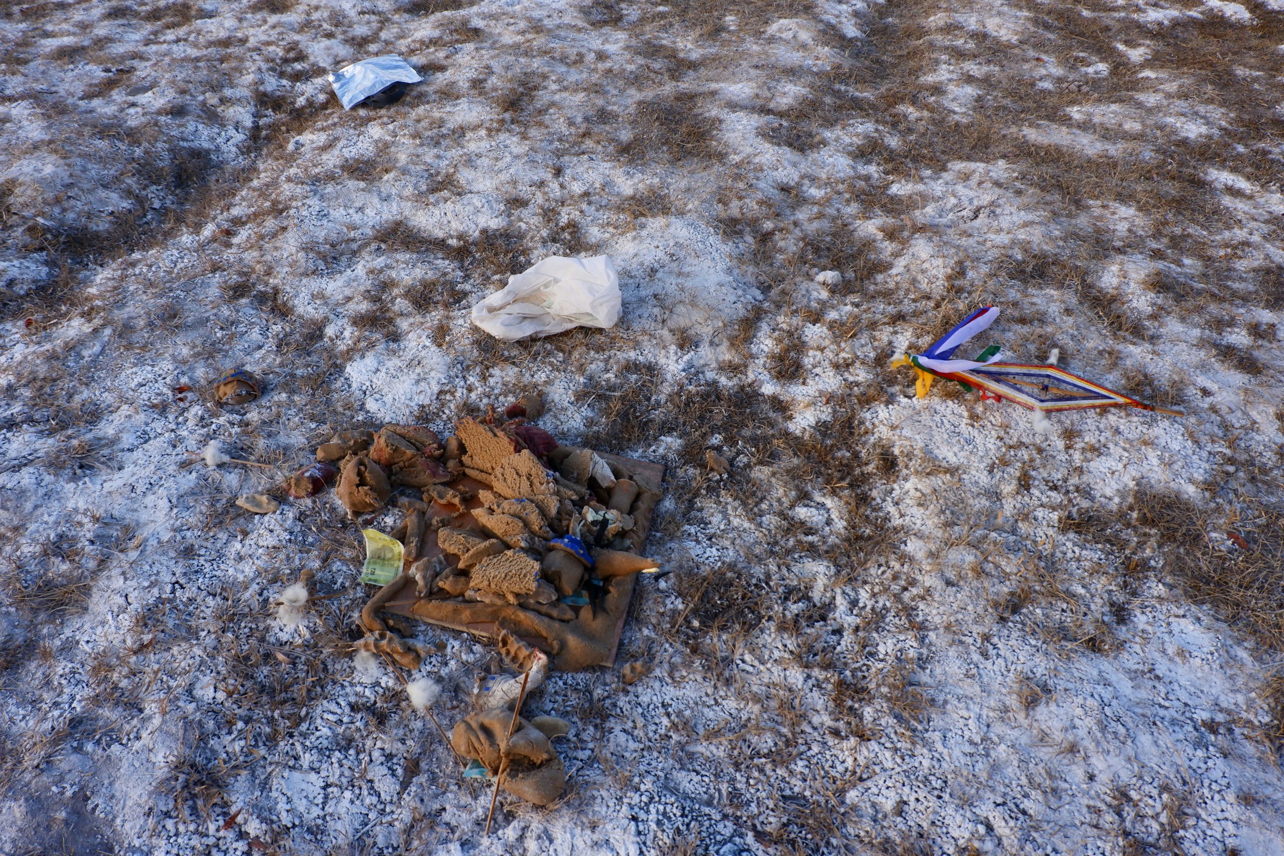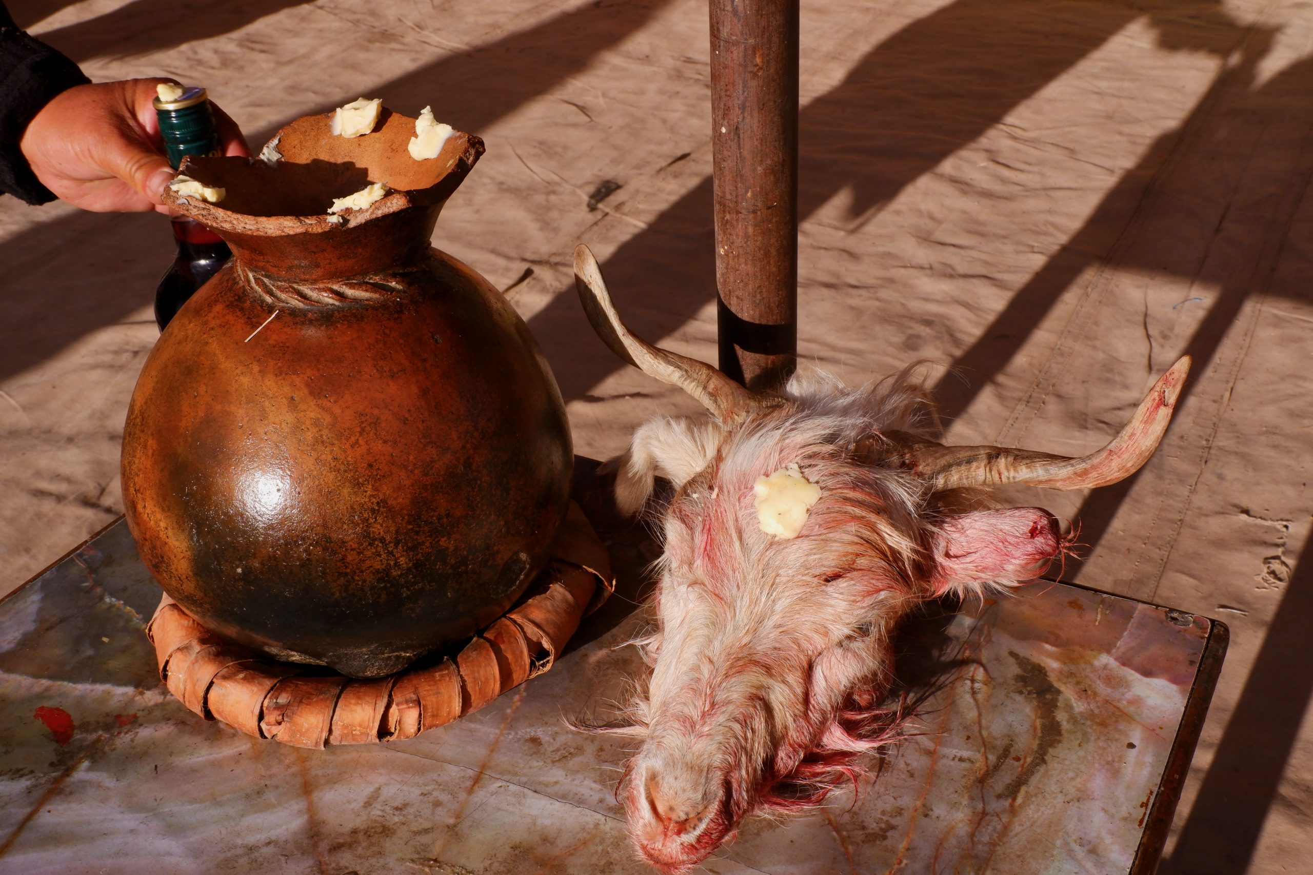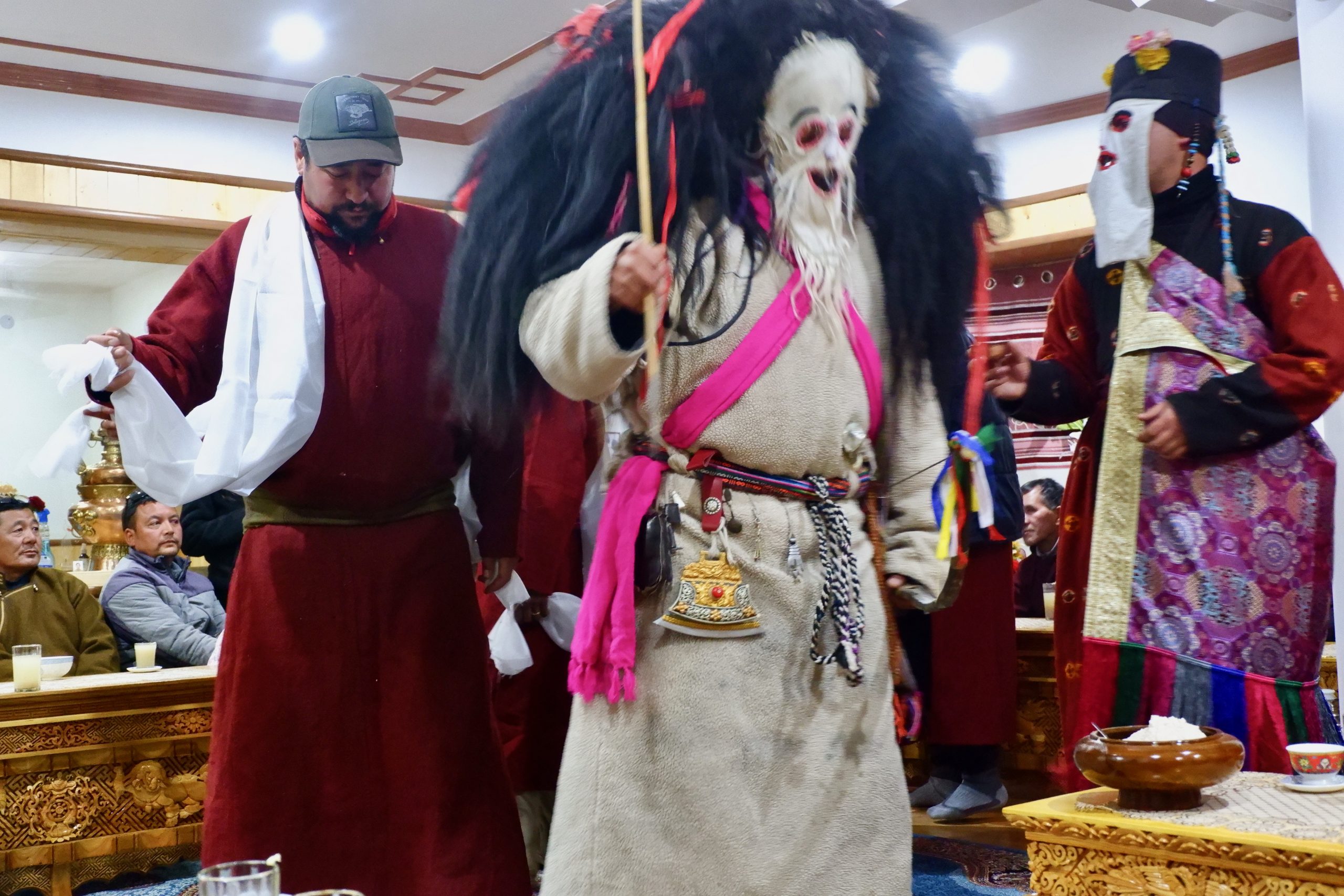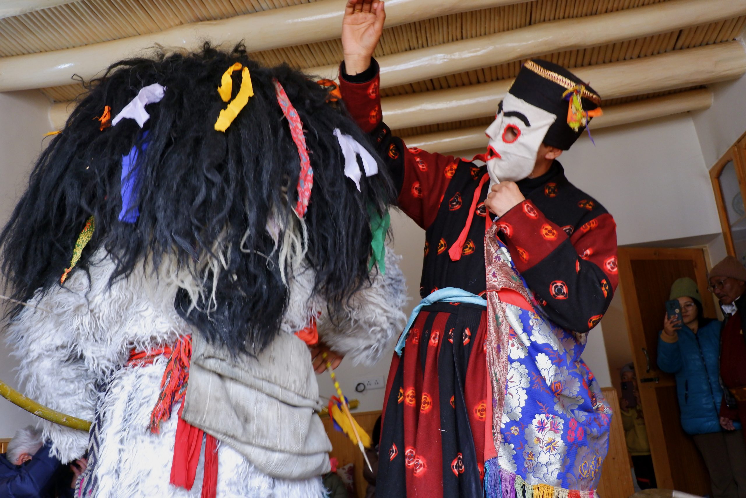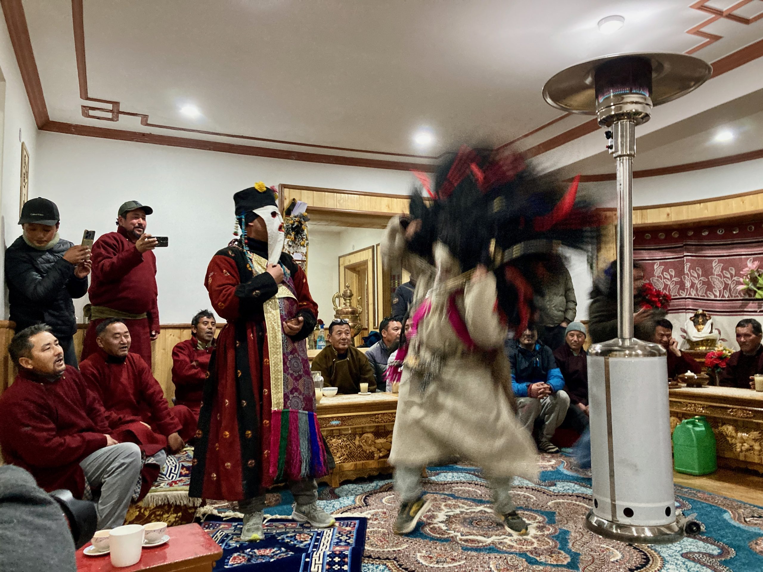 Sie gehen in jeden Haushalt, tanzen, machen Scherze, segnen die Hausgötter (das ist der schwierigste Teil zum Lernen) und alle Leute die im Haus sind. Die Menschen bekommen einen Klecks Butter auf die Stirn und man gibt dann Geld dafür. Die ganzen Tage kommt so einiges an Geld zusammen, wobei ein Teil für das ganze Essen und Getränke drauf geht und ein Teil die Beiden behalten dürfen.Dann muss Appu noch ein Skyin (s.o. – eine Mischung aus Fabelwesen und Ibex, welches mehrfach mit Tsampa geknetet und geformt wurde) mit einem Pfeil treffen. Das ist aus alten Zeiten überliefert, wo das Überleben von guter Jagd abhing.