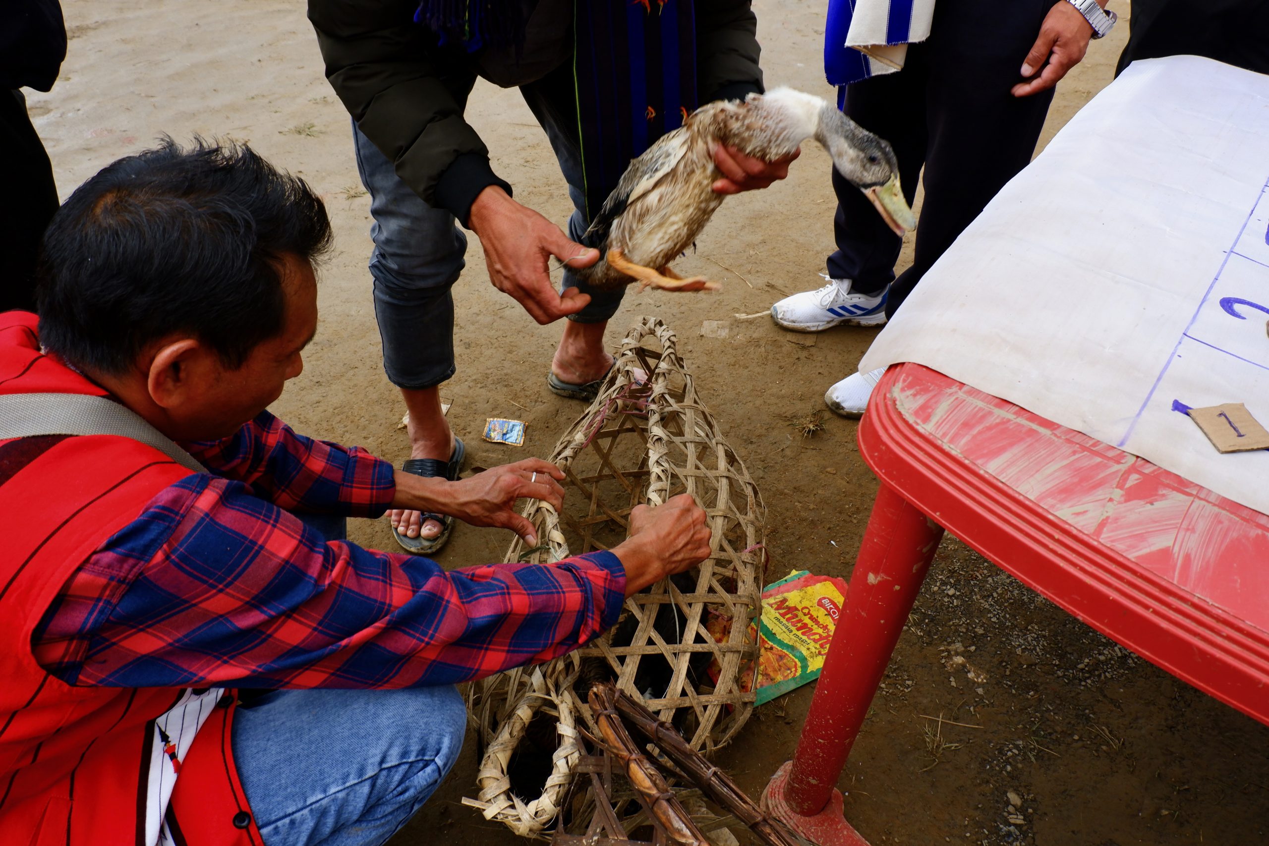 Neben vielen Essensbuden gab es sehr sehr viele Glücksspielbuden. Dabei wurden Karten auf Felder verteilt auf die man vorher gesetzt hatte. Und wenn 3 aufeinander folgende Karten auf einem Feld landeten, hatte man gewonnen. Bei den meisten konnte man Enten gewinnen – so wie hier: