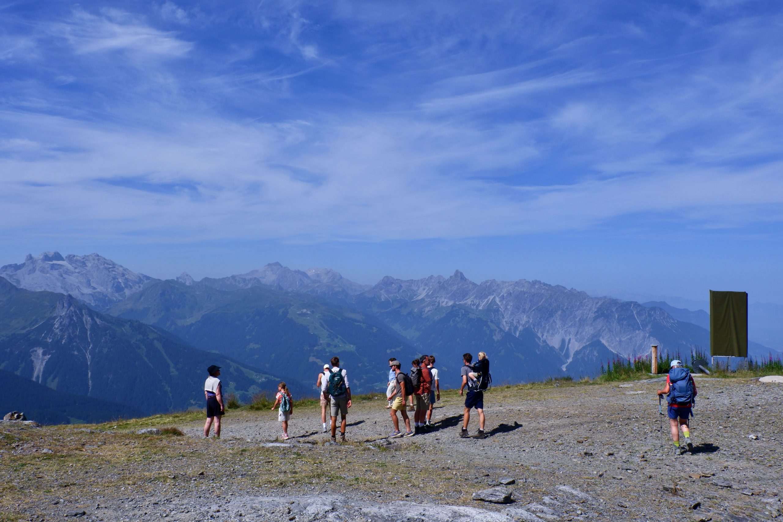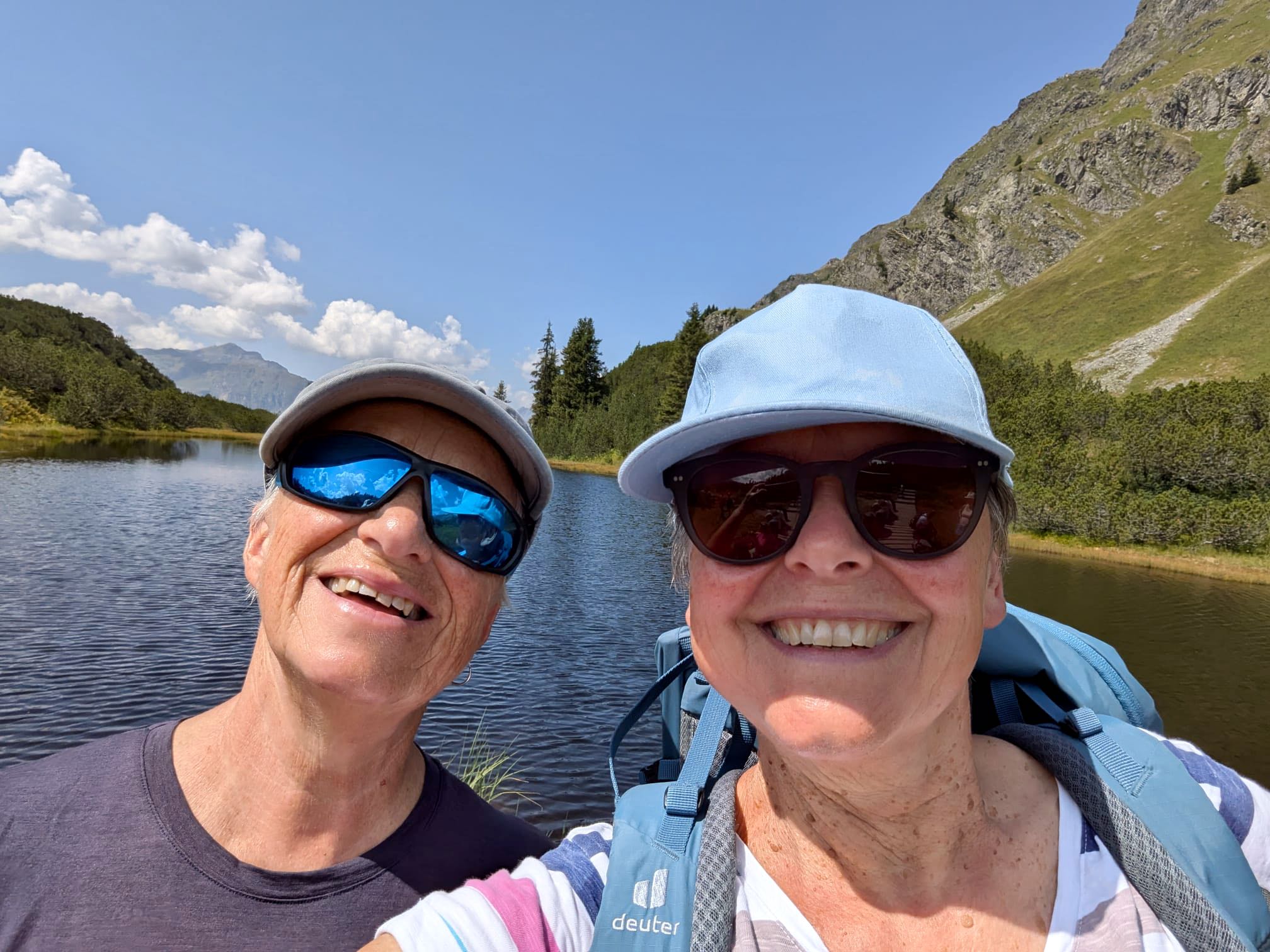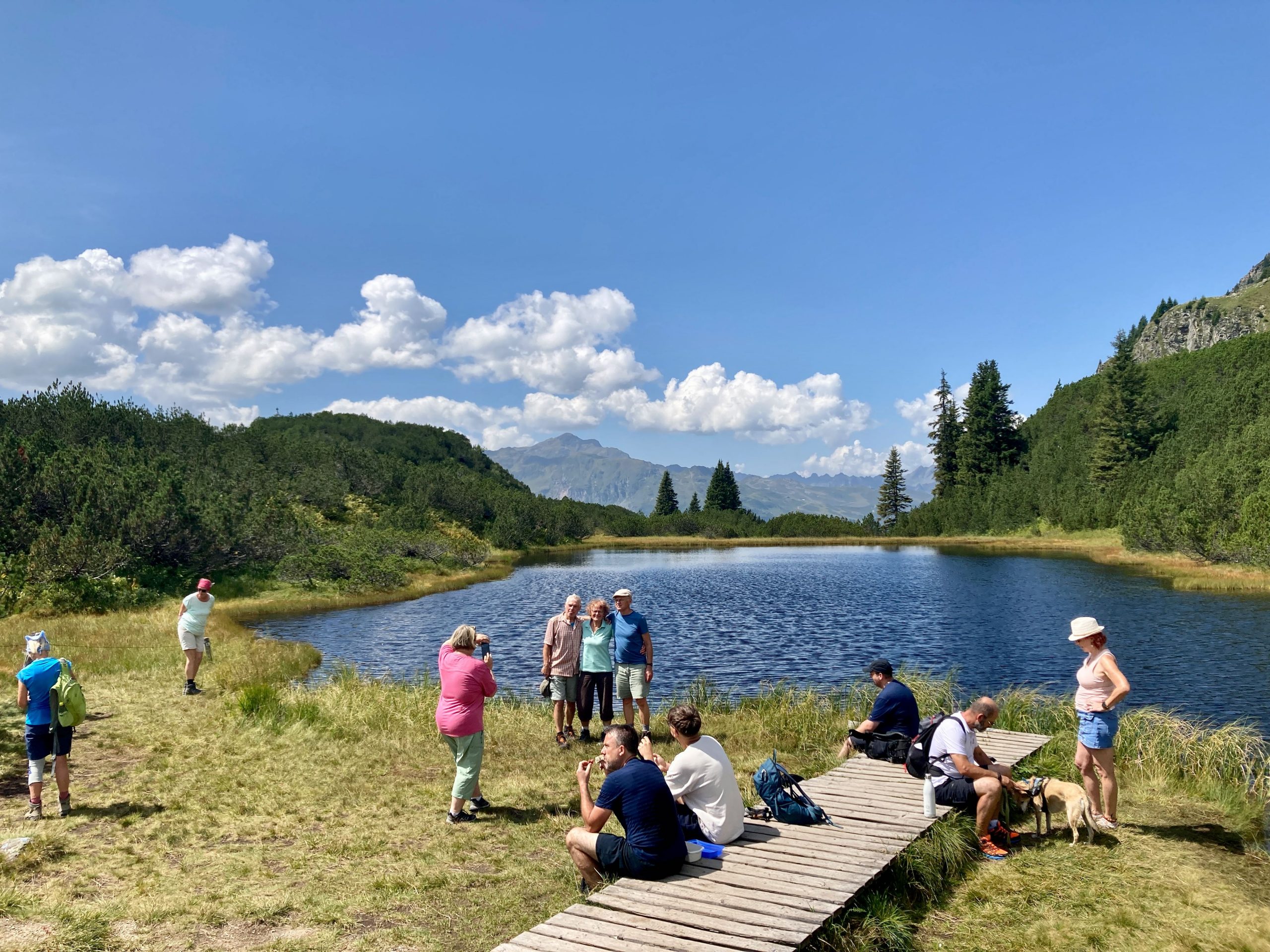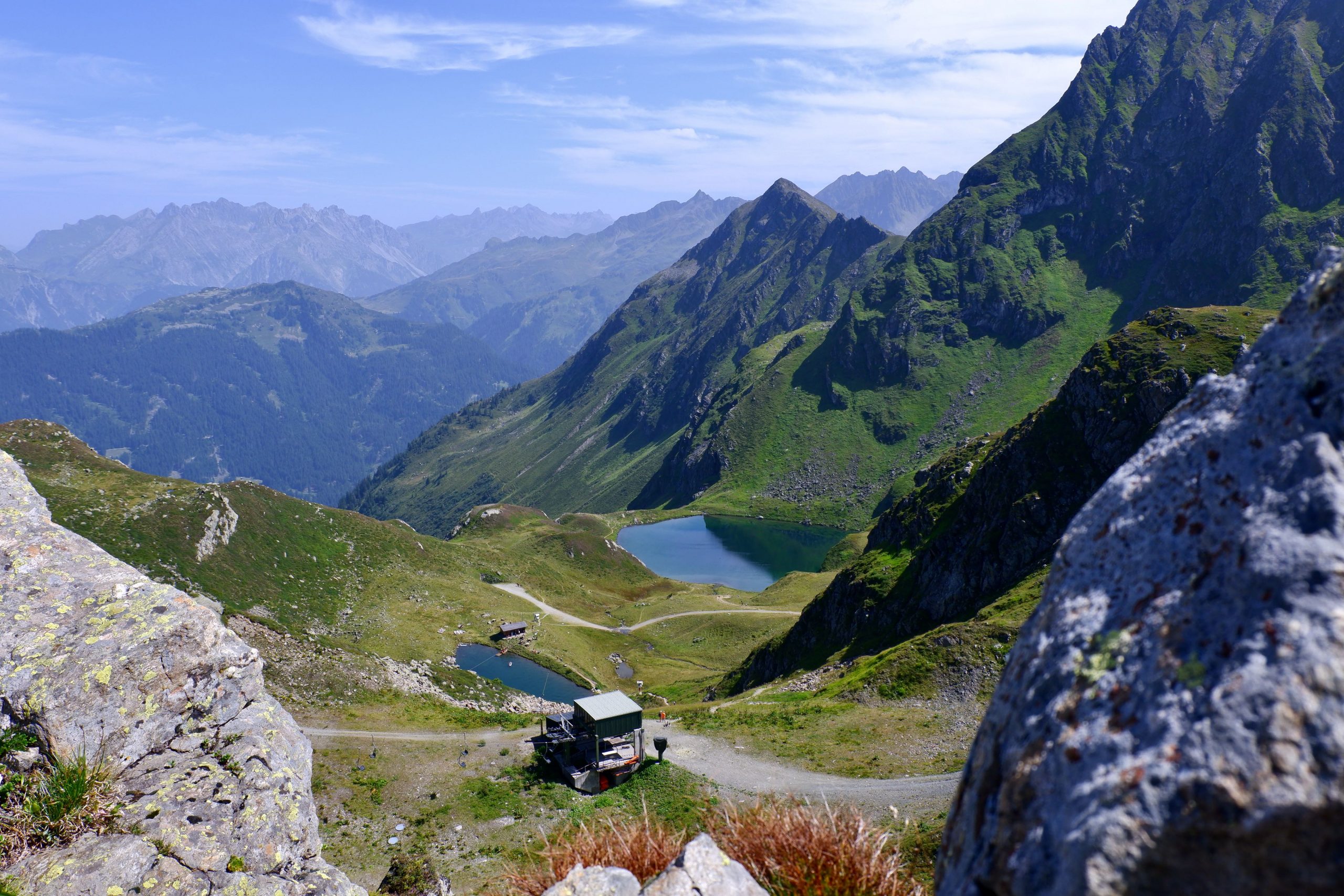 Der Plan: Mit dem Auto zu einer Gondel bei Schruns, halbhoch und dann einen Seenweg bis zu einer Mittagshütte. Sollte sehr leicht sein. Allerdings 500 Höhenmeter – und ich murrte, als ich das mitbekam. Die Erinnerung an die vortägige Schlappheit zusammen mit der psychischen Einstellung, dass die Tour ja eher beendet sei, war mir das zu viel. Das fand Karla doof. Erst ging ich zum Auto zurück, nochmal umpacken mit mehr Wasser usw. Kurz vor Mittelstation merkte ich das Fehlen meiner Sonnenbrille. Ohne geht nicht. Wohl auf dem Klo gelassen – also ich gleich in der Gondel geblieben und zurück. Jemand hatte sie gefunden und dem Kassierer gegeben. Wieder hoch. Was nun? Schlappängste überwinden? Karla wurde es zu bunt und sie entschied: Ganz nach oben und da rumgucken.