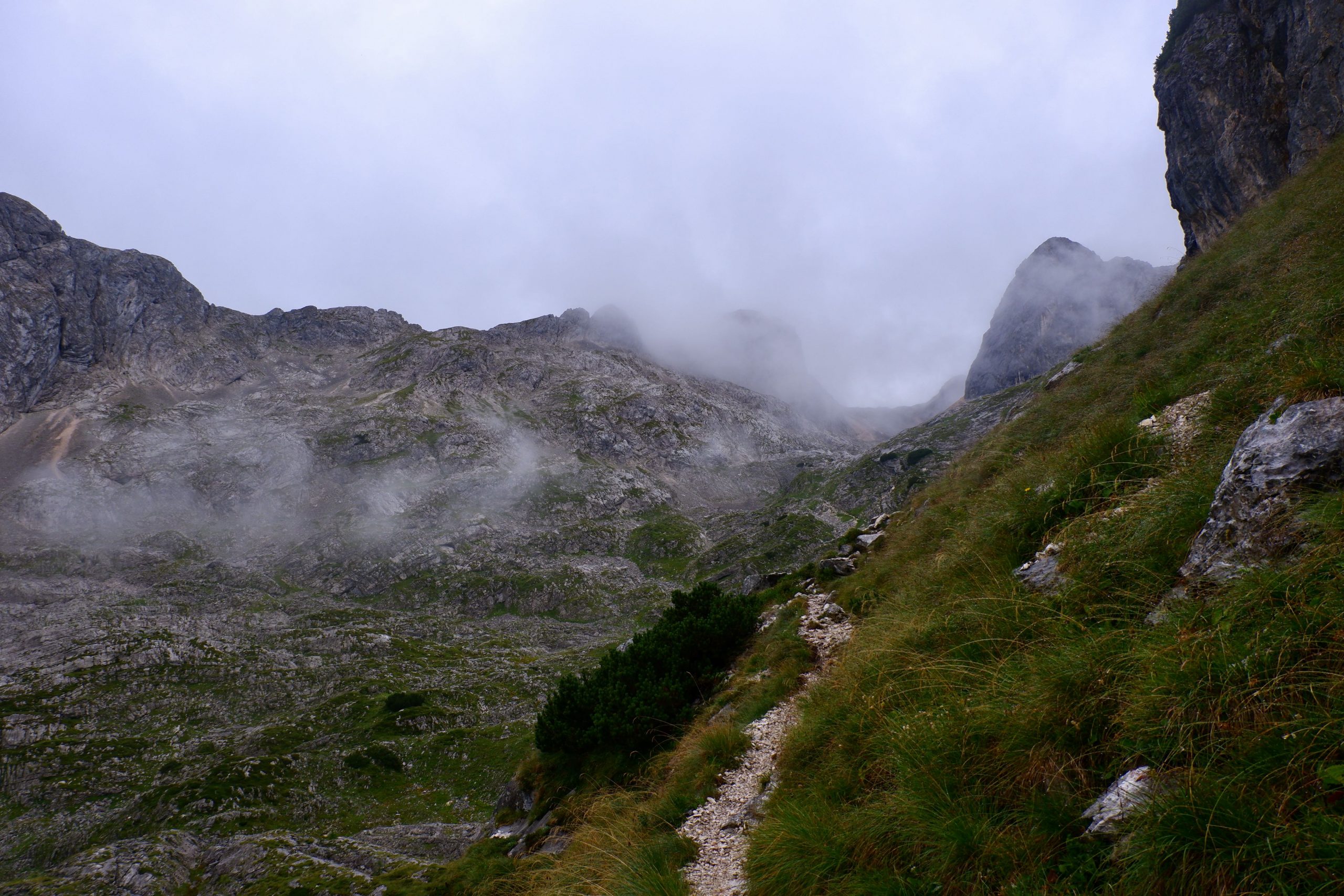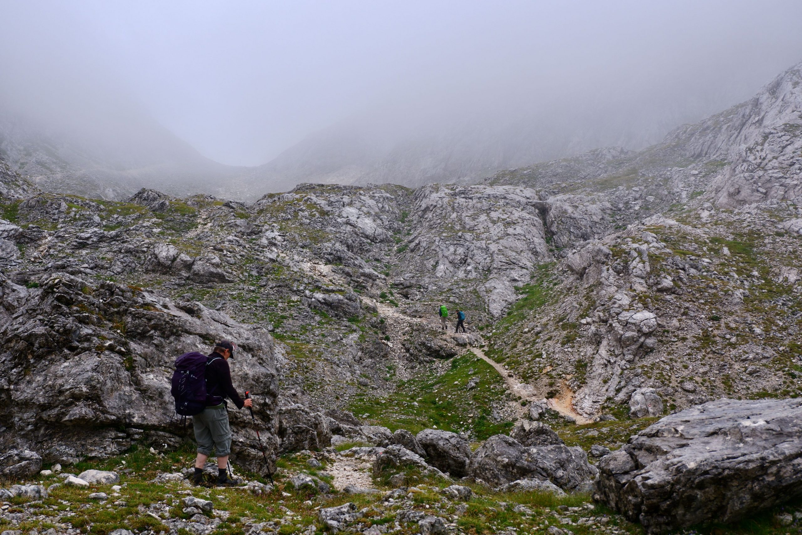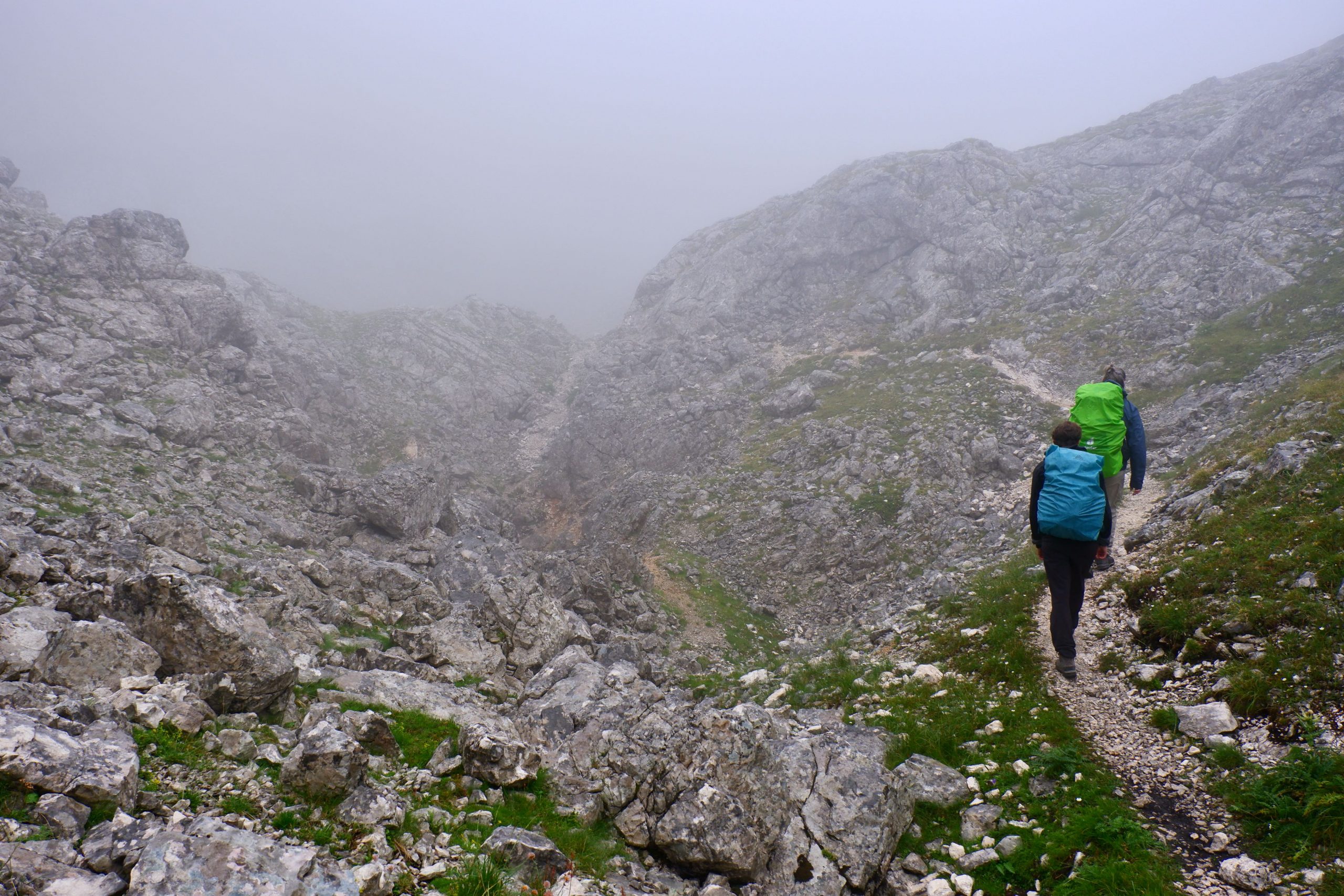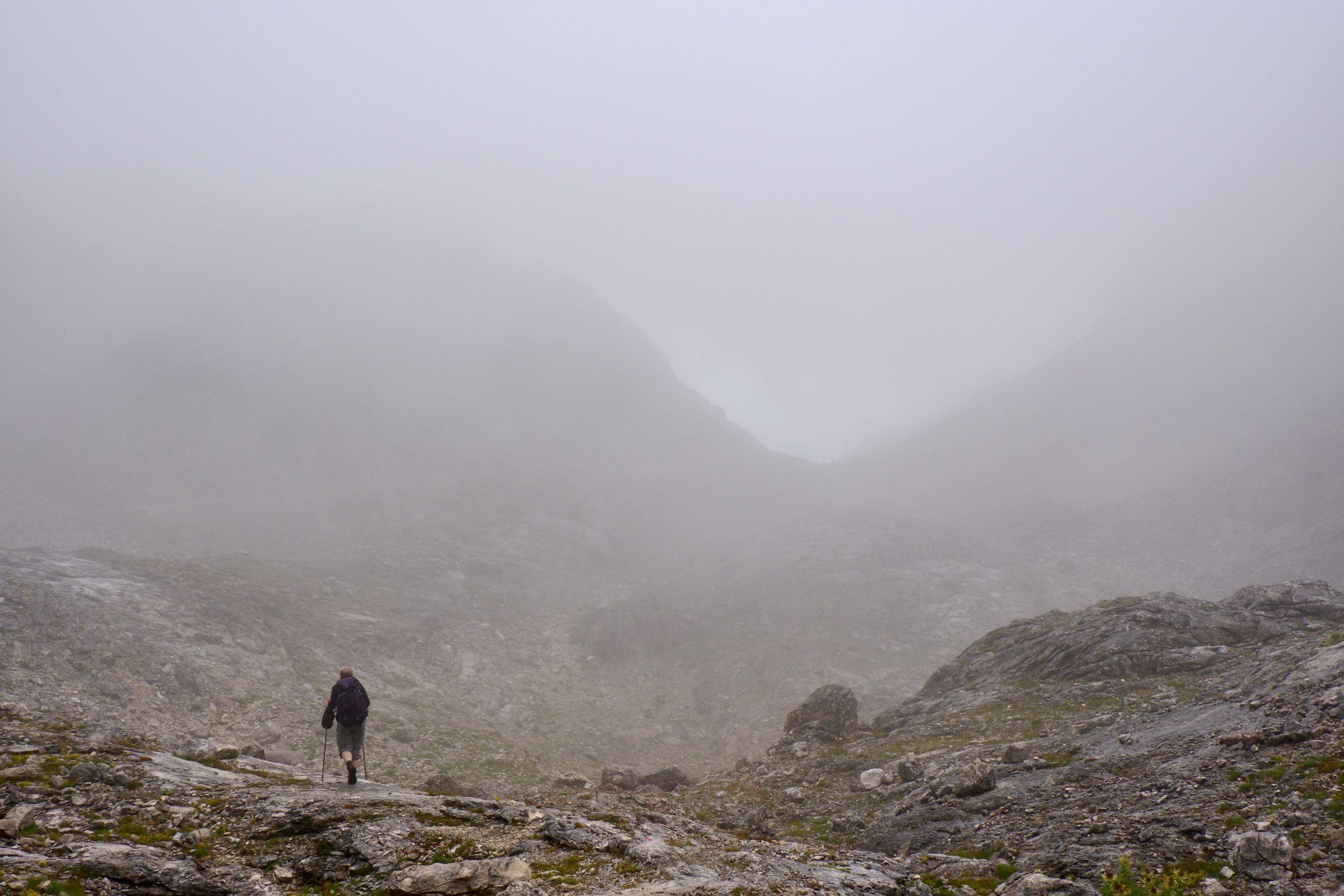Kurz danach ging es dann los: der Regen fiel wild hinunter. Immerhin: ein guter Test für meine Regenjacke (hält!) und neue Rucksackpacktechnik (Plastiktüten statt Regenhaube – hält). Und nach ca. 30 min war es zum Glück wieder vorbei und ein nebliges Wetterfenster löste den Regen ab. Wir konnten erkennen, dass die Landschaft immer wilder und steiniger und felsiger wurde. Was für Berge! Schnell weiter vor dem nächsten Regen, aber doch noch ein paar Bilder machen!