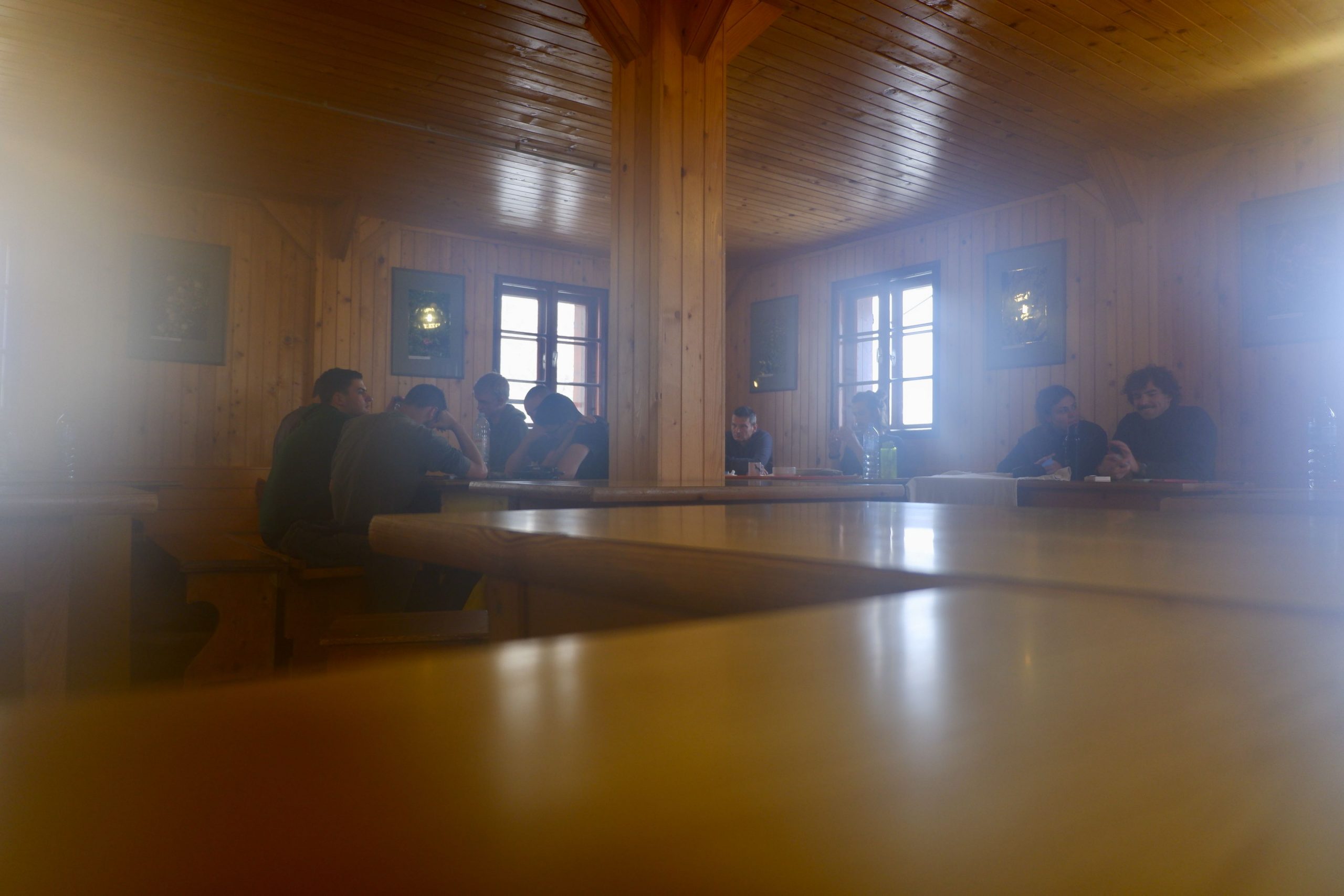 Nächstes Mal? War ich nicht noch total griesgrämig am Vortag? Dieses änderte sich hier enorm. Das bisschen sichtbare Landschaft war ja schon toll. Und der Hüttenwirt hier lustig und leidenschaftlich und sympathisch – und deswegen wohl auch mit einem ebensolchen Team gesegnet. Es herrschte eine total nette Stimmung hier. Trotz dass so gut wie alle schon weit vor dem Mittag da waren. Der Essraum war auch groß genug für alle.