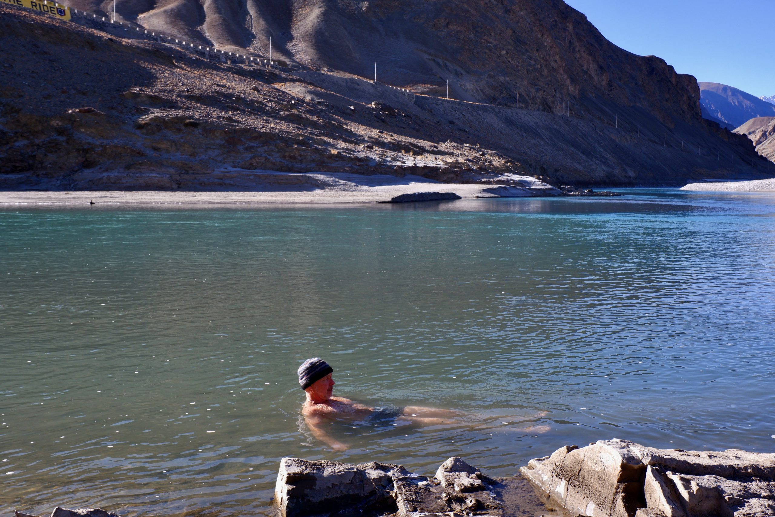 Juhu – the sun was shining from a deep blue sky, exactly as wished for and hoped! One thing that is always wonderful in winter is the color of the rivers. However, there was not as much water in them as usual. As a result, my photo collection of the confluence of the Indus and Zanskar rivers gained yet another variation (see above). We drove down, and one traveler lay down in the water..