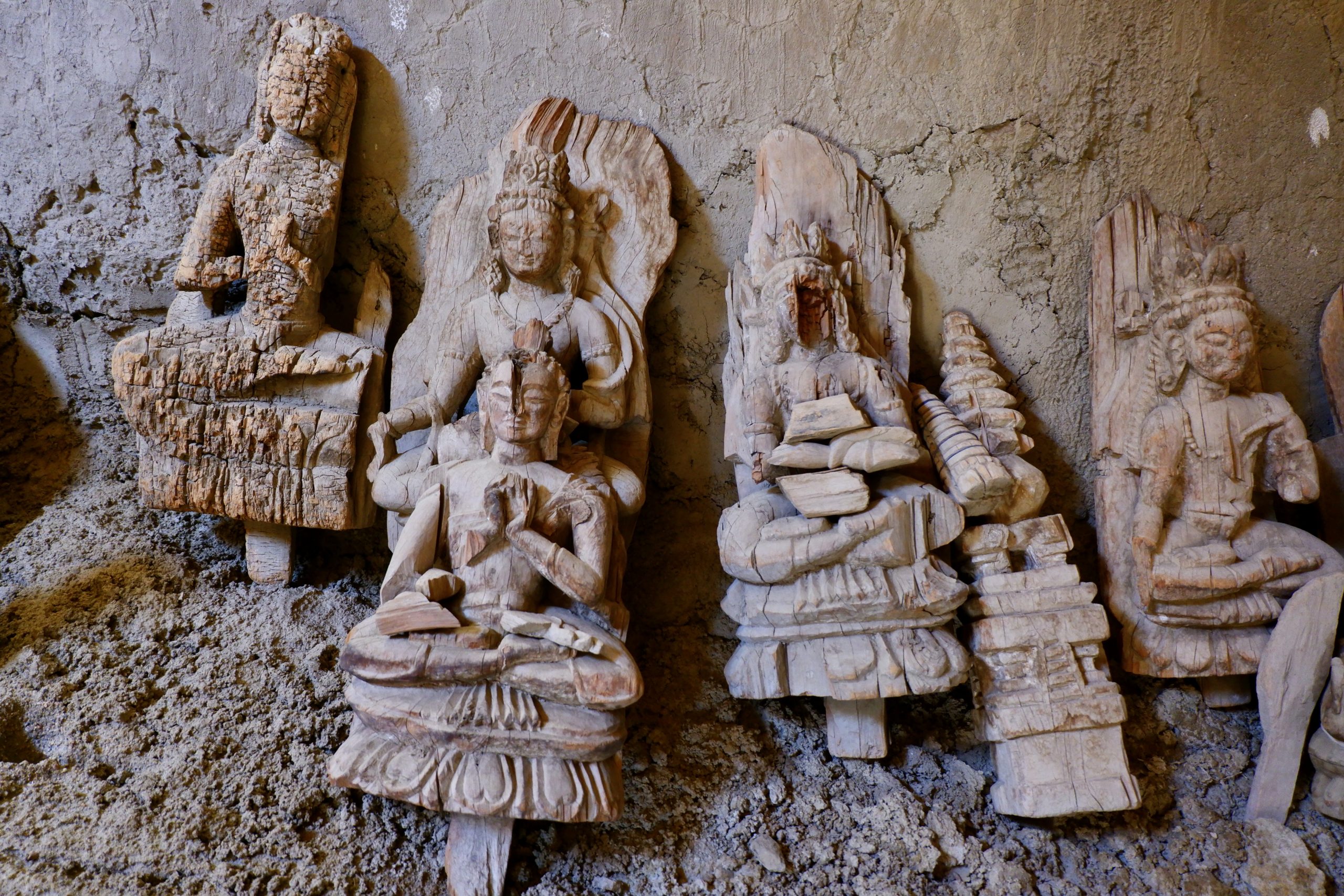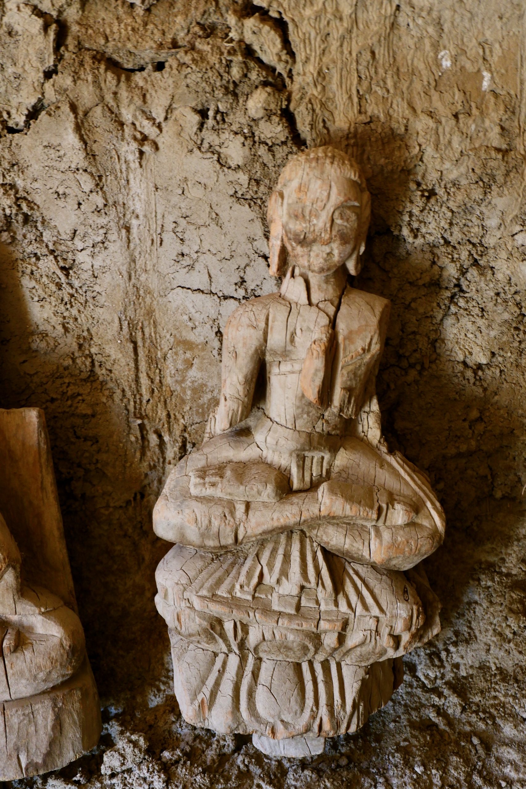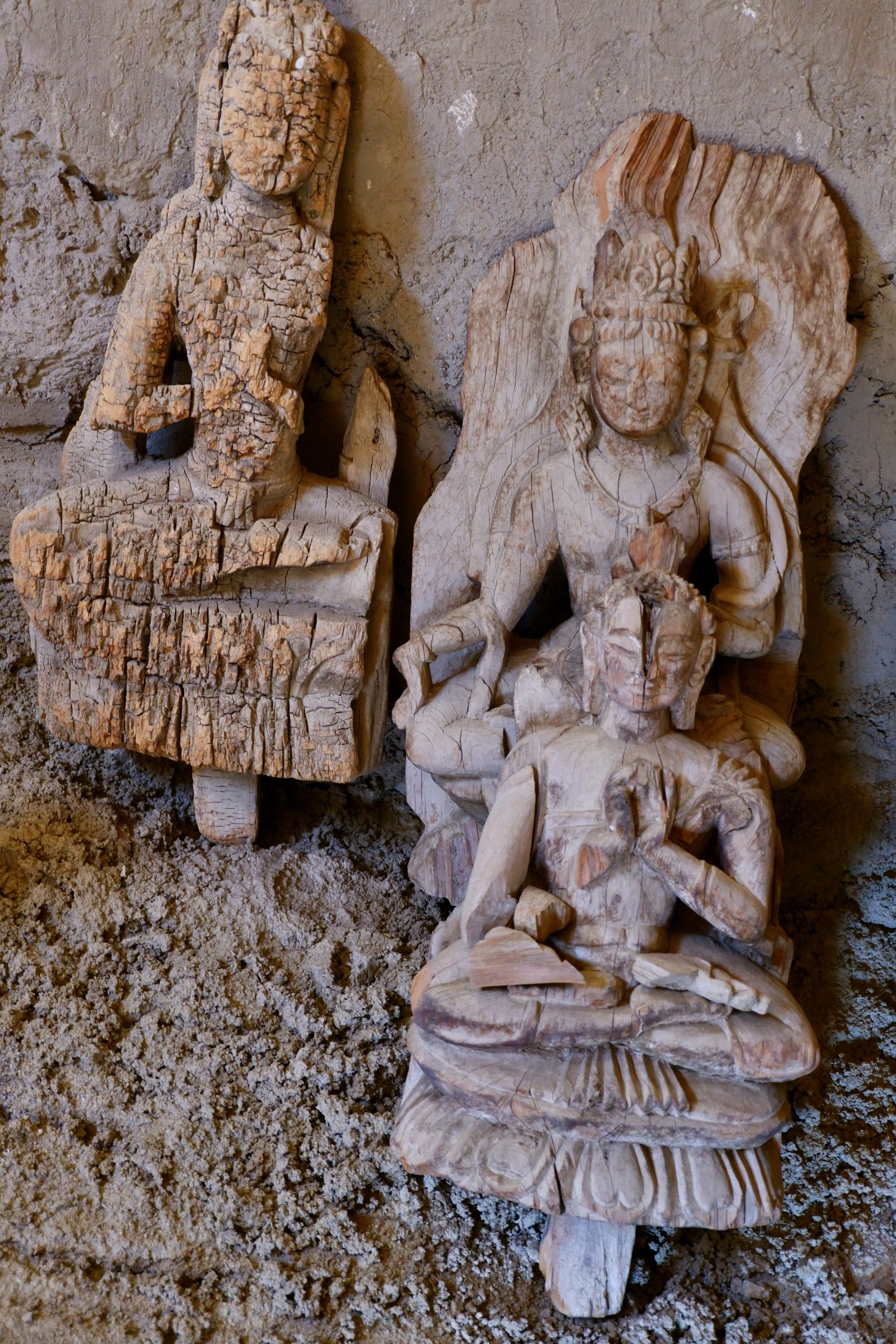 We had packed lunches with us and enjoyed them on a meadow. It was really lovely. Dolma then received the news that a snow leopard had been spotted in Saspotse – which was where we wanted to go anyway! So off we went. There were already groups waiting there with binoculars, spotting scopes, and telephoto cameras. Usually, activity only starts after 15:00, so there was plenty of time beforehand to look at the wooden Buddhas. These are located slightly above the village. The statues had been moved into another room that was drier. The wall paintings remain in place, but are of course still endangered. However, no one really knew much about their significance or origin.