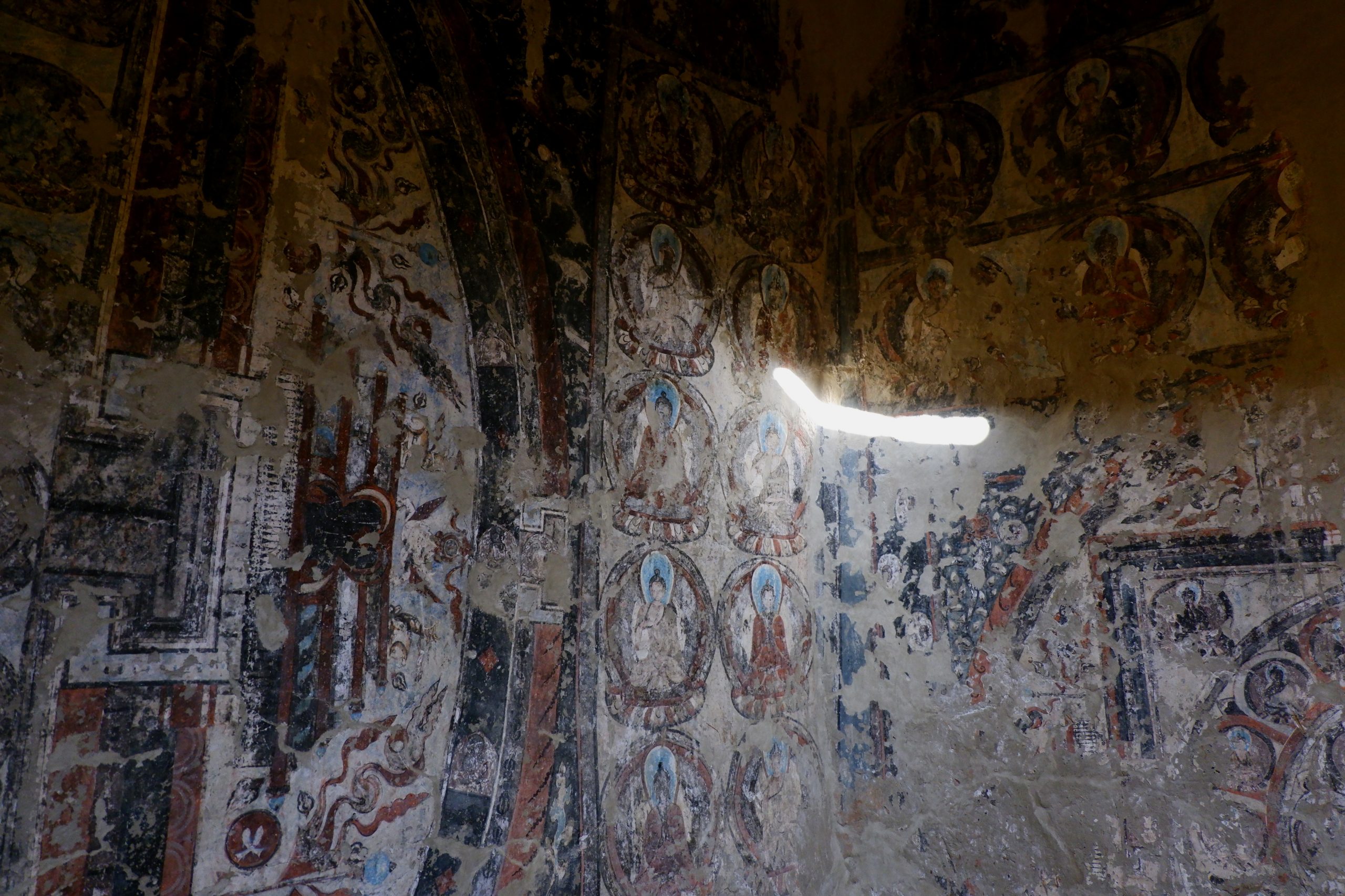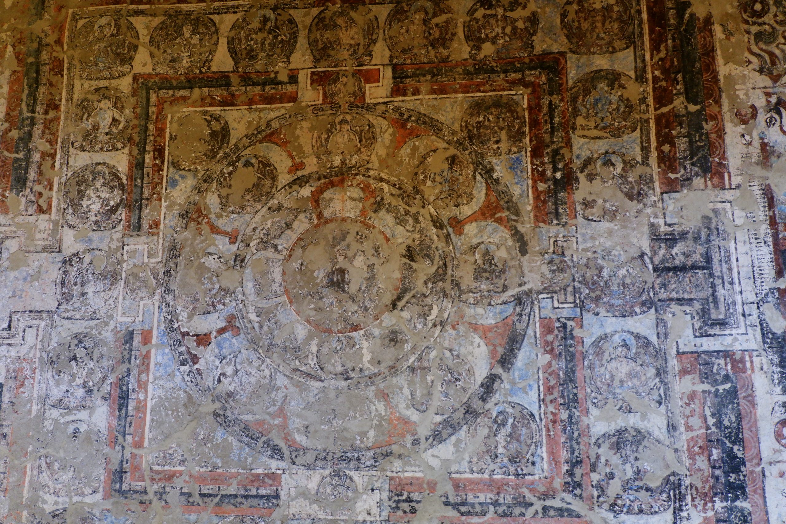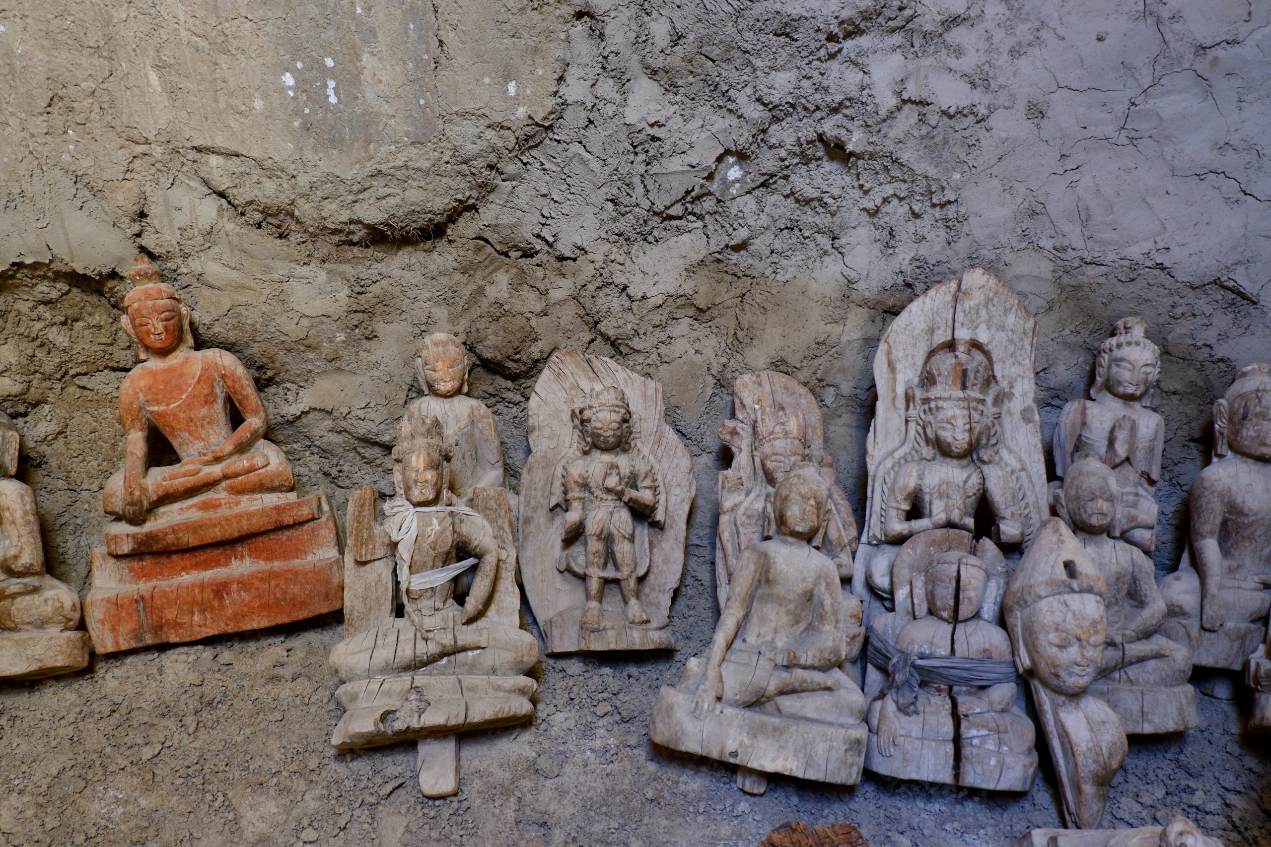 We had packed lunches with us and enjoyed them on a meadow. It was really lovely. Dolma then received the news that a snow leopard had been spotted in Saspotse – which was where we wanted to go anyway! So off we went. There were already groups waiting there with binoculars, spotting scopes, and telephoto cameras. Usually, activity only starts after 15:00, so there was plenty of time beforehand to look at the wooden Buddhas. These are located slightly above the village. The statues had been moved into another room that was drier. The wall paintings remain in place, but are of course still endangered. However, no one really knew much about their significance or origin.