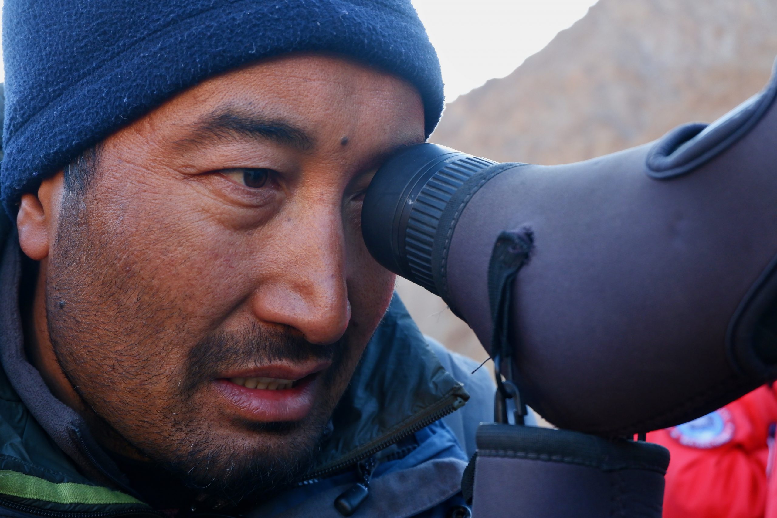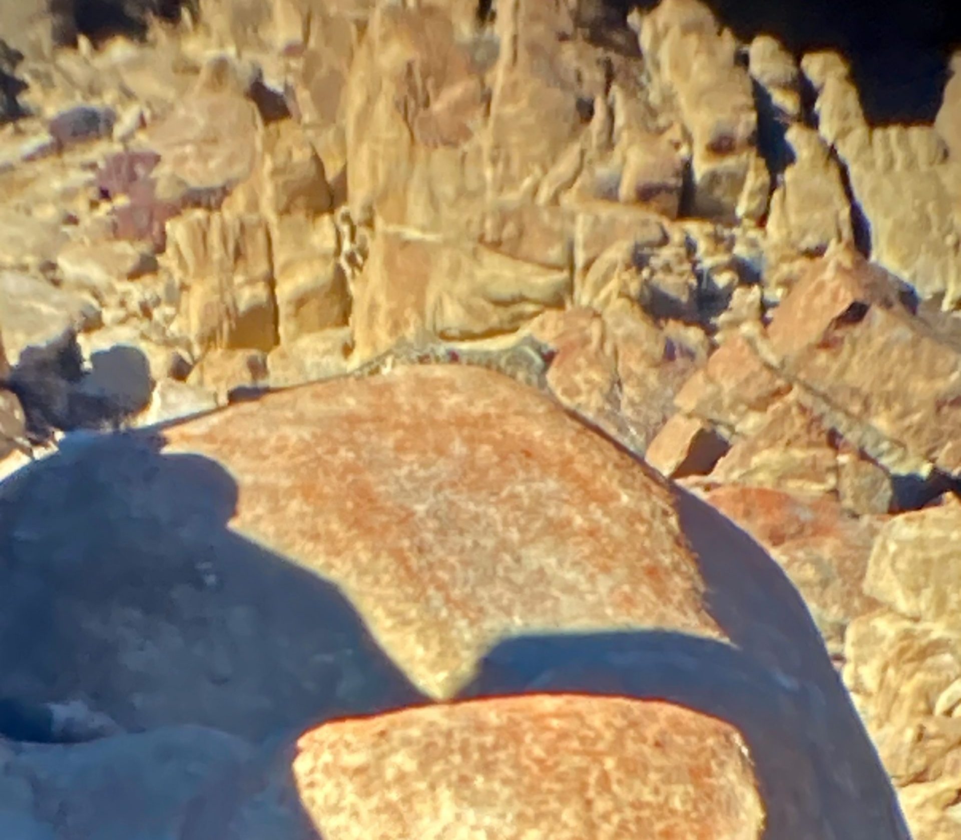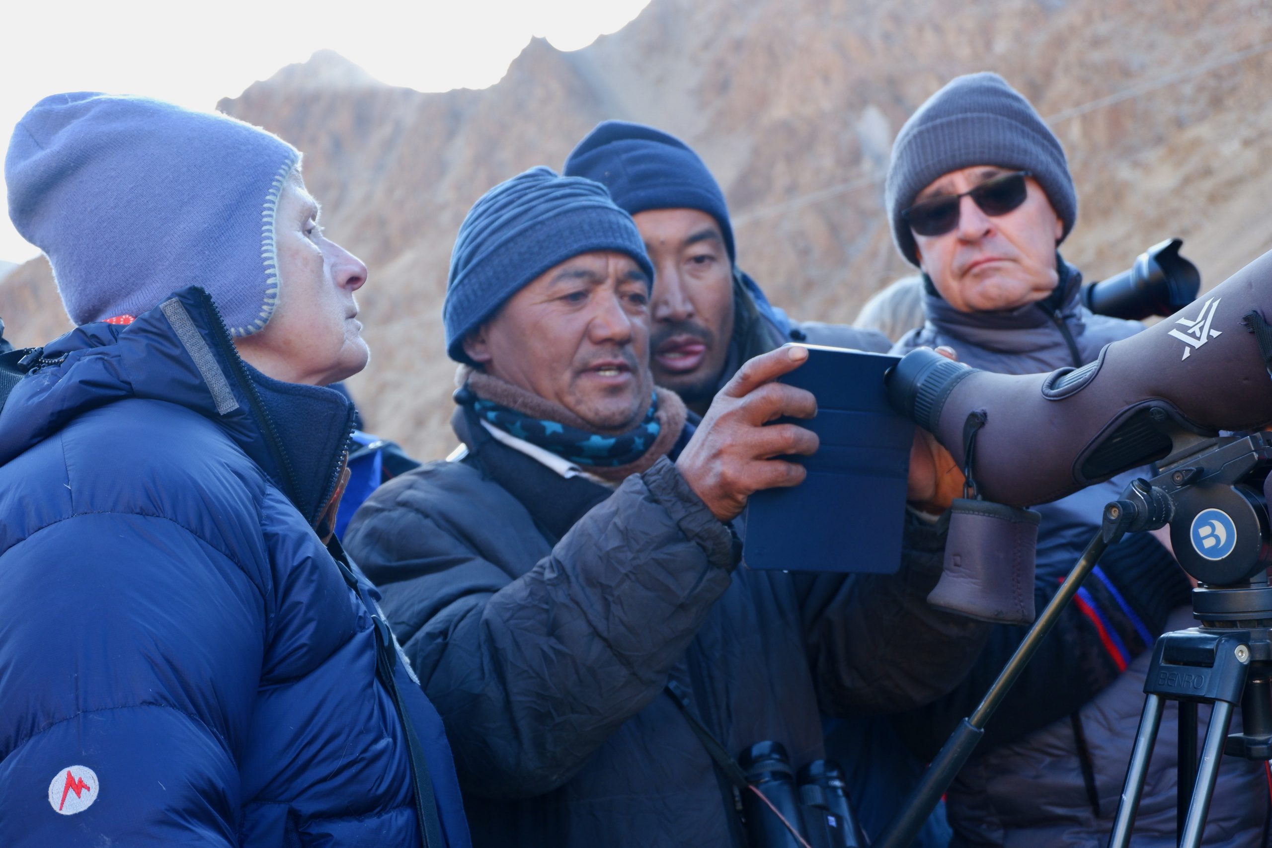 Down below, there was nothing to see at first, but then some people suddenly started cheering. The snow leopard mother was lying around, and her cubs were playfully moving about. Nothing was visible to the naked eye. Even when looking through the spotting scope I still felt rather “blind,” but in the photo taken with my phone through the scope I could finally make something out!