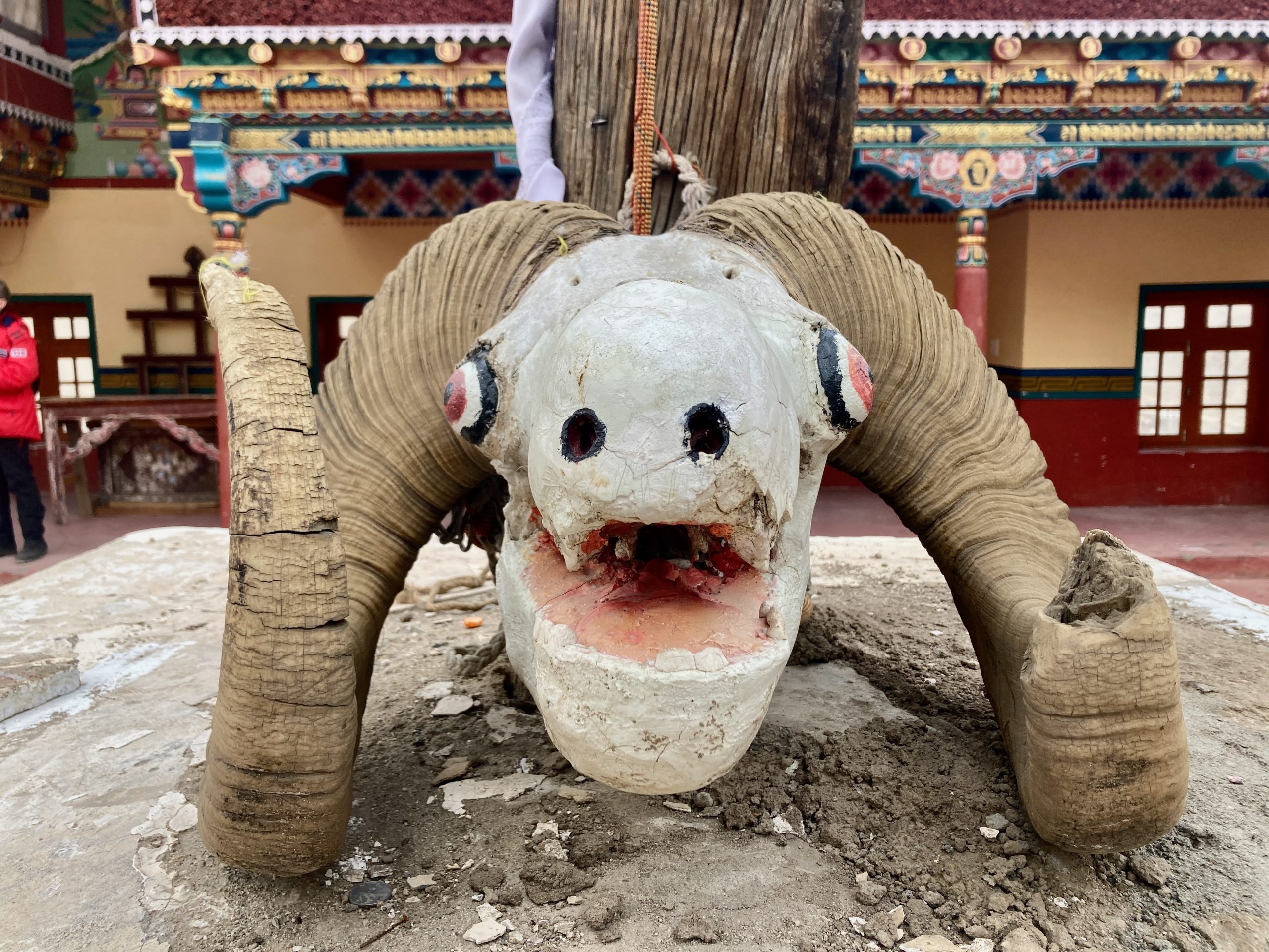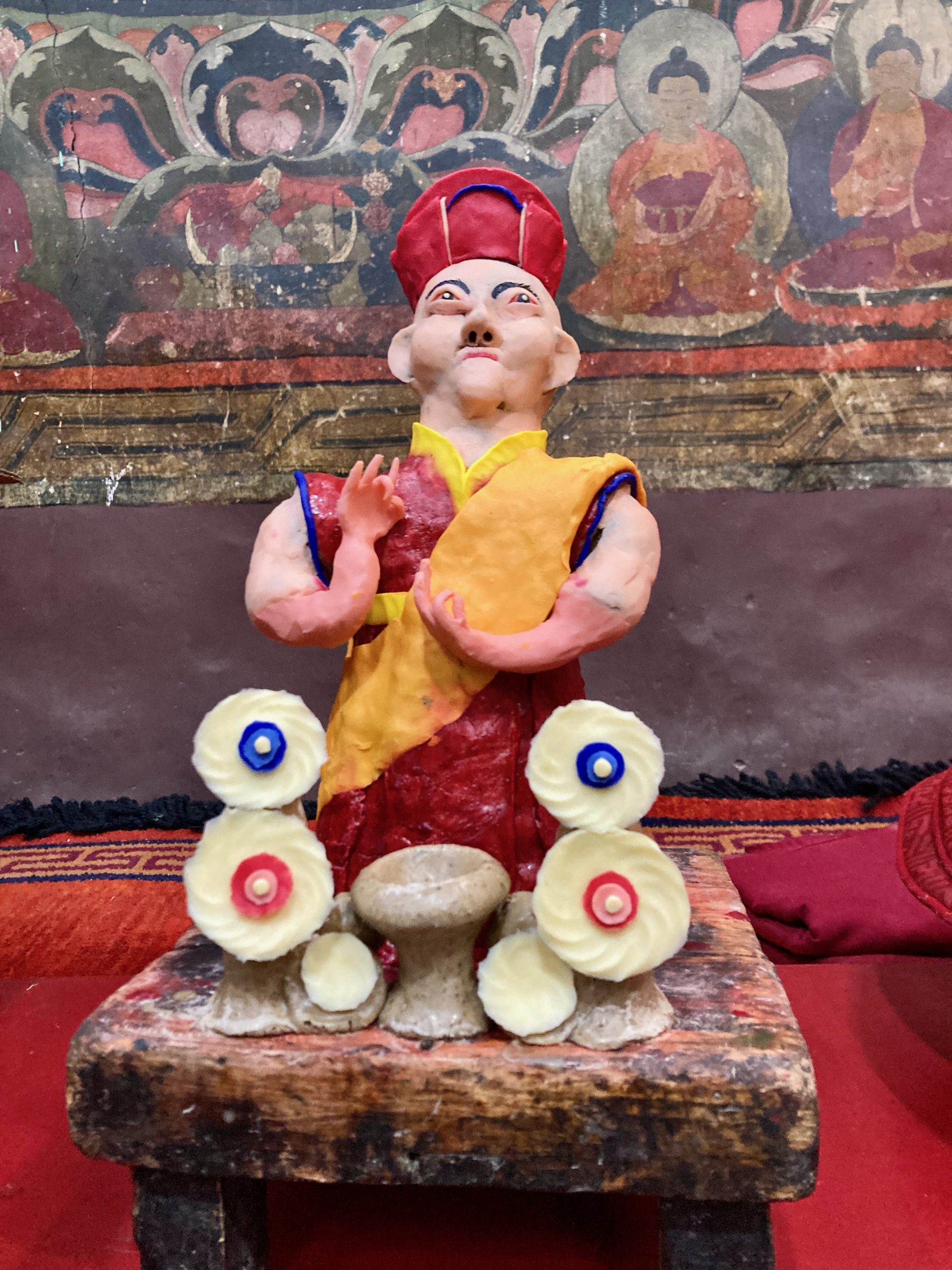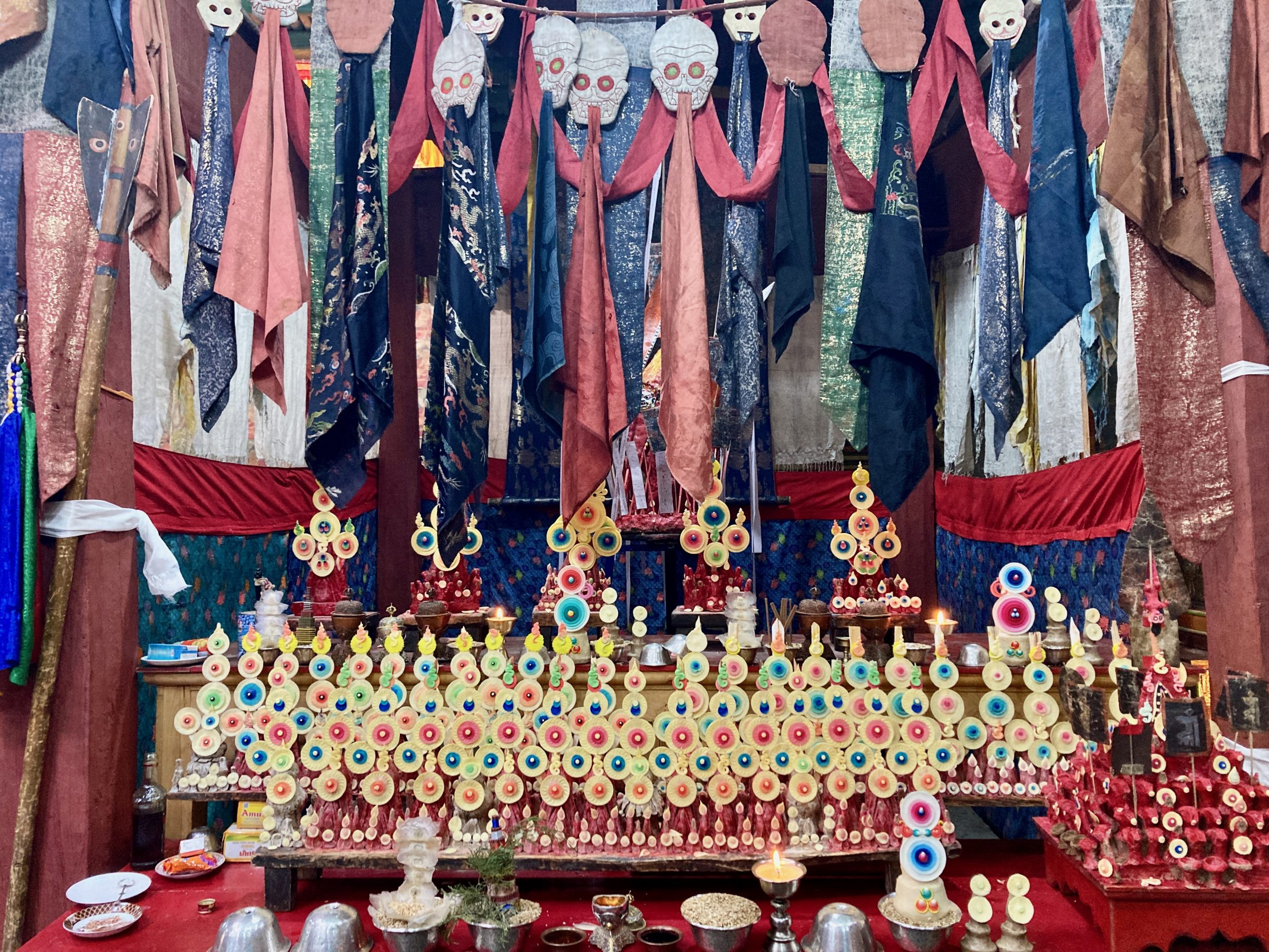 After that, the sky closed in completely again. We drove to Chemre Monastery. There were several rooms to visit, but it was very cold on the feet and I hopped around hurriedly. In the large assembly hall, stormas and other ritual objects were set up, meant to be destroyed in a ceremony on 29 December. Hooray! That meant we would get to experience something extra. To anticipate things: unfortunately, that didn’t happen. They prayed through the night and then carried out the ritual at 5:30 in the morning. That was simply too early for us.