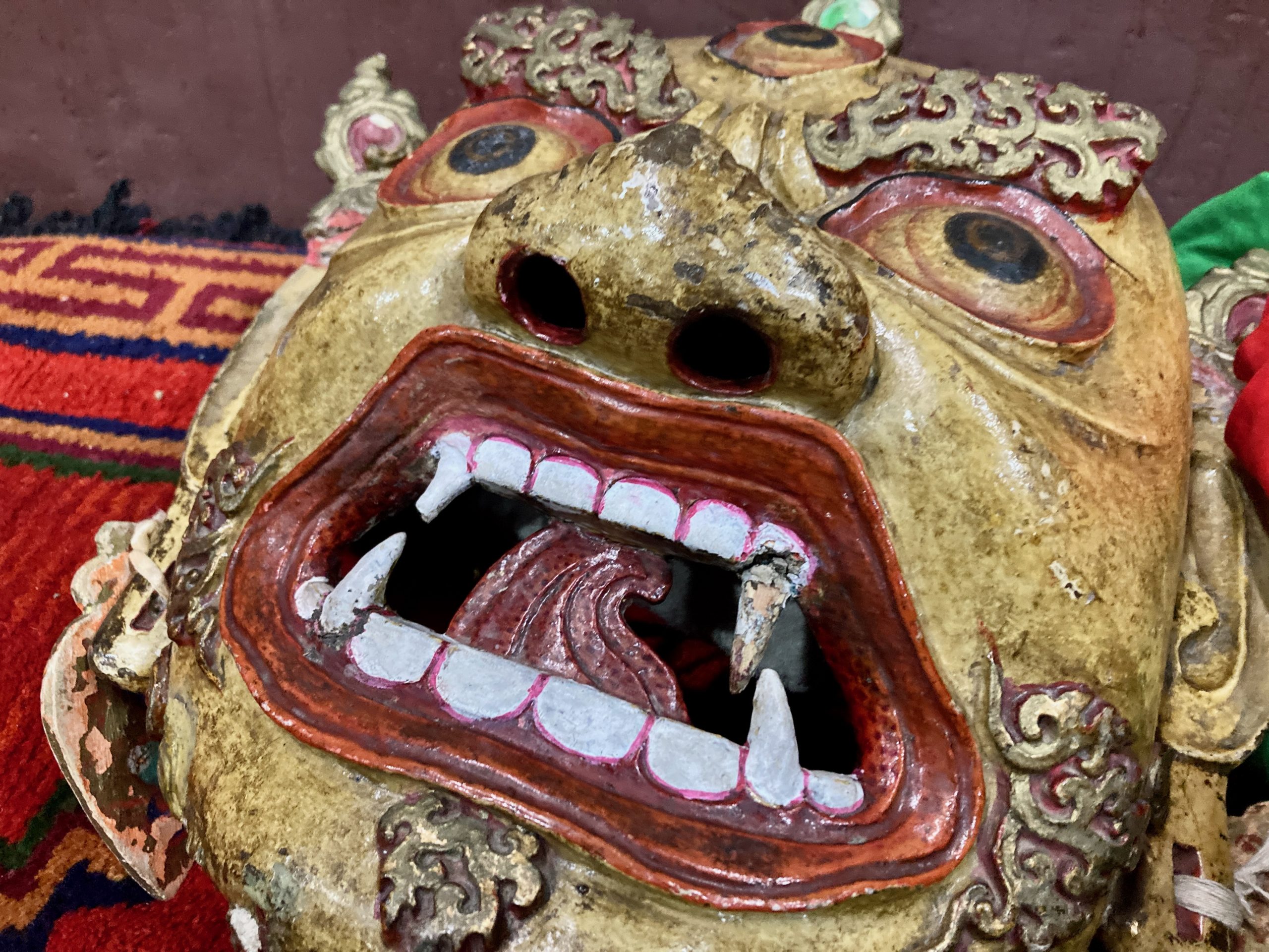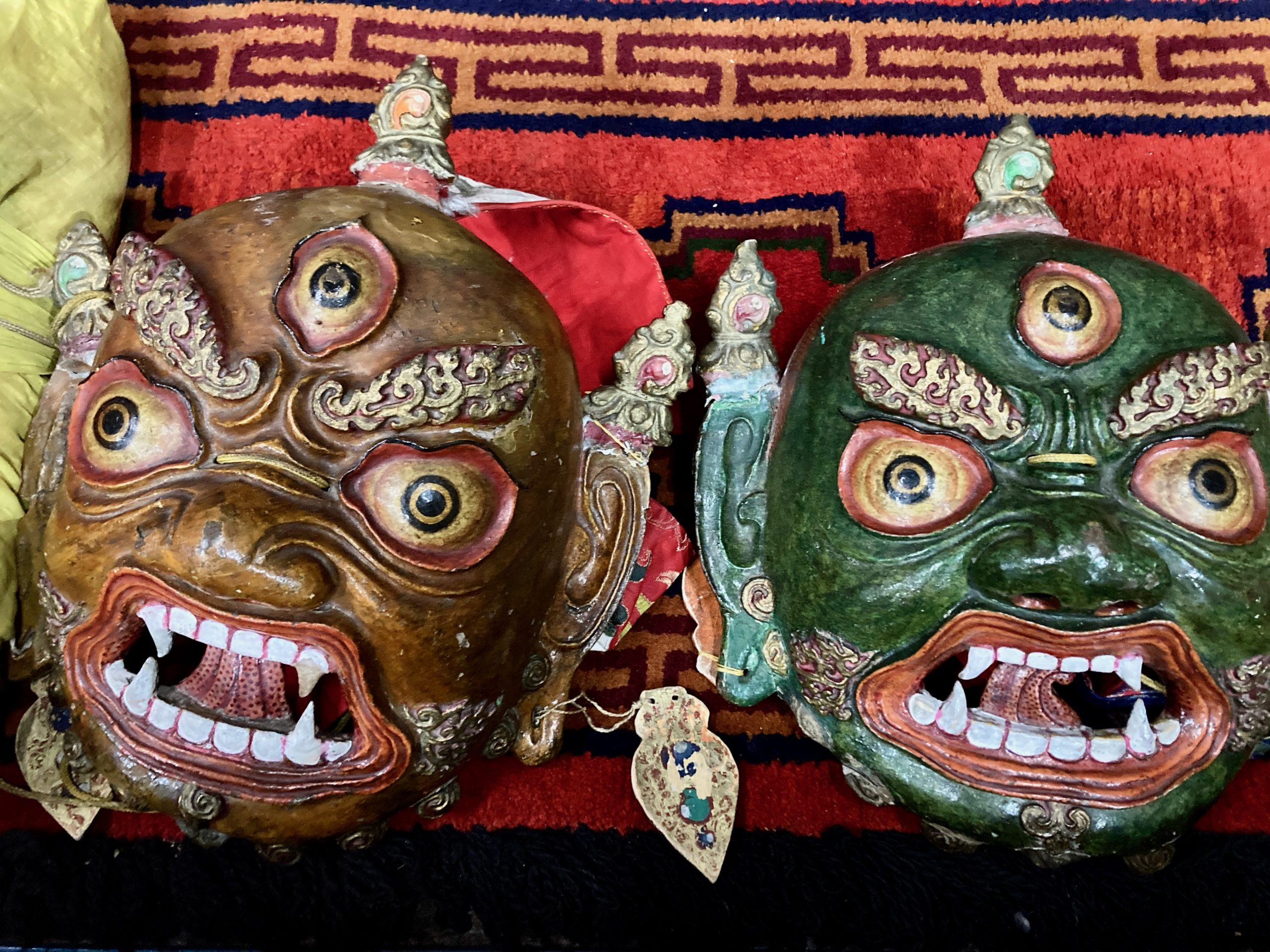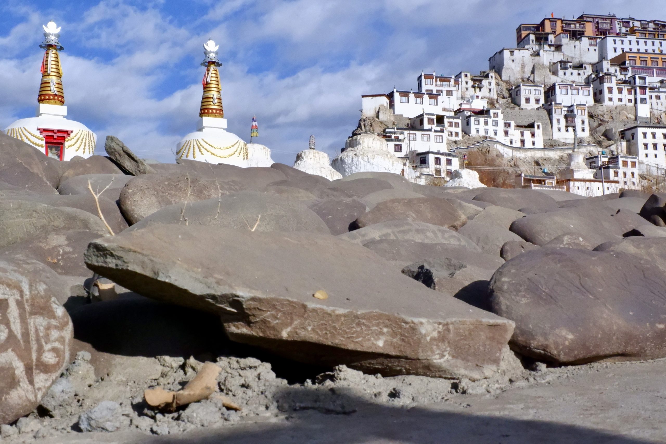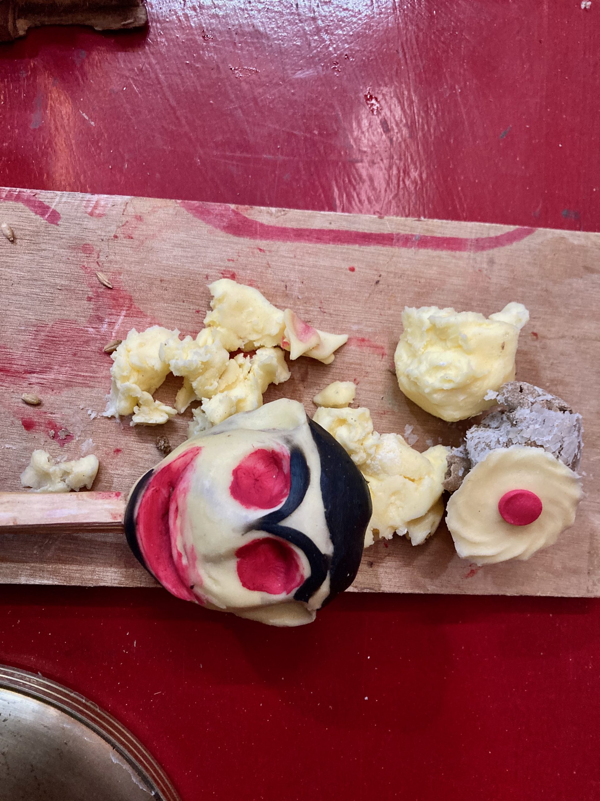 After that, the sky closed in completely again. We drove to Chemre Monastery. There were several rooms to visit, but it was very cold on the feet and I hopped around hurriedly. In the large assembly hall, stormas and other ritual objects were set up, meant to be destroyed in a ceremony on 29 December. Hooray! That meant we would get to experience something extra. To anticipate things: unfortunately, that didn’t happen. They prayed through the night and then carried out the ritual at 5:30 in the morning. That was simply too early for us.