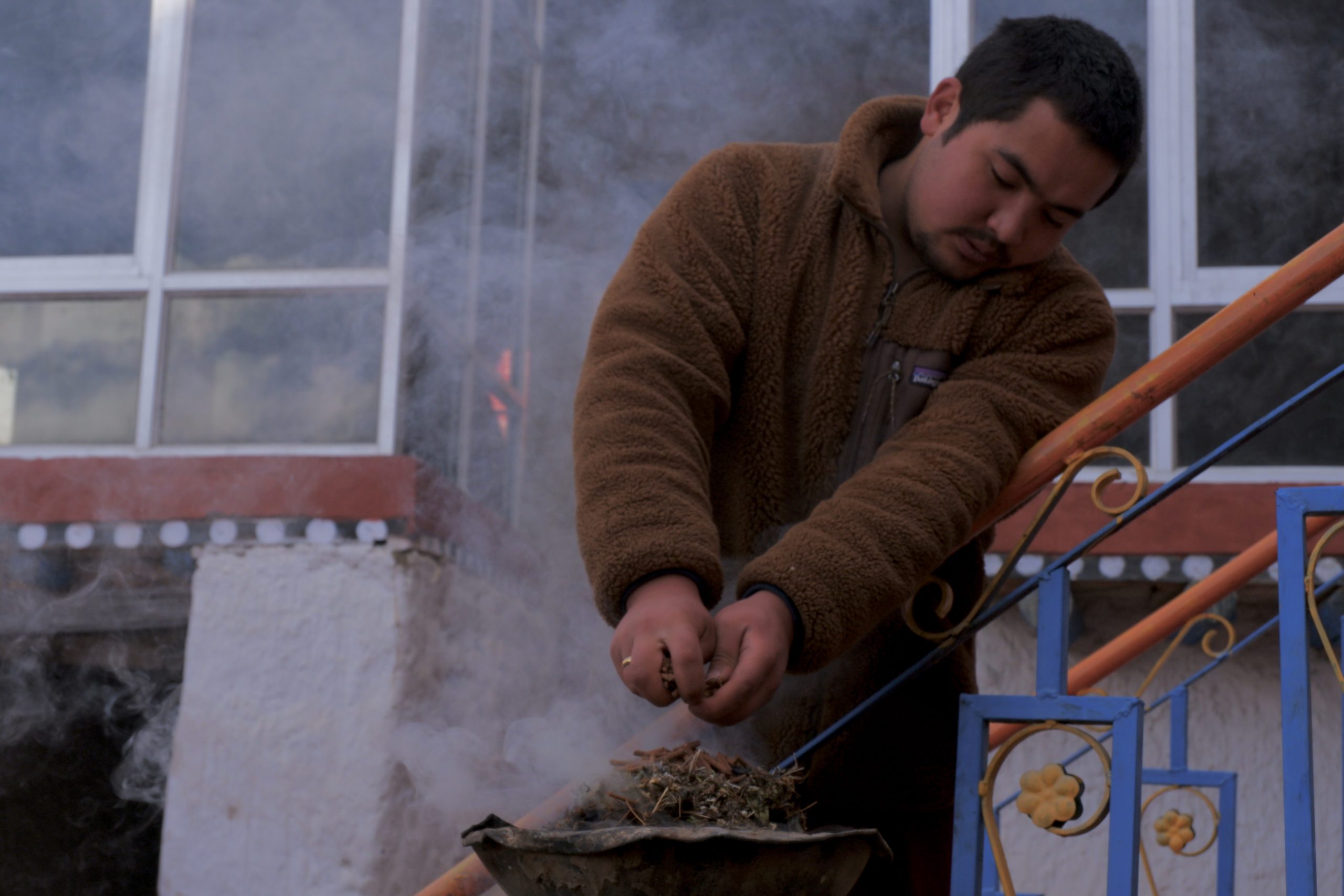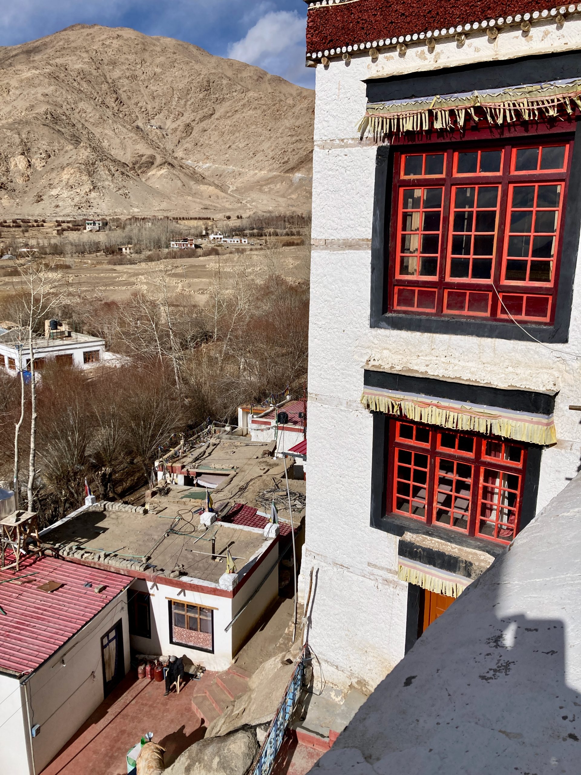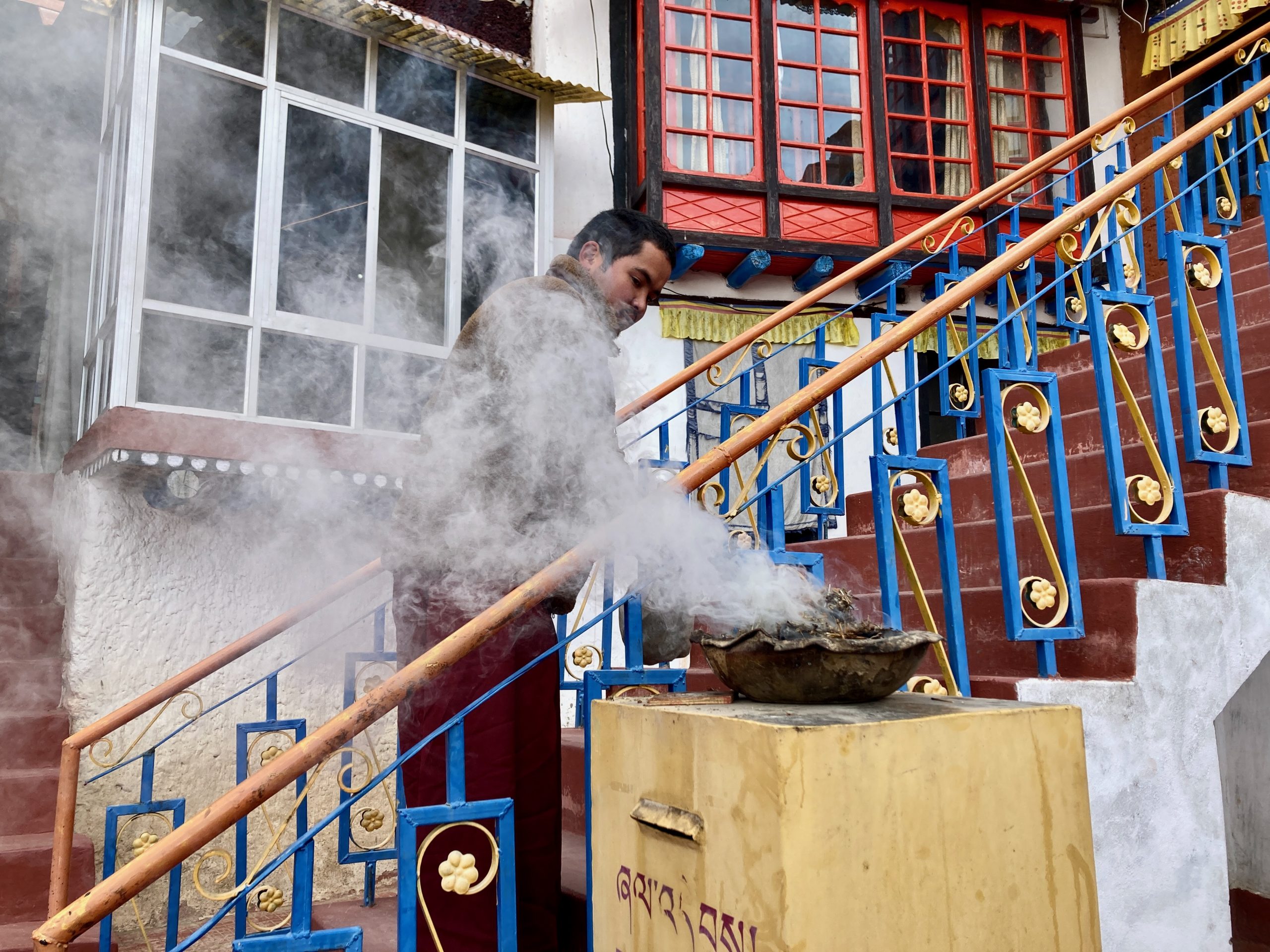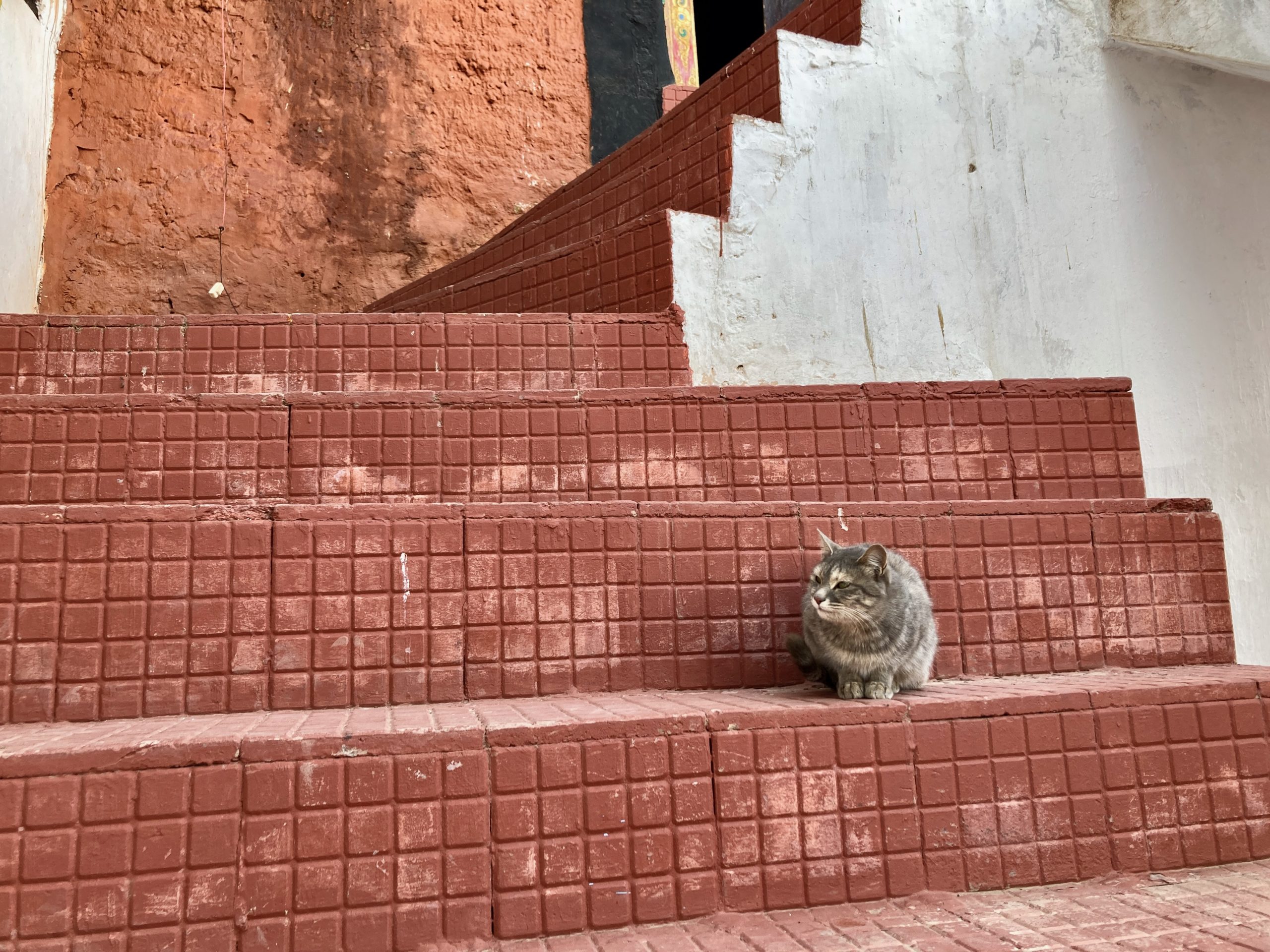 In Sakti there is Takthok Monastery, with a meditation cave of Padmasambhava. A monk was sitting there performing a long and interesting puja, probably specifically for Losar. Photography was not allowed inside, but it was permitted in the courtyard, where we could photograph the monk and a cat. The monk in the courtyard assisted the meditation monk by bringing him various ritual items. The cat was running around and back and forth to her kittens, which were behind a door.