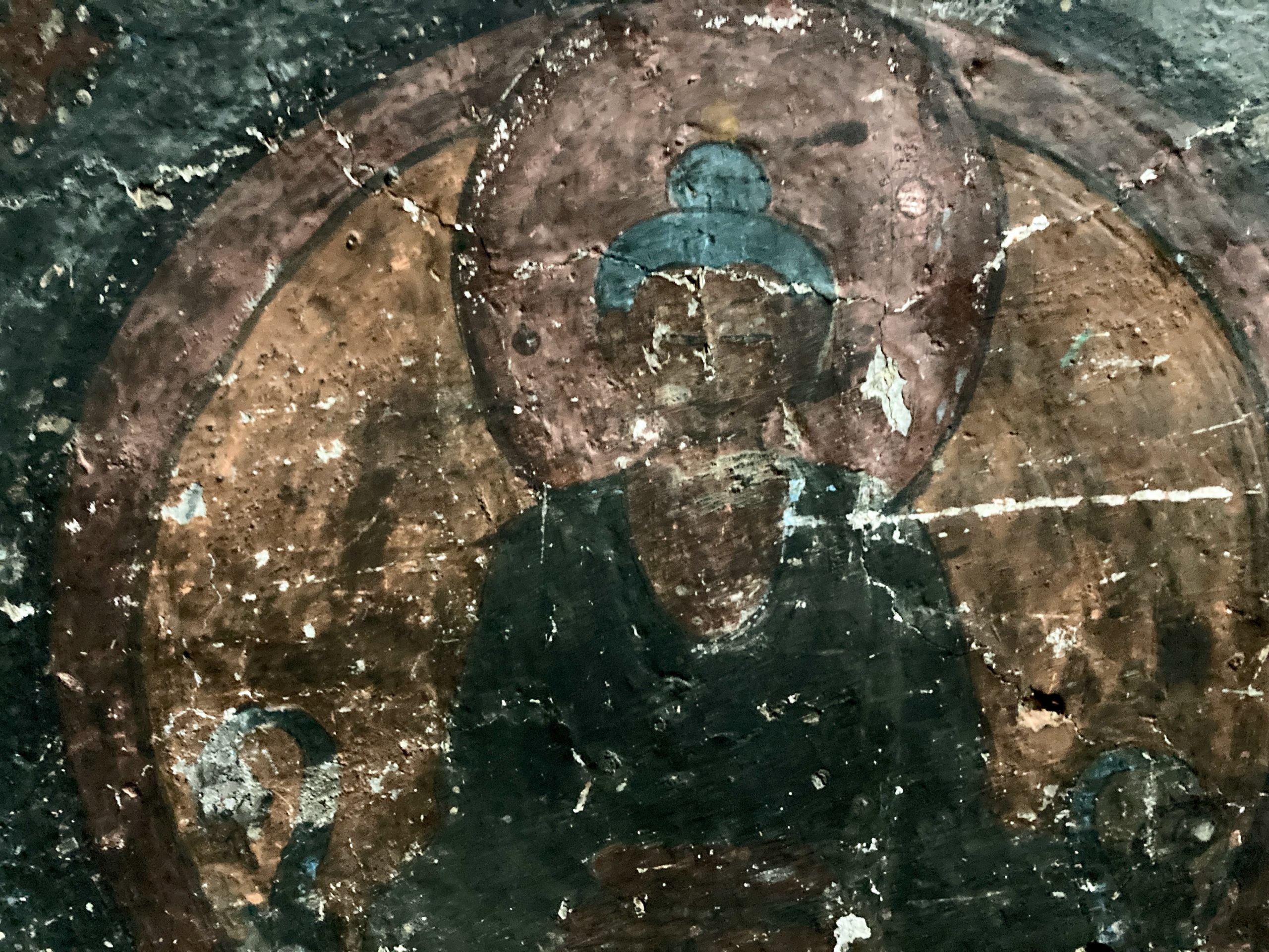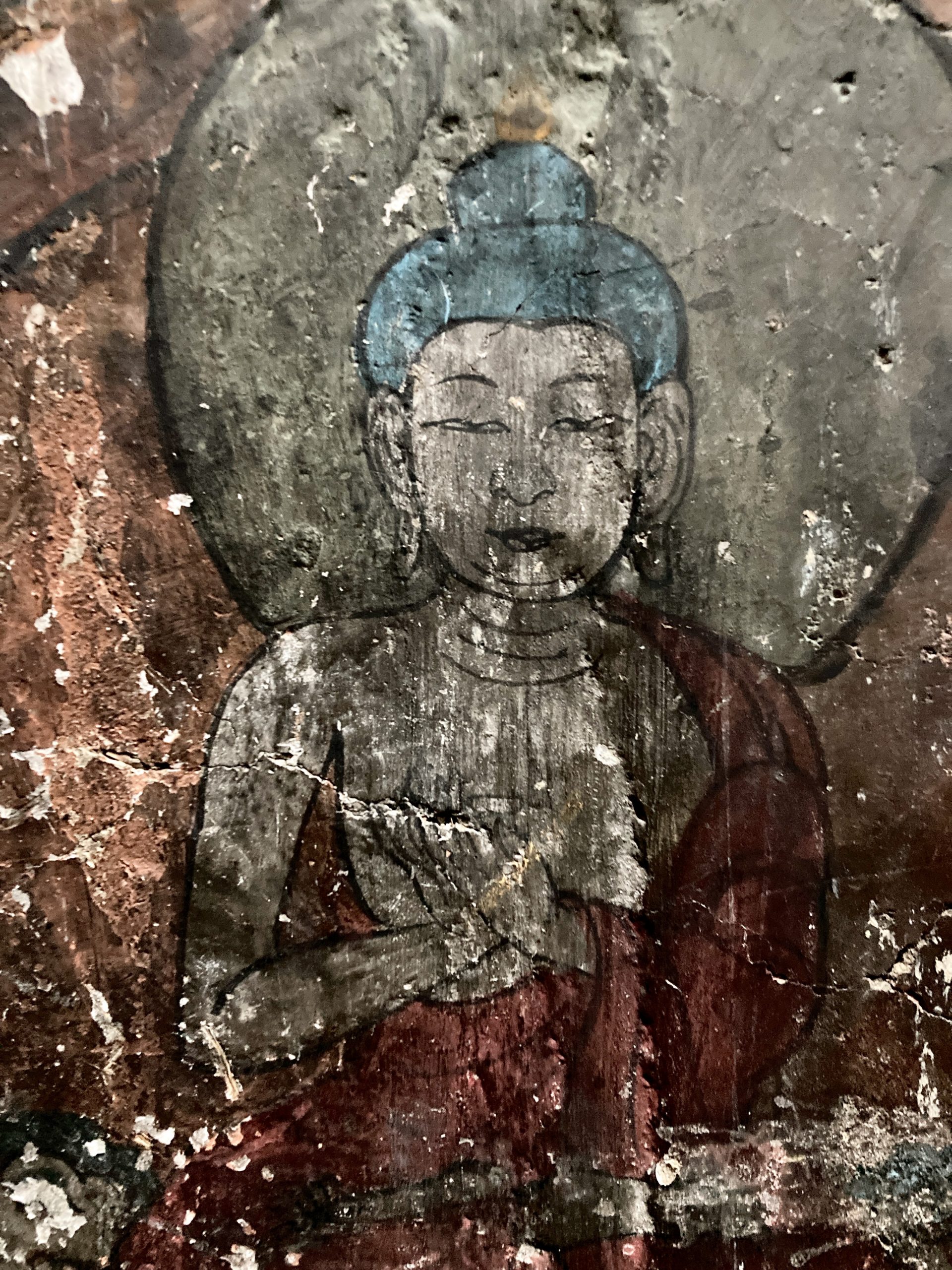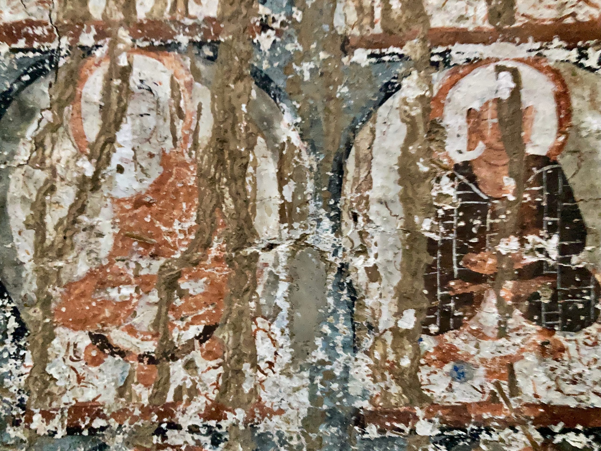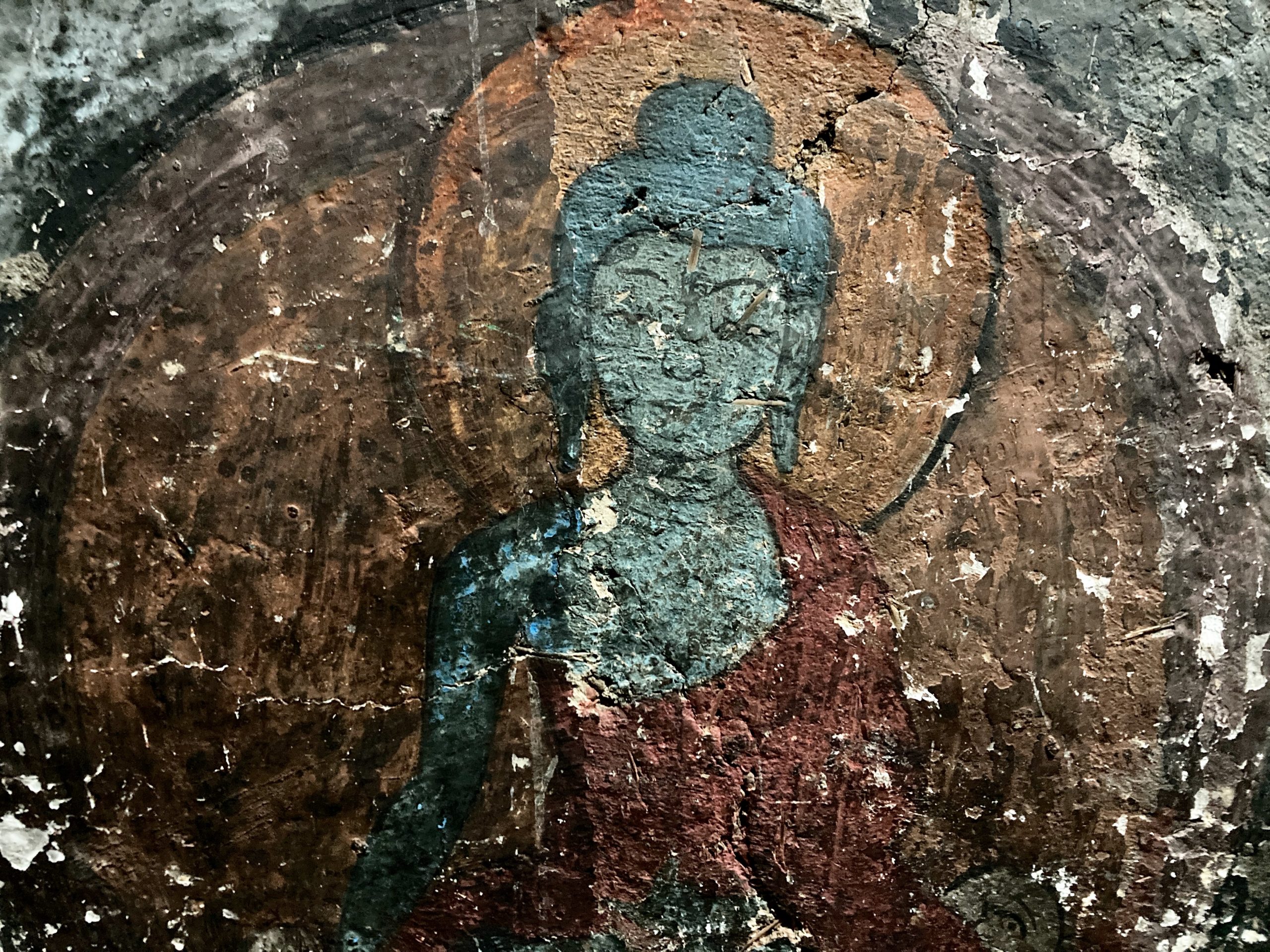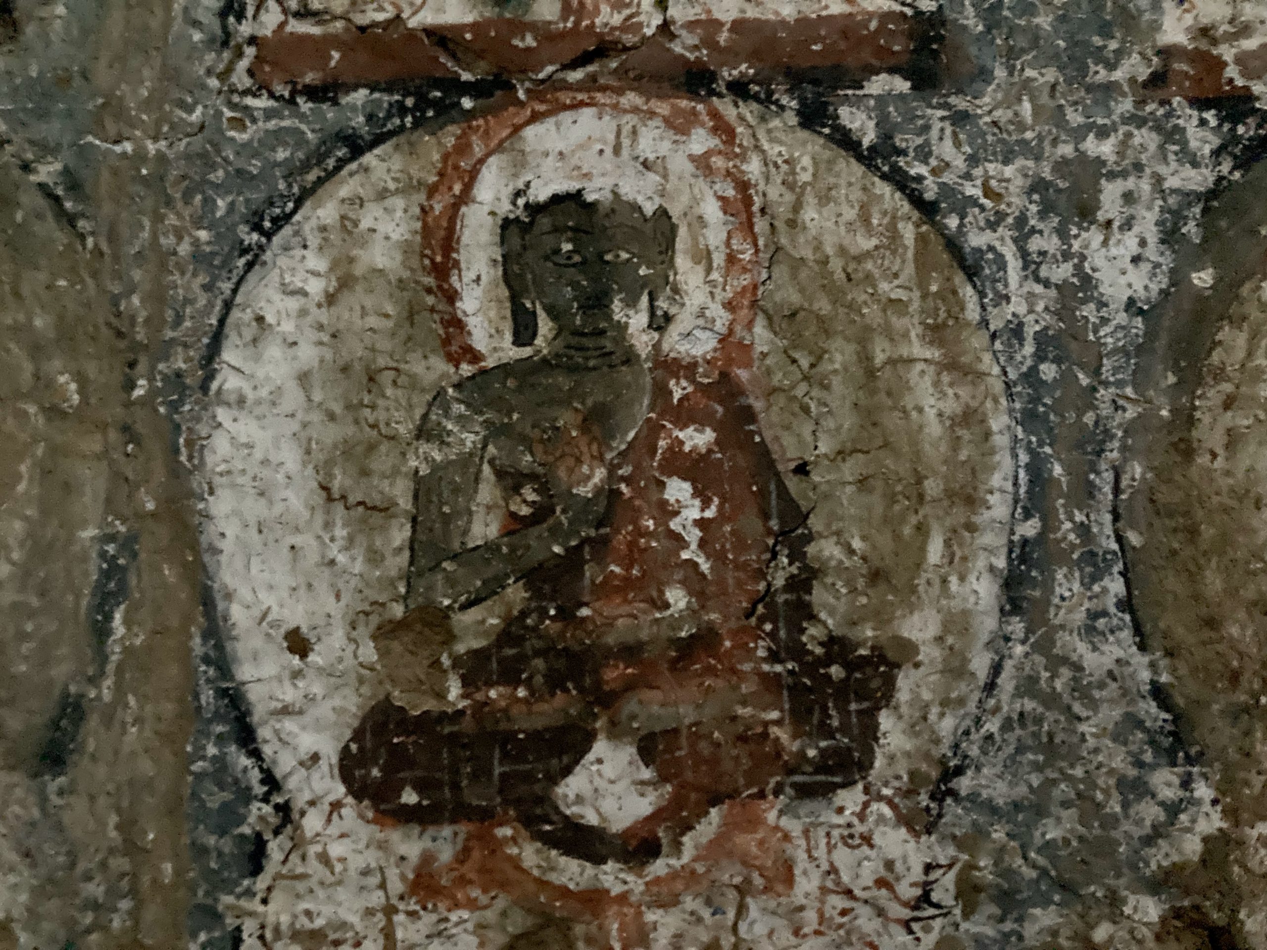 The first ancient wall paintings we set out to see were in the Saspol caves. Unfortunately, only one cave was accessible; at the others, the entrances had not been prepared. They date from the 14th/15th century and were partially restored after severe damage (Prince Claus of the Netherlands had also donated funds for this).