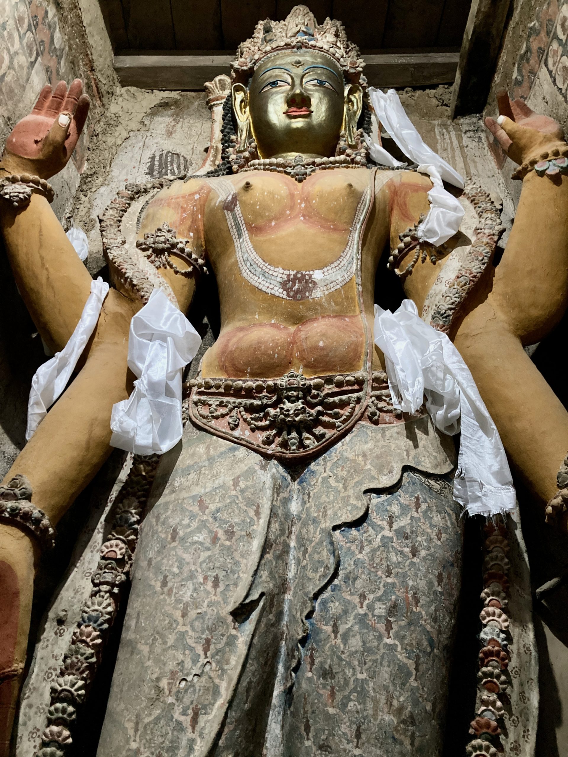 Alchi is part of the UNESCO World Heritage Site, though not on its own. It is included together with the monastic complexes of Mangyu and Sumda Chun, dating from the 10th/11th century. At that time, the translator Lotsava Rinchen Zangpo was traveling throughout the Himalayan region, translating a great many texts from Sanskrit into Tibetan and founding more than 100 monasteries. He came to Ladakh with several students from the Kashmir region, that is, from the west. These students created many of the wall paintings in the monasteries, some of which are still remarkably well preserved or have been restored. Alchi has the most magnificent collection of them.