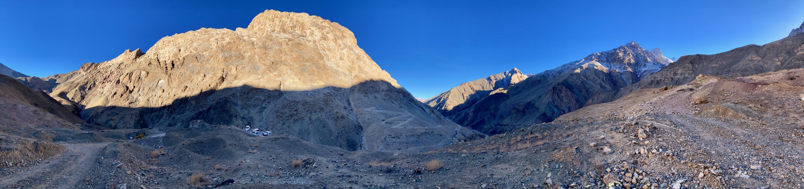 Another snow leopard had been spotted again – this time above Mangyu! So we hurried over. Unfortunately, we were out of luck with the sighting. The snow leopard had apparently made a kill and was lying somewhere out of sight, where it couldn’t be seen. In any case, everything was about 3 km away as the crow flies, high up in the mountains, and would have appeared very small even through a spotting scope. But the same people as in Saspotse were there again, so there was a happy reunion.