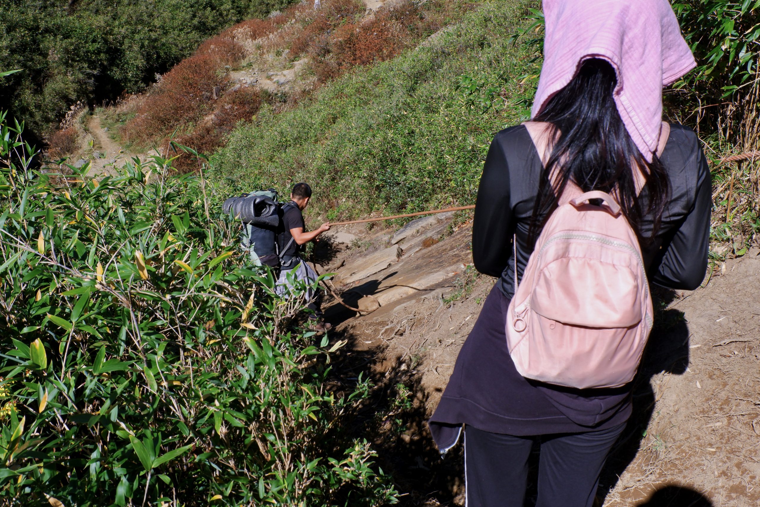 Then we reached the upper parking area and the trek began. The driver came along too. The only item he carried with him was a huge knife…..