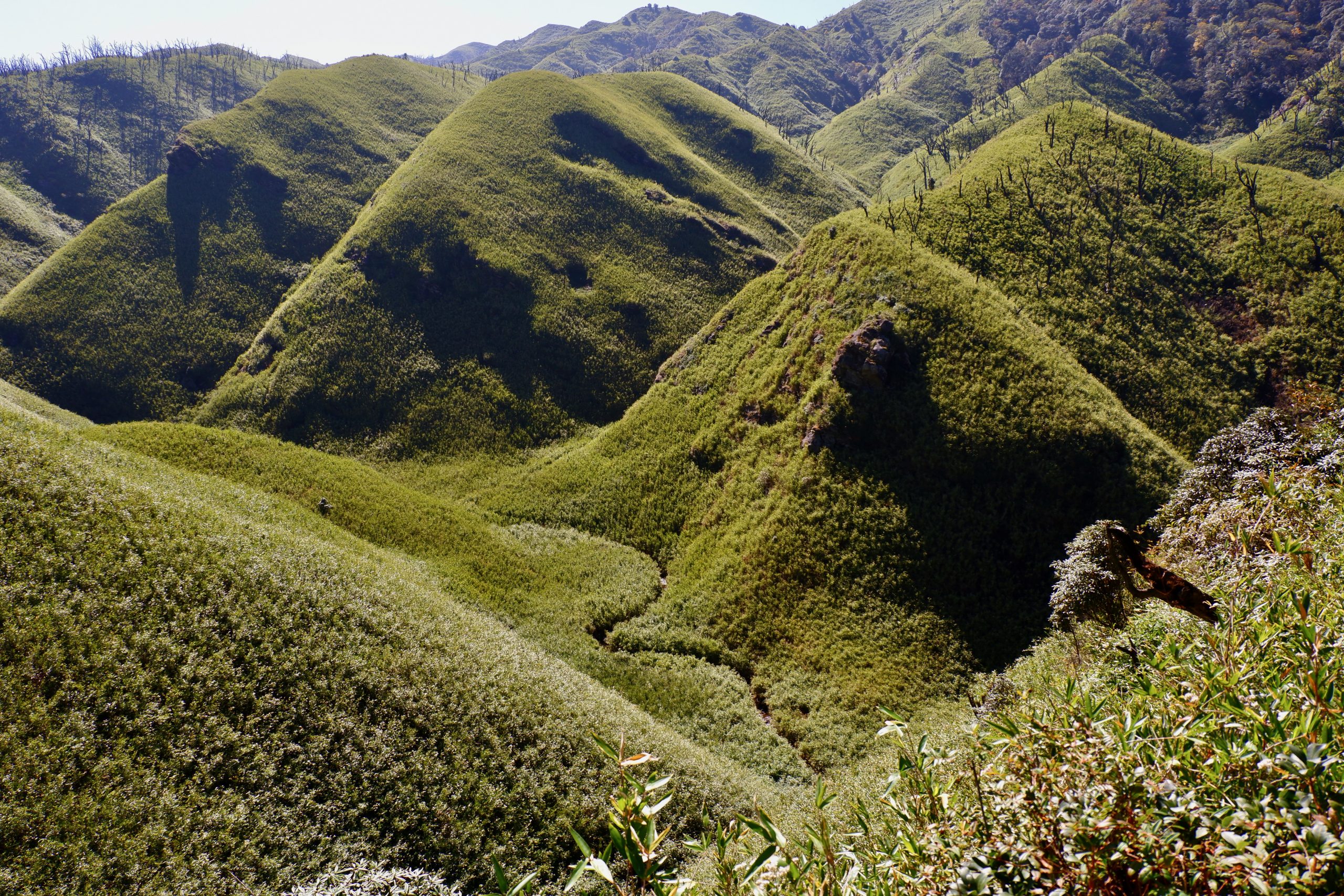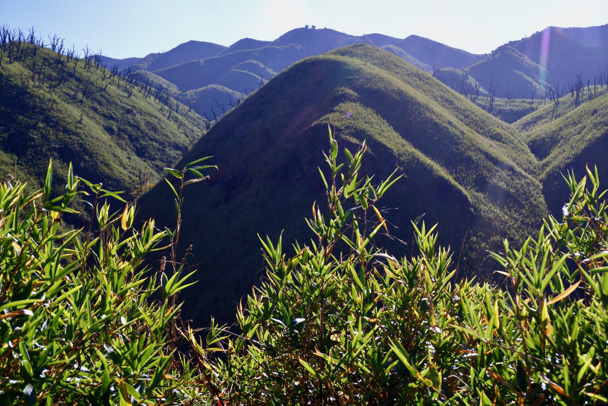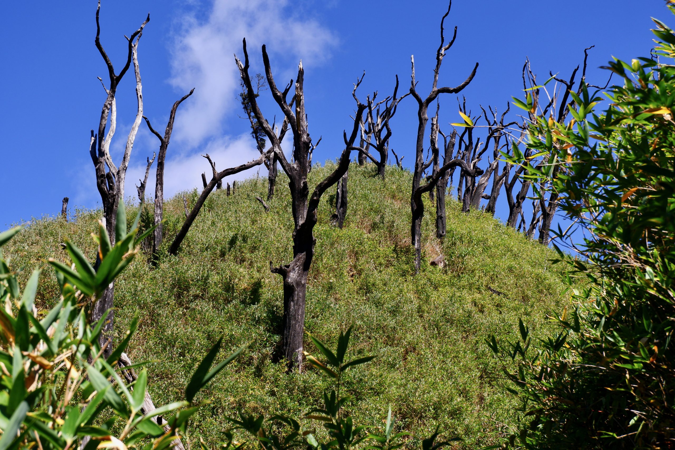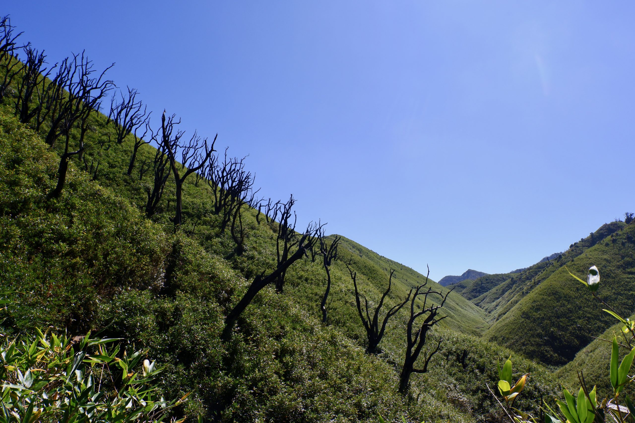 After that, the trail went steeply downhill for a bit and then continued along the mountainside at the same elevation. I had never seen a landscape like this before. We walked through very tall bamboo, lower shrubs — and then there were all these massively charred tree trunks. In 2020/21, a fire had swept through here and it took ten days to extinguish it. Impressive how quickly the vegetation has grown back. But also surprising: I didn’t hear a single bird or see any animal. Not even lizards or anything like that.