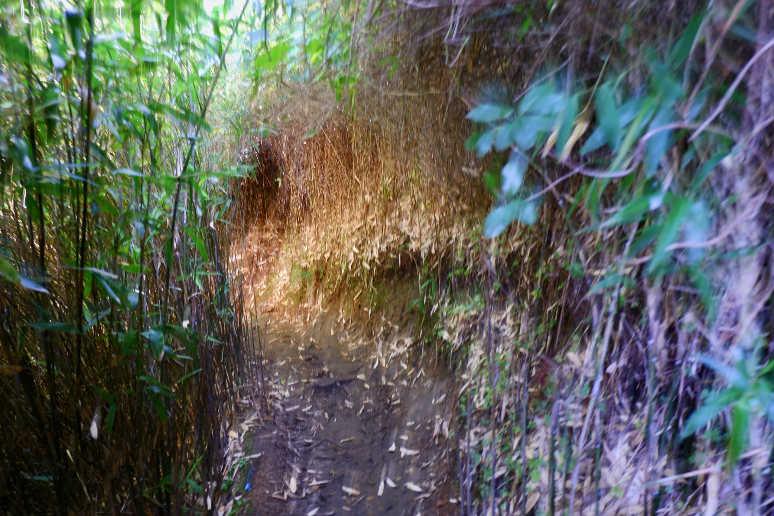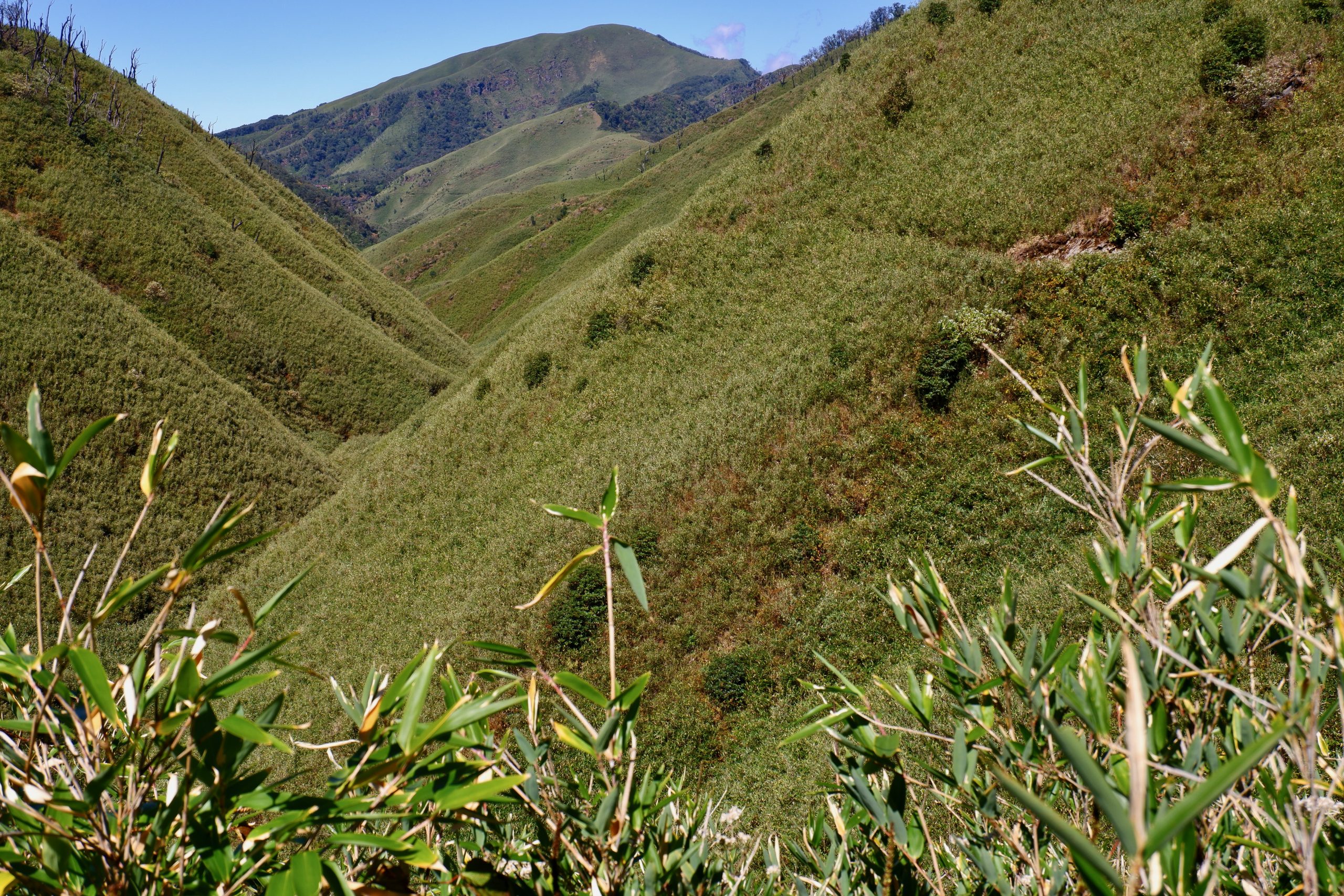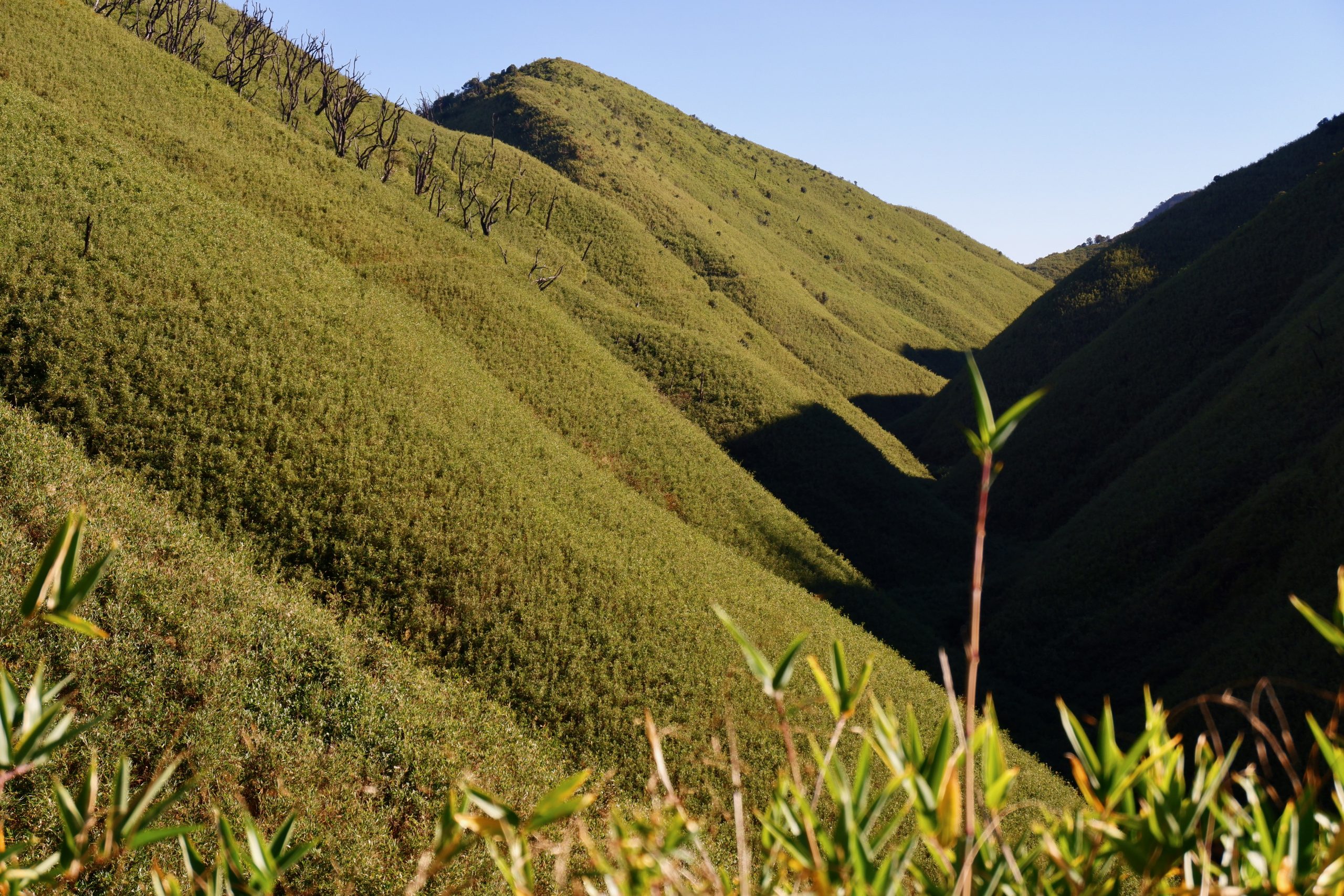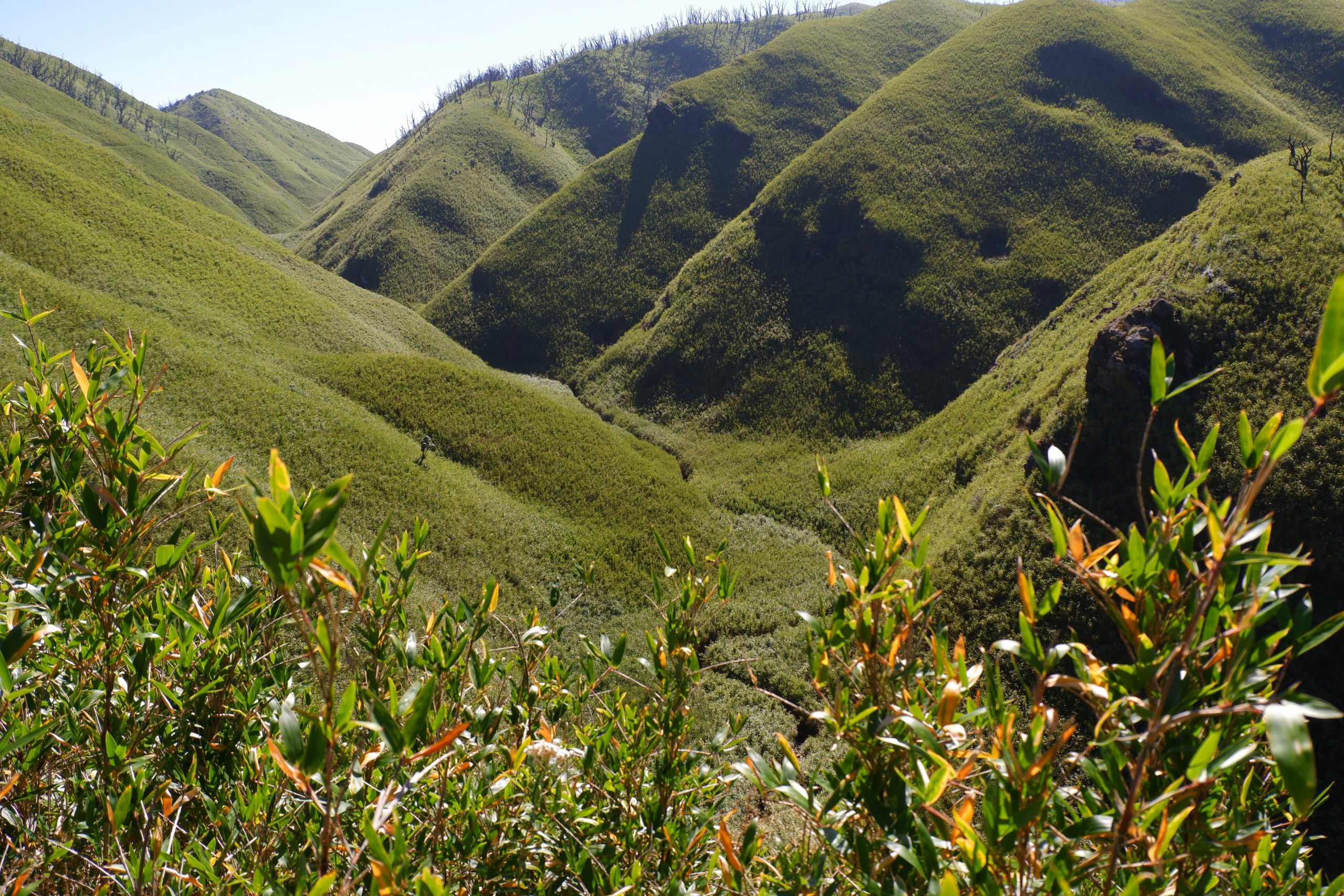 After that, the trail went steeply downhill for a bit and then continued along the mountainside at the same elevation. I had never seen a landscape like this before. We walked through very tall bamboo, lower shrubs — and then there were all these massively charred tree trunks. In 2020/21, a fire had swept through here and it took ten days to extinguish it. Impressive how quickly the vegetation has grown back. But also surprising: I didn’t hear a single bird or see any animal. Not even lizards or anything like that.
