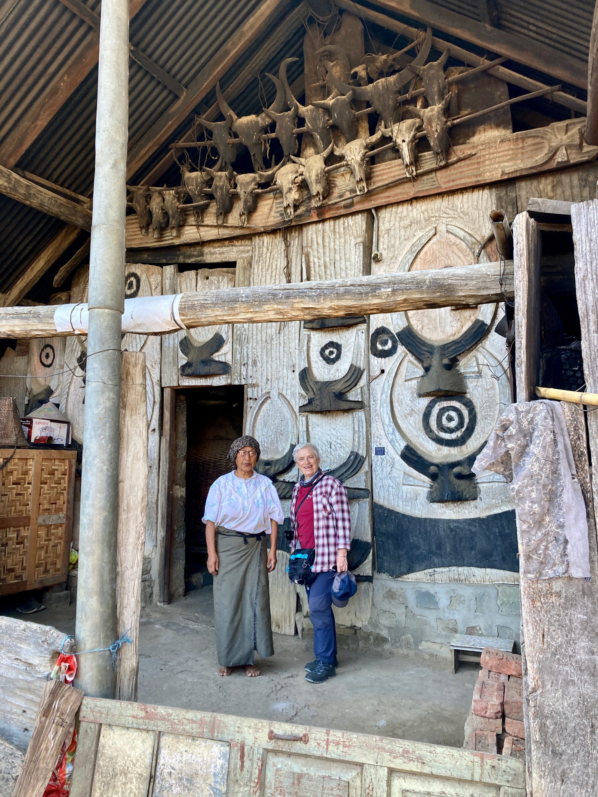 Then we looked at two old traditional houses from the outside, and she explained a lot to me. The whole village community helps with the construction. Afterwards, depending on a family’s wealth, they host celebrations. The richer someone is, the more mithuns (a local type of bovine) are sacrificed — and the skulls can then be hung above the entrance as a sign of status. To the right of the entrance there’s a small hut where the mithun is slaughtered in a special way, from above. The decorations — the symbolic mithun skulls, the sun and moon for faith, and the breasts for fertility — all have meaning. And then there are pots hanging there too. I can’t remember what occasion they were connected to, but after that event they must never be washed again. Asi once accidentally cleaned them — and got scolded quite a bit for it.